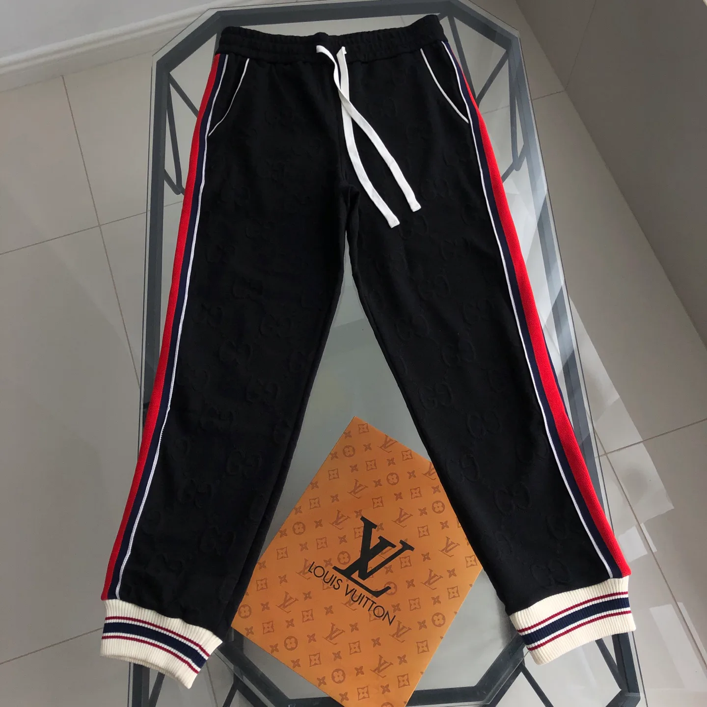 Брюки женские GUCCI — черные спортивные штаны из хлопчатобумажной ткани по индивидуальному заказу с двусторонней вышивкой на импортной машинке и индивидуальной окраской.