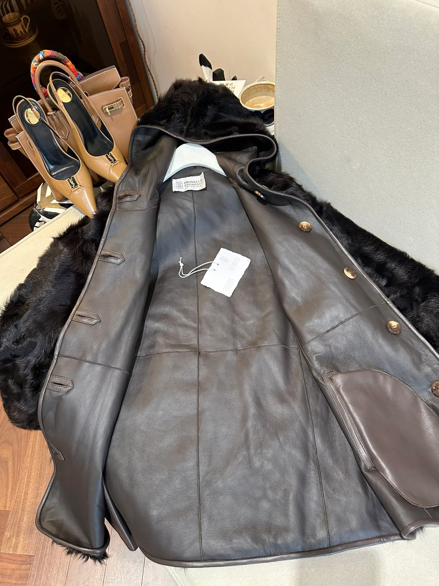 Уход и эксплуатация: замша требует ухода у специалистов и защиты от влаги; меховую отделку бережно обслуживать согласно рекомендациям производителя; хранение — на плечиках, в чехле от пыли.