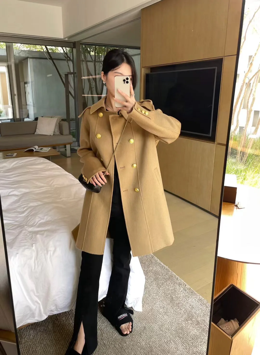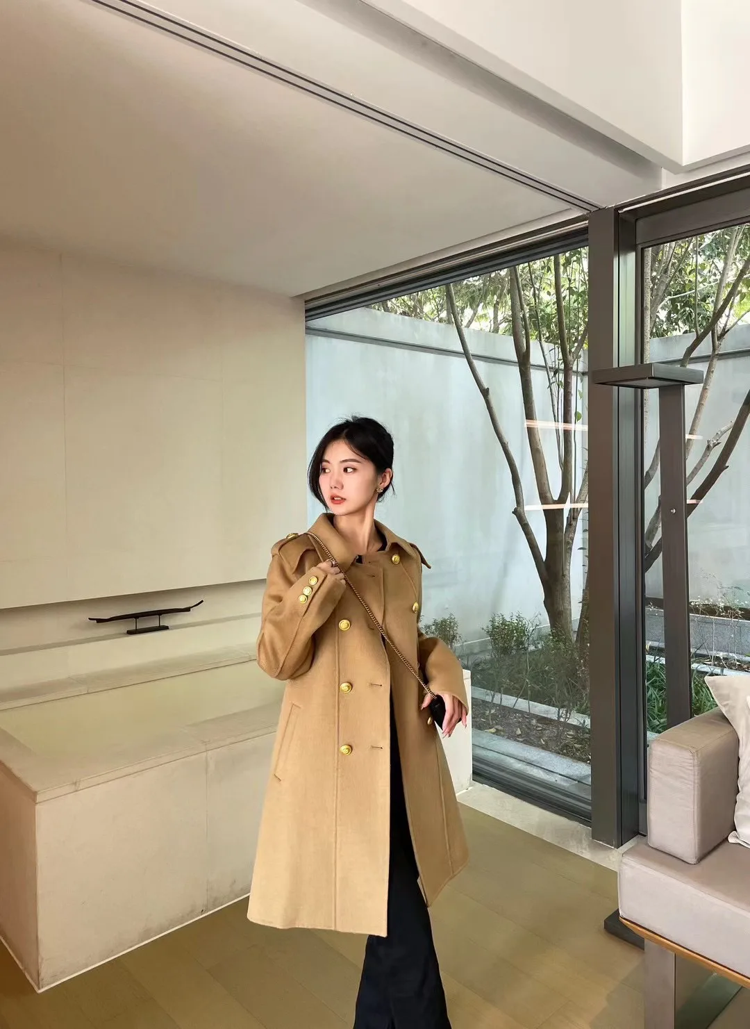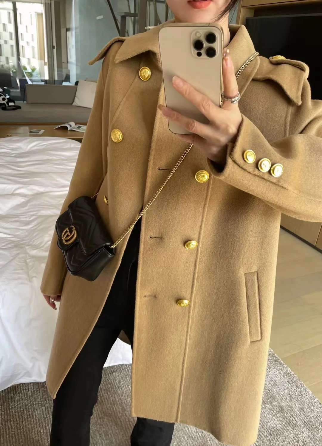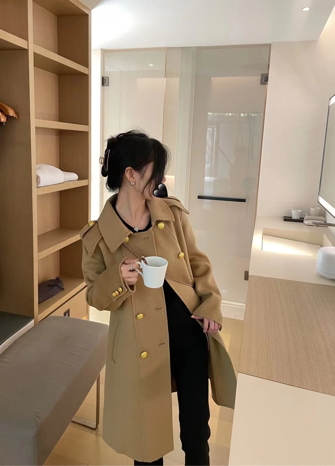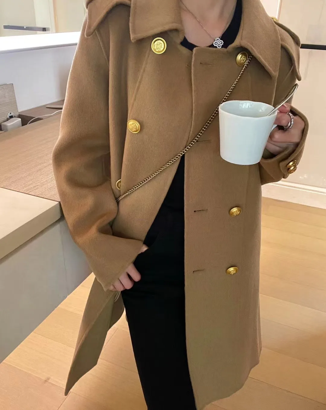 Двубортная застежка украшена крупными золотыми пуговицами, что добавляет особый шарм и подчеркивает изысканный стиль изделия. Пальто оснащено погонами на плечах и классическими длинными рукавами, придающими нотку строгости и утонченности.