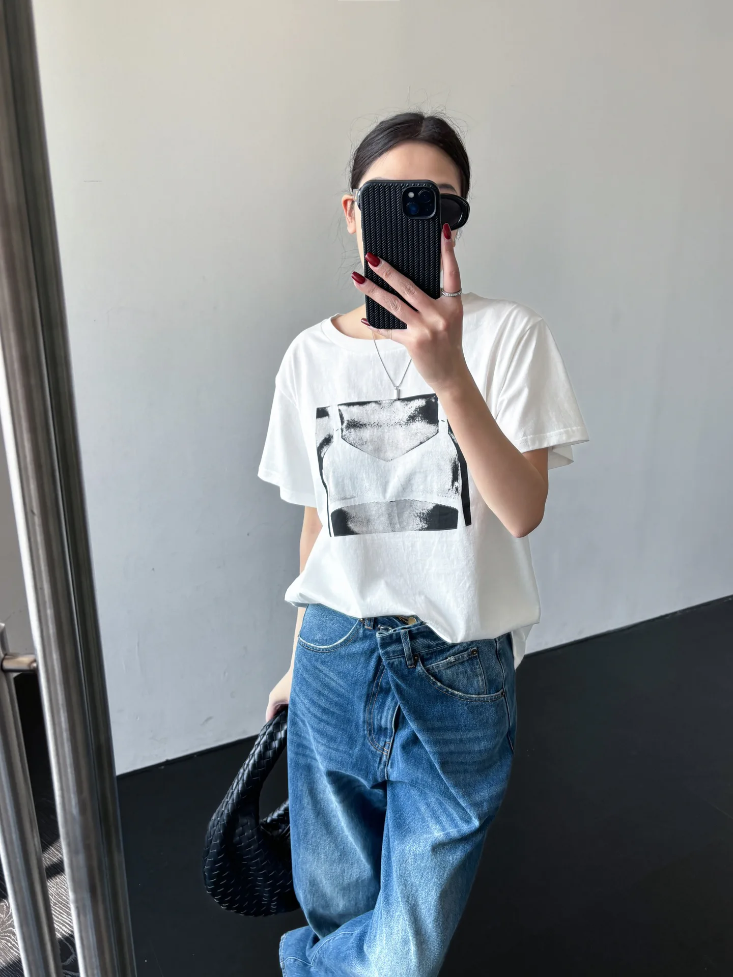 В дополнение к брюкам в комплекте идет футболка с американским принтом от N21. Она выполнена в расслабленном стиле, что позволяет сочетать её с различными нижними одеждами для создания разнообразных образов.
