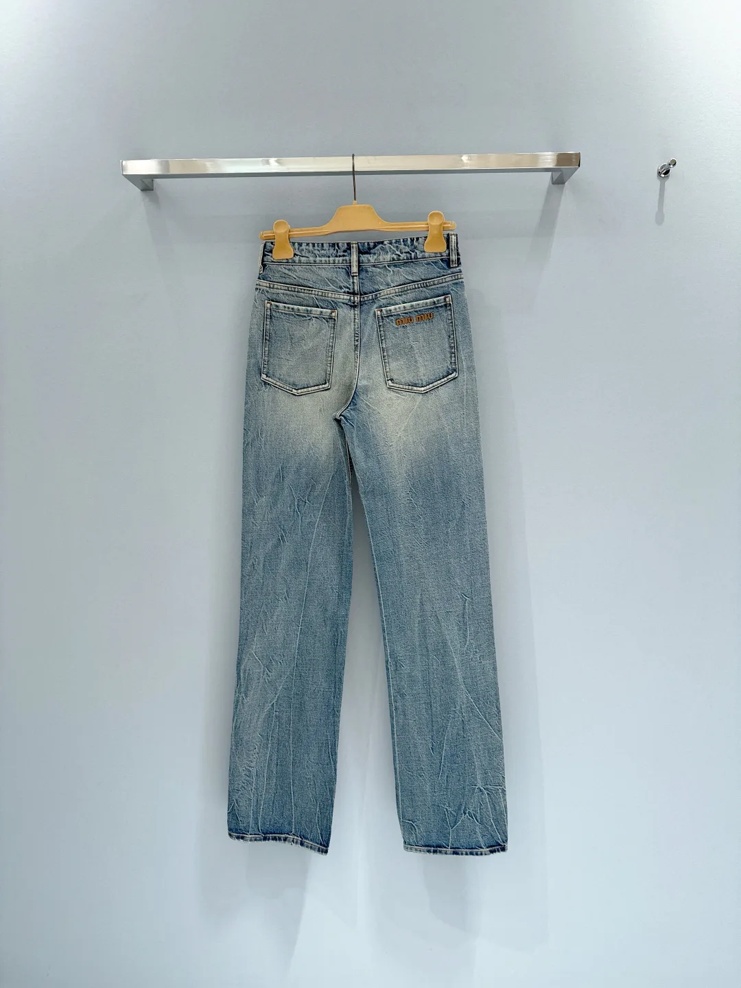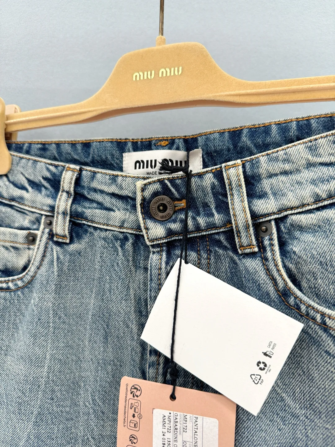 Джинсы идеально сочетаются с различной верхней одеждой, такой как свитеры, кардиганы, куртки и пальто, создавая стильные комбинации для осенне-зимнего сезона. Материал обеспечивает долговечность и легкость в уходе. Модель представлена под брендом MIU MIU как новое коллекционное изделие.