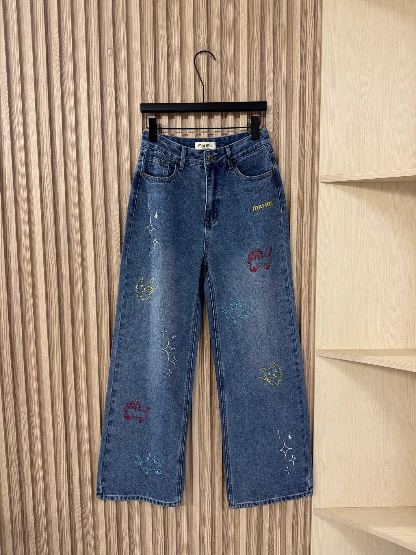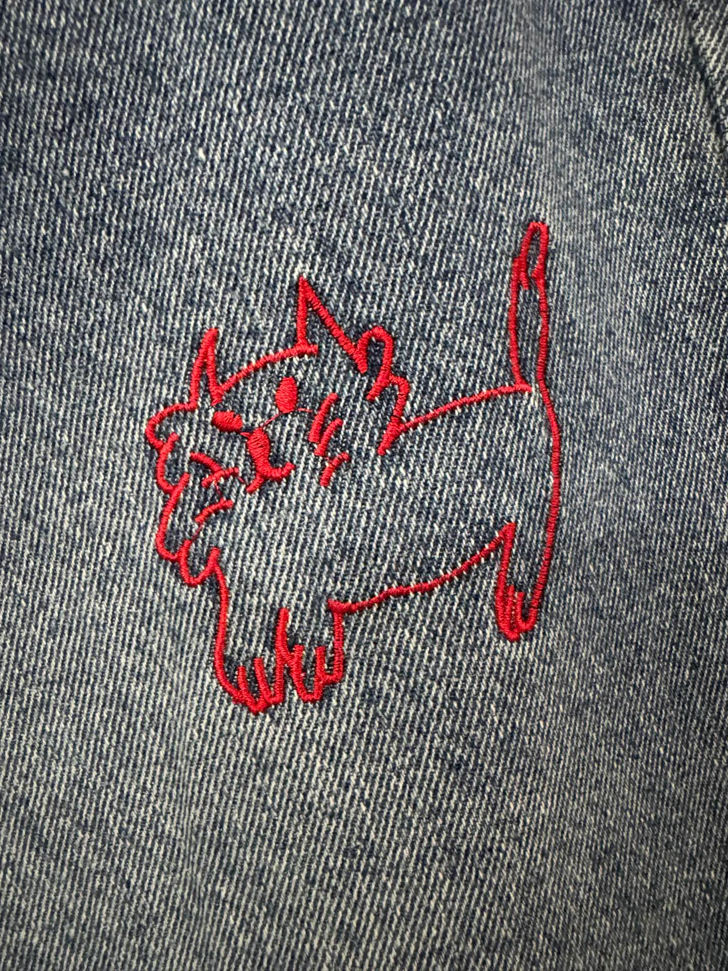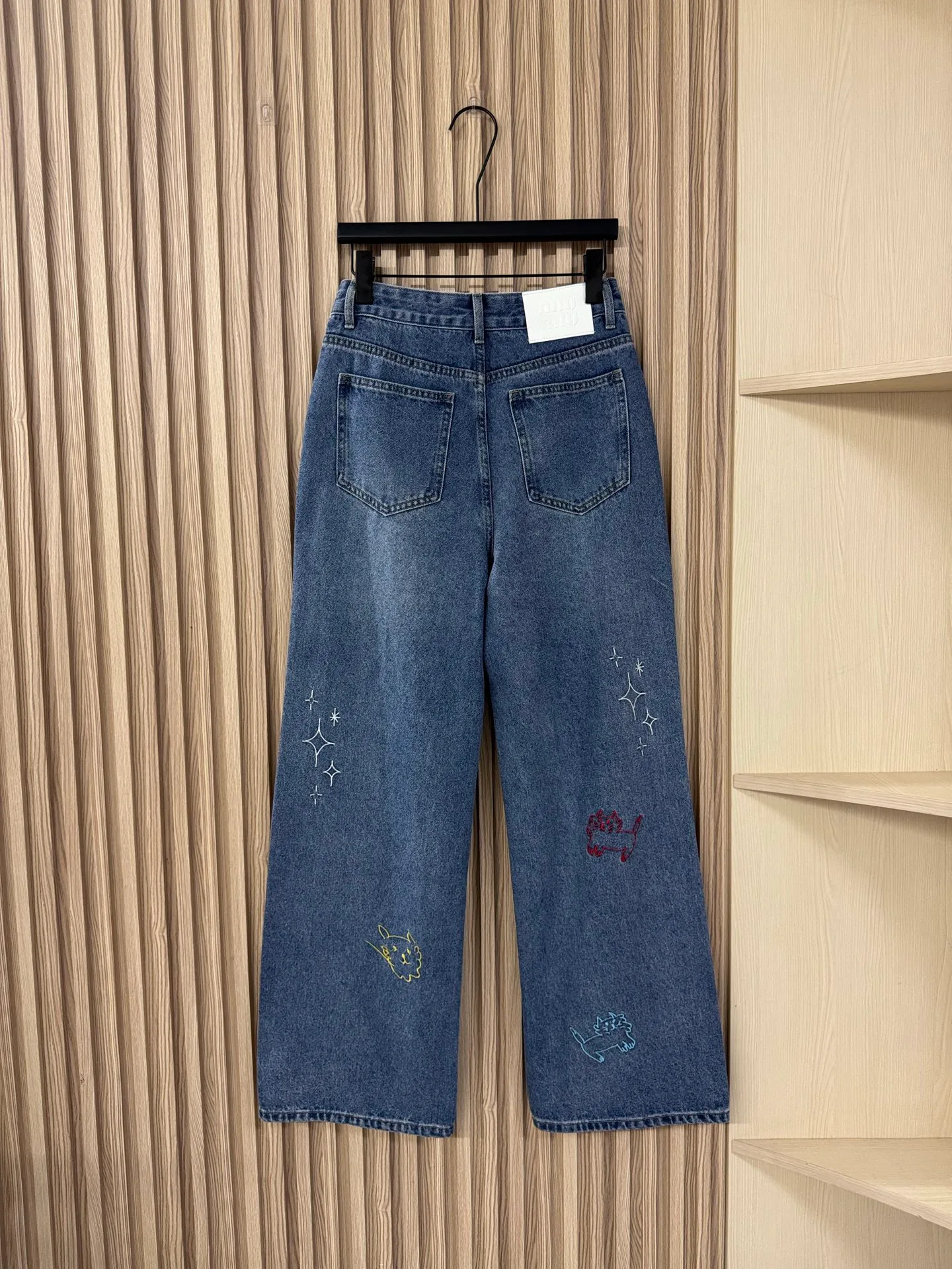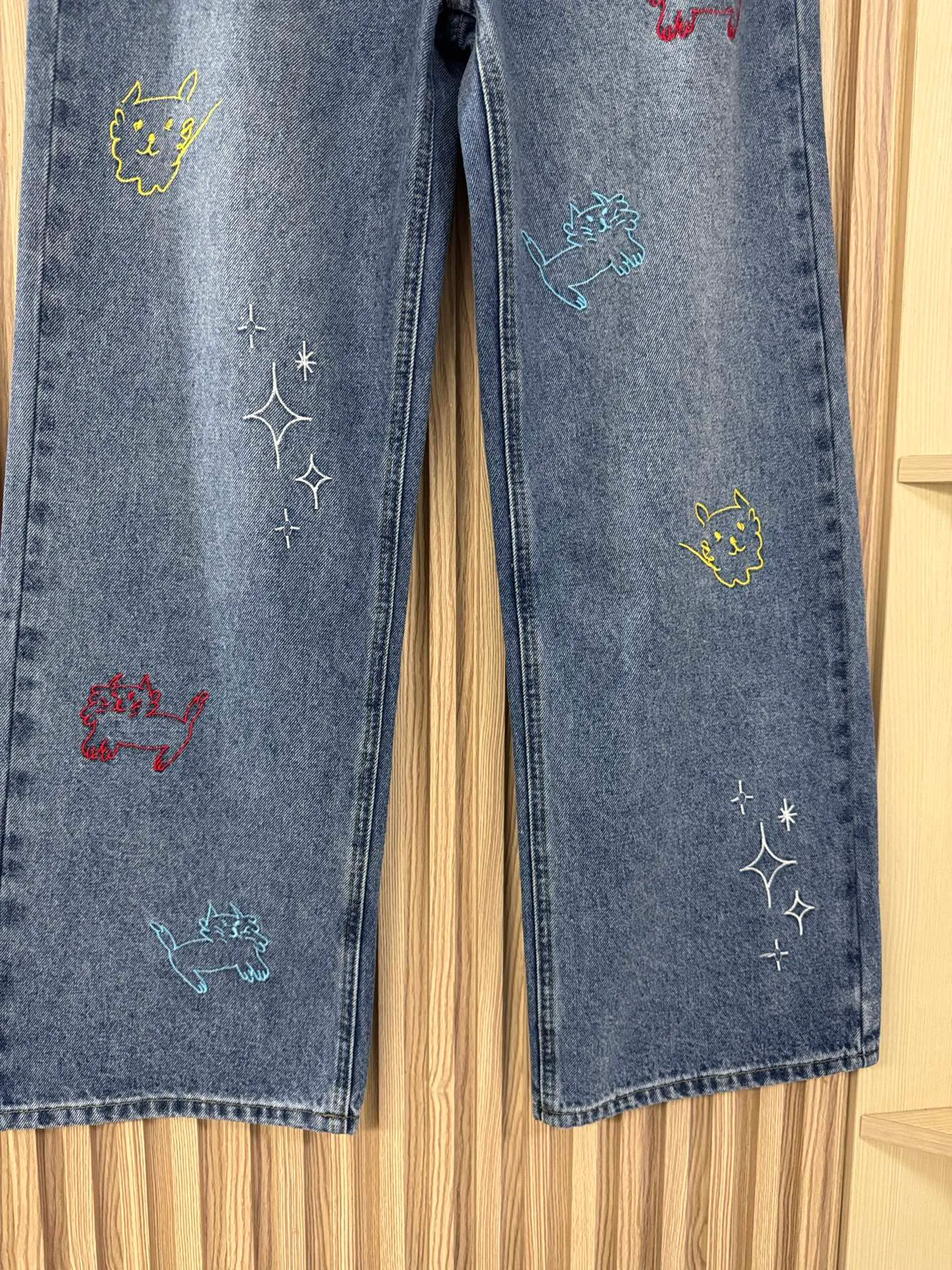 Фасон включает свободный, широкий низ по линии бока, который не сковывает движение. Многоцветная вышивка кошки выступает акцентной деталью, добавляя яркости образу. Джинсы подходят для повседневной носки, прогулок и неформальных мероприятий.