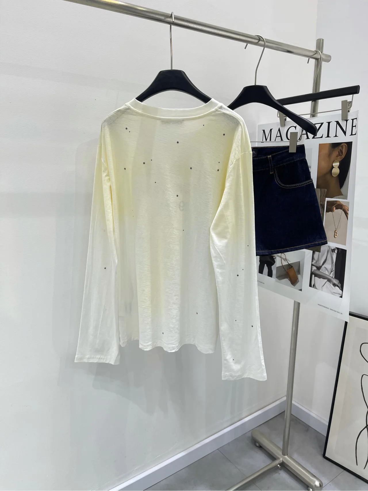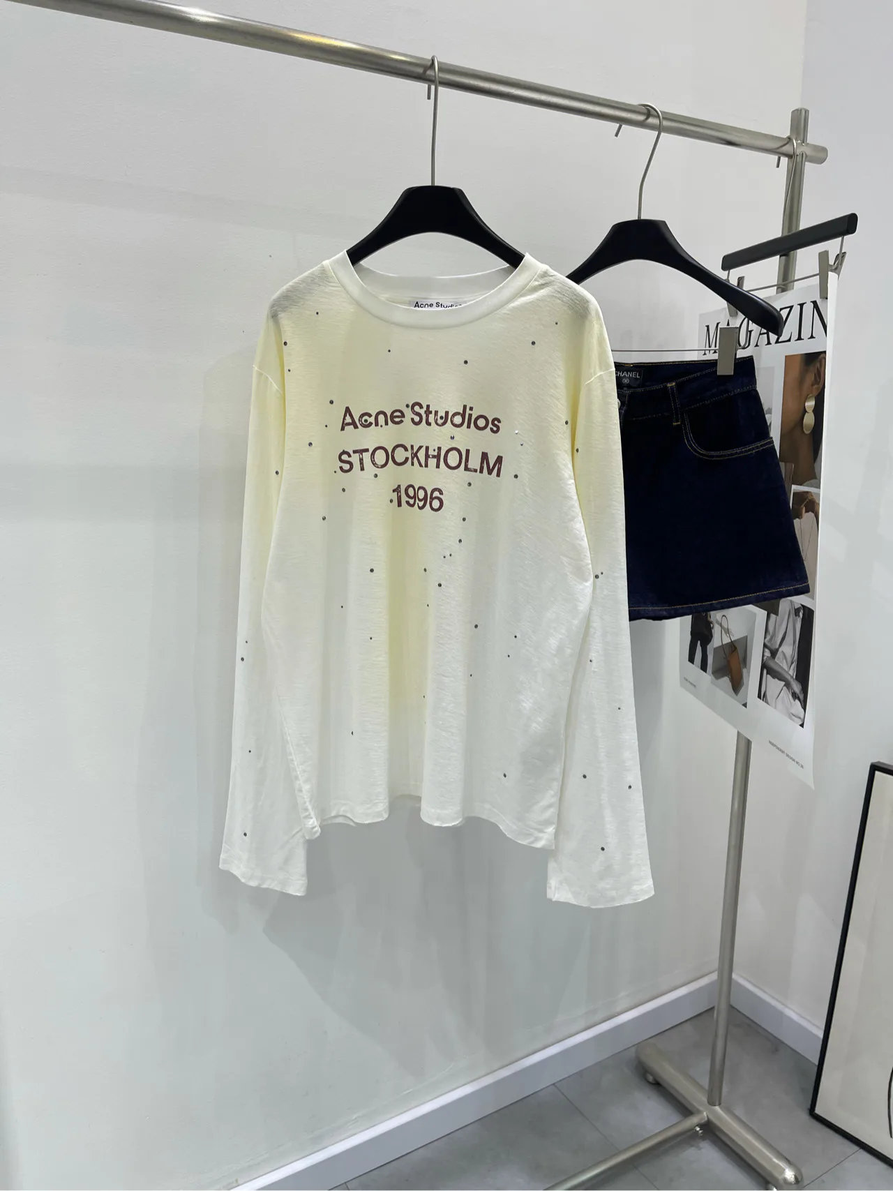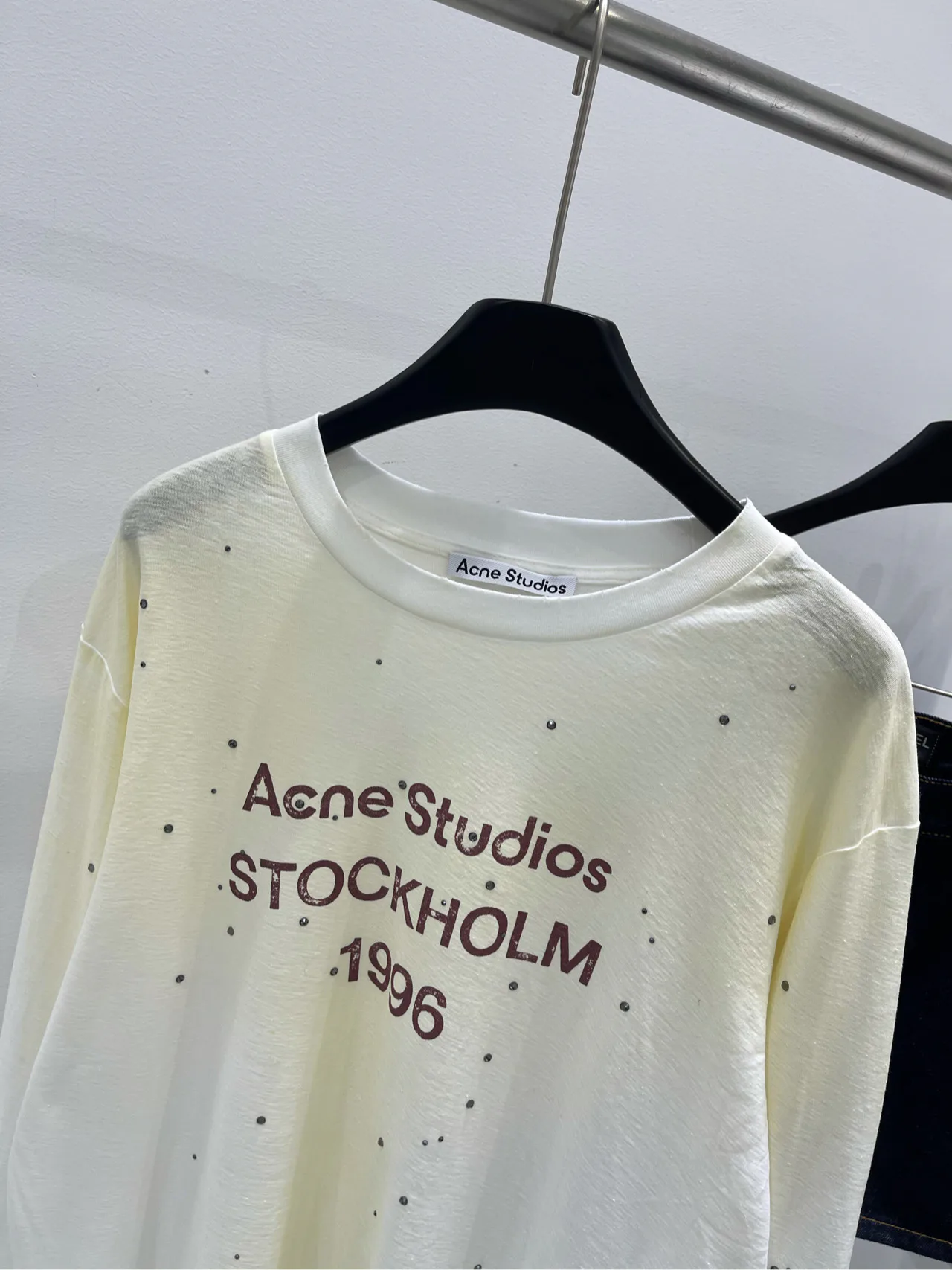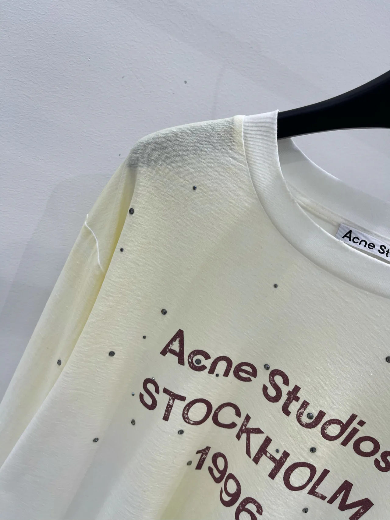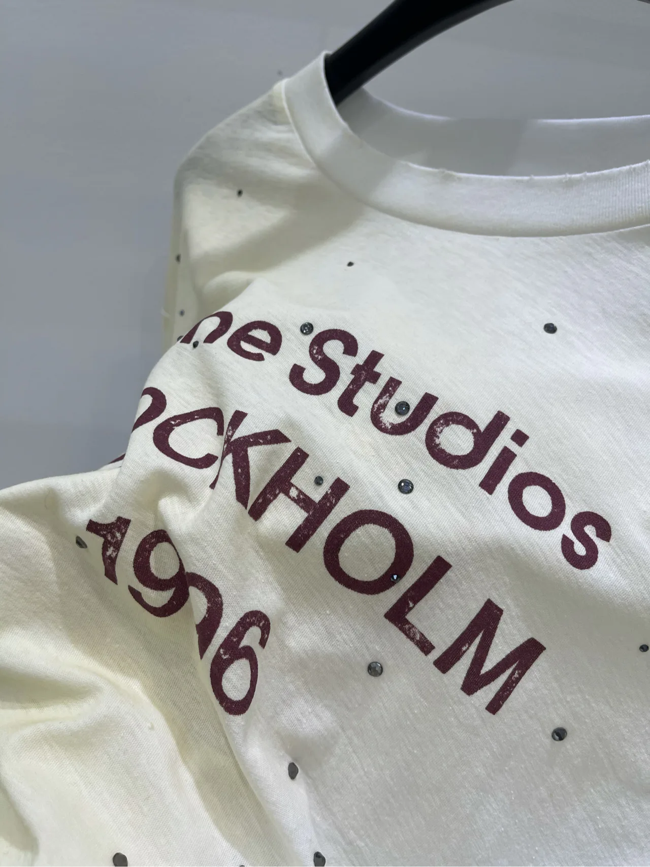 Футболка выполнена в нежном градиенте белого цвета с эффектом потертости, что придает ей уникальную винтажную атмосферу. Стильный принт с надписью "1996" дополнен черными стразами, которые красиво сверкают на свету, добавляя изделию изысканности и шика.