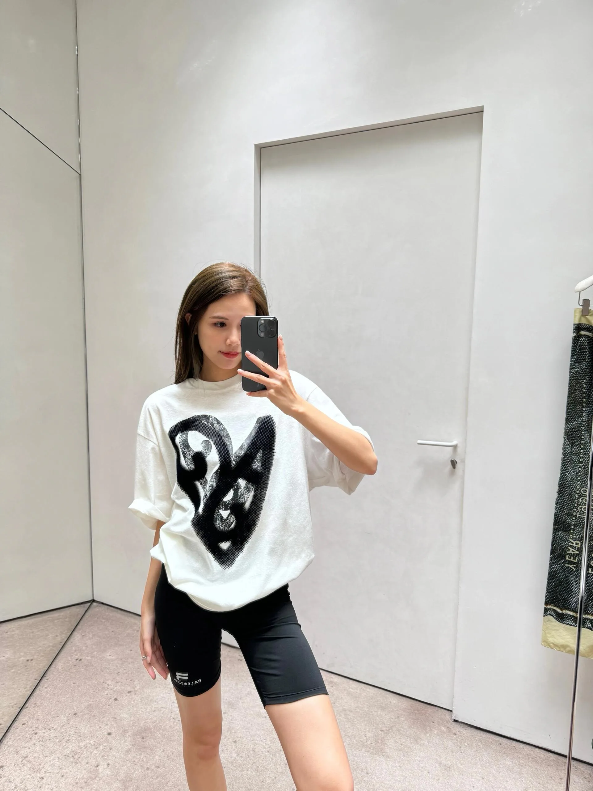 Футболка выполнена в черном цвете и украшена ярким рисунком в виде ретро сердечек и граффити, что придает ей необычный и выделяющийся вид. Такой стильный принт идеально подойдет для тех, кто хочет выразить свою индивидуальность и привнести в повседневный образ нотку креативности.