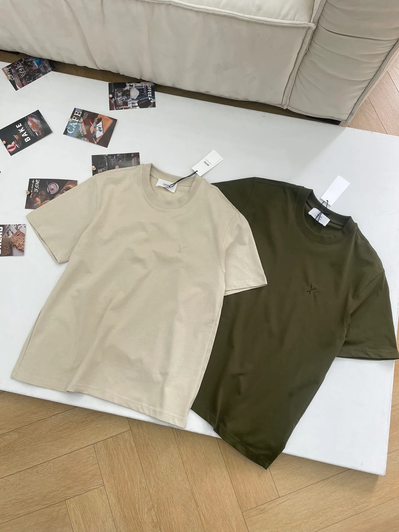 Футболка выполнена в свежих и натуральных цветах — нежно-песочном и оливковом, которые легко комбинируются с другими вещами. Модель привлекла внимание многочисленных звезд и блогеров благодаря своей универсальности и знаковому дизайну.