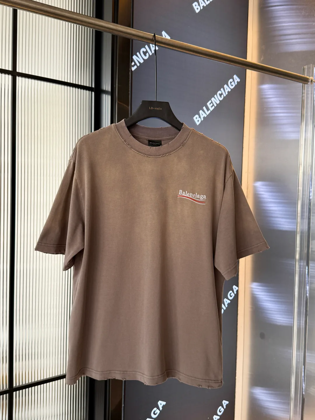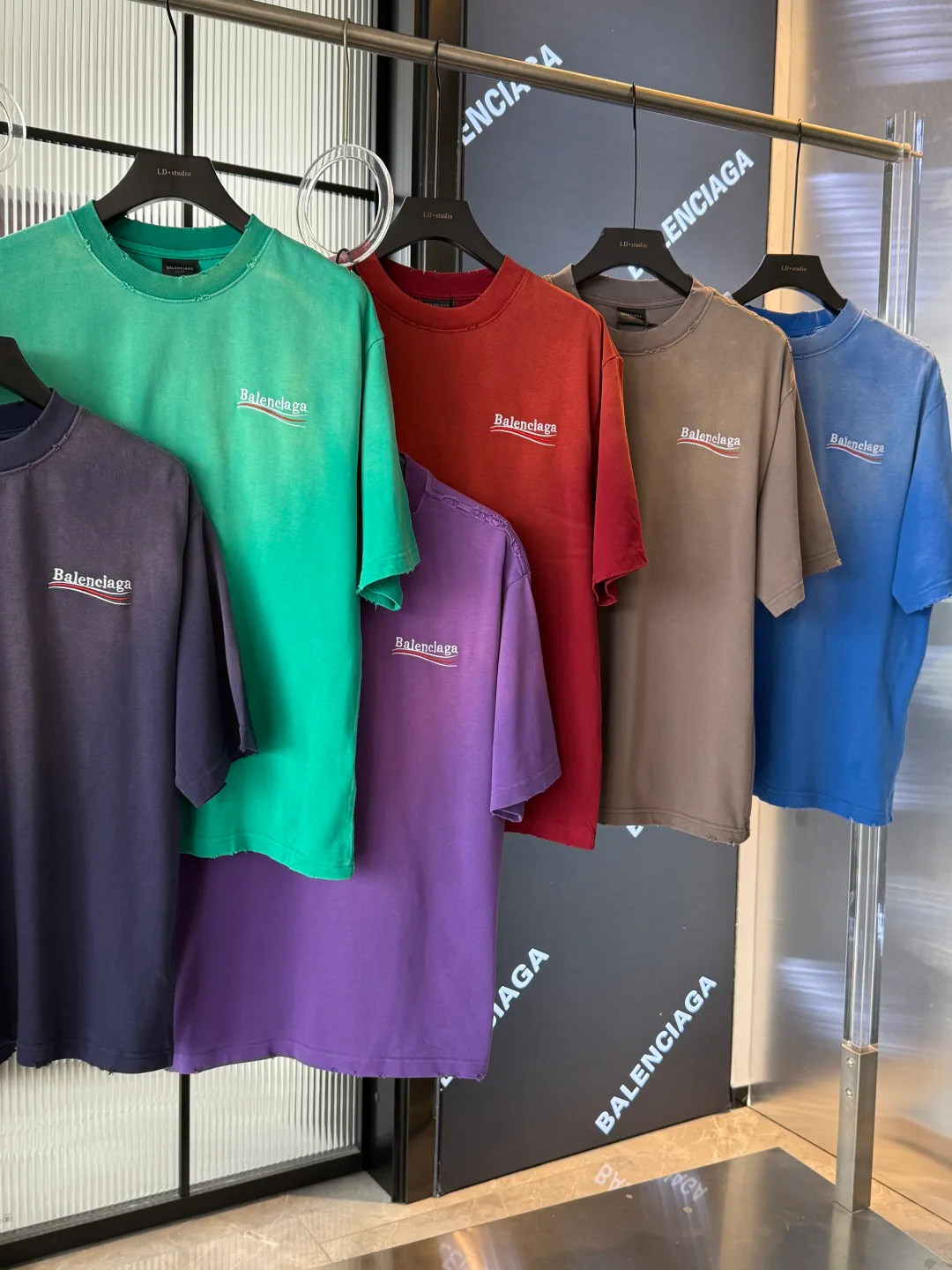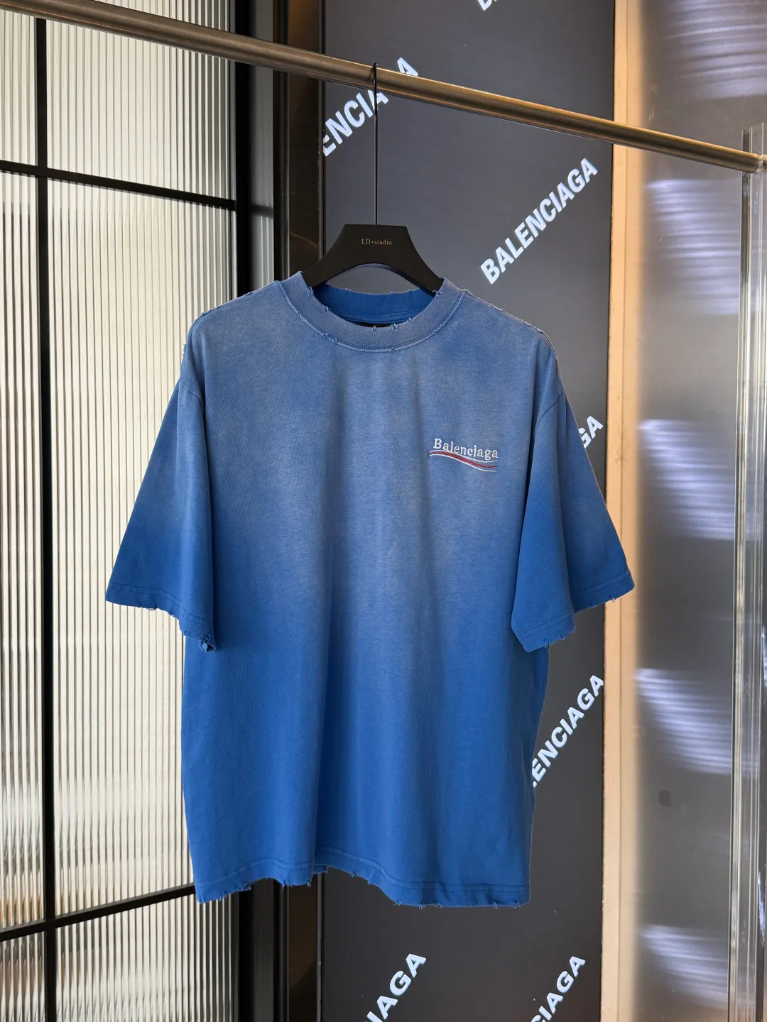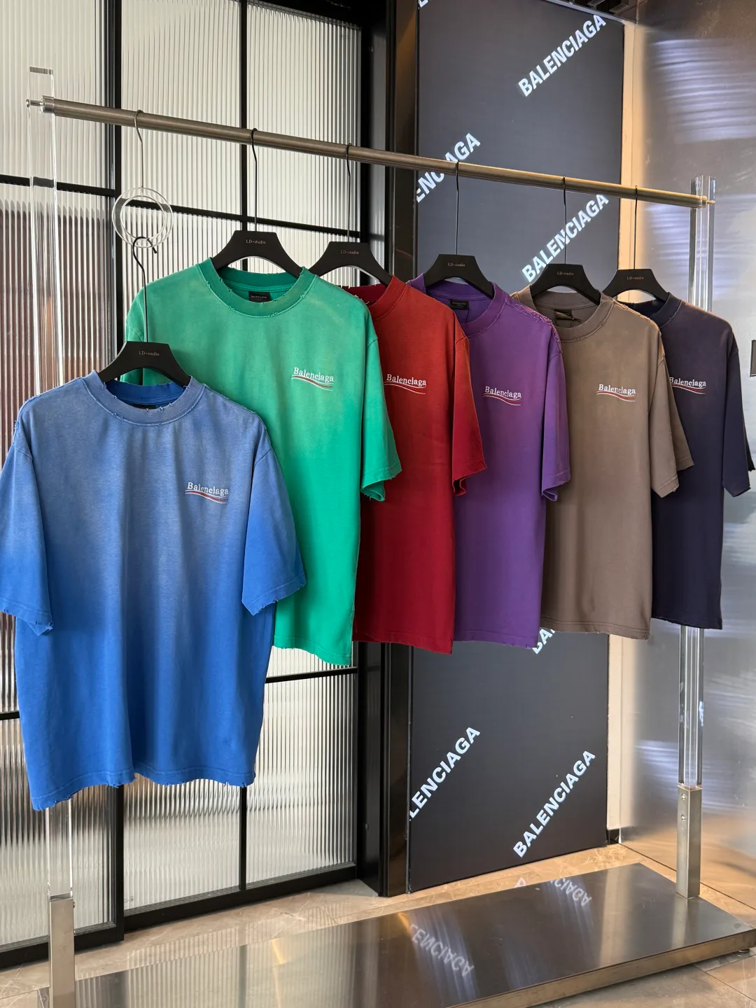 **Модель:** Классическая футболка с коротким рукавом, выполненная в формате круглого выреза. Дизайн включает эффект градиента и выраженные дырки, что создает эффект изношенности и подчеркивает модные тенденции в уличной одежде. На груди расположена объемная вышивка, что добавляет материалу текстурности и делает изделие более выразительным.