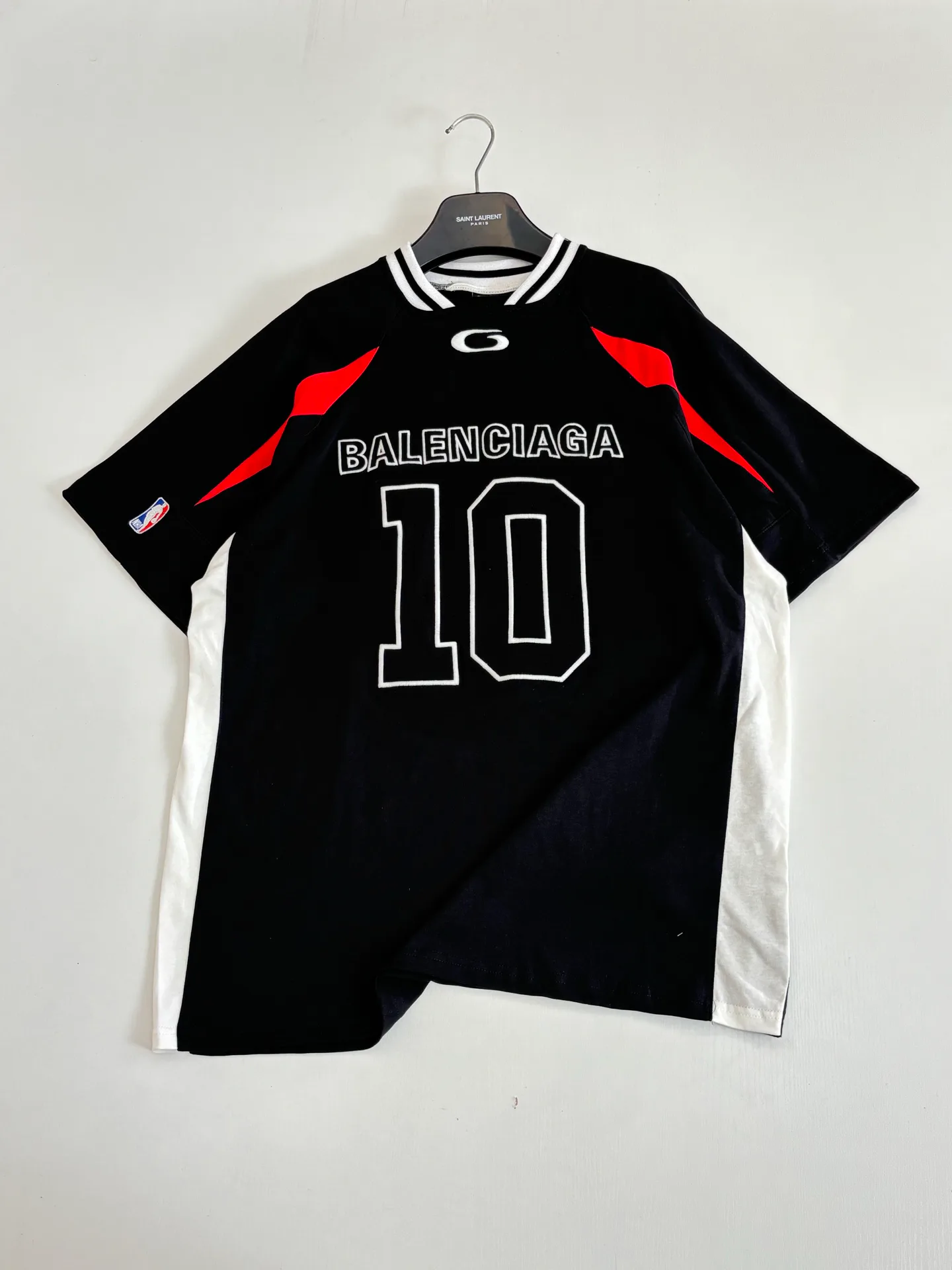 Футболка женская BALENCIAGA — модель из серии NBA, представленная в коллекции SS26. Она оформлена в стиле бейсбольной майки с элементами вышивки. Короткий рукав и свободный крой обеспечивают повседневный комфорт.