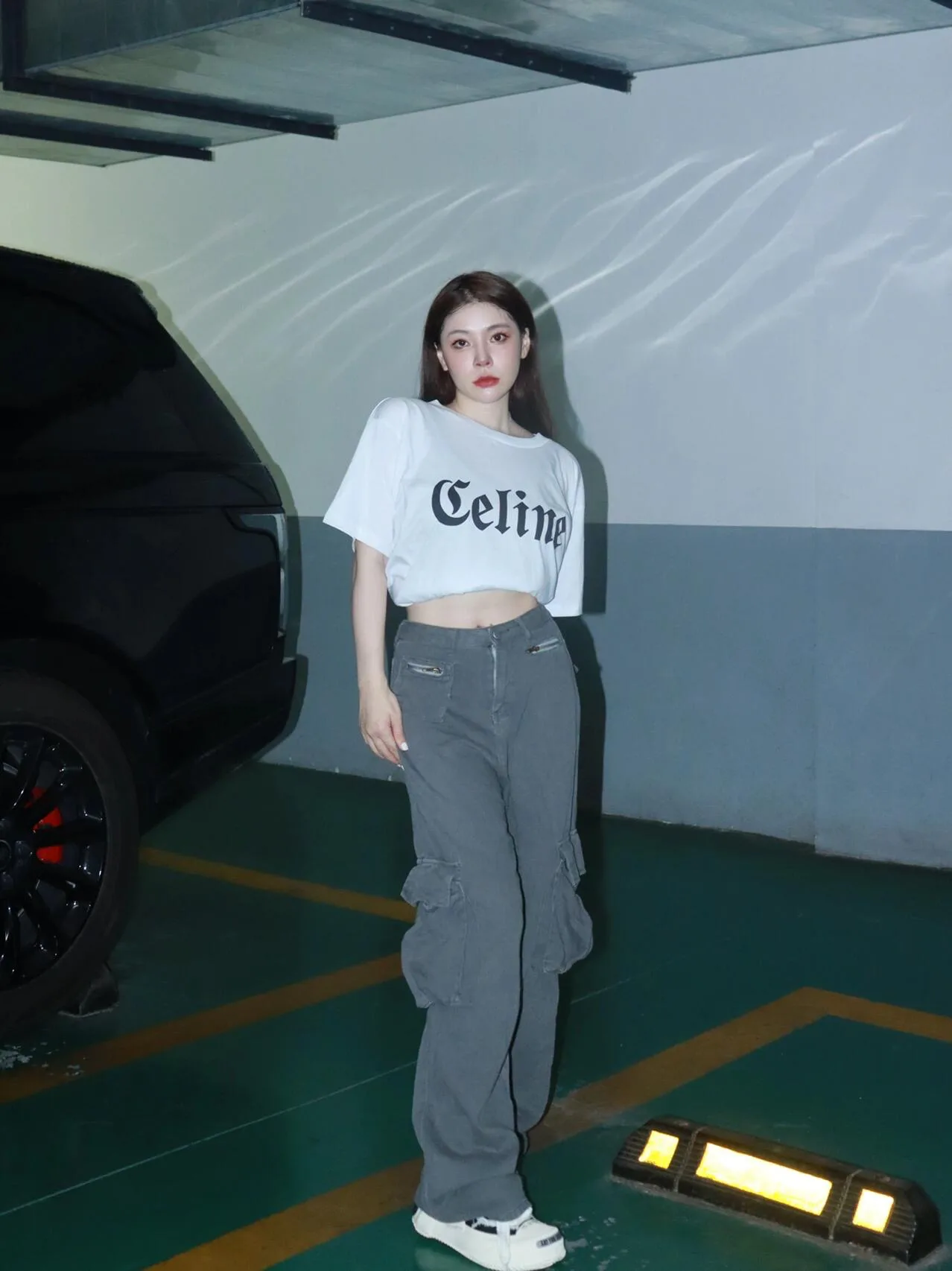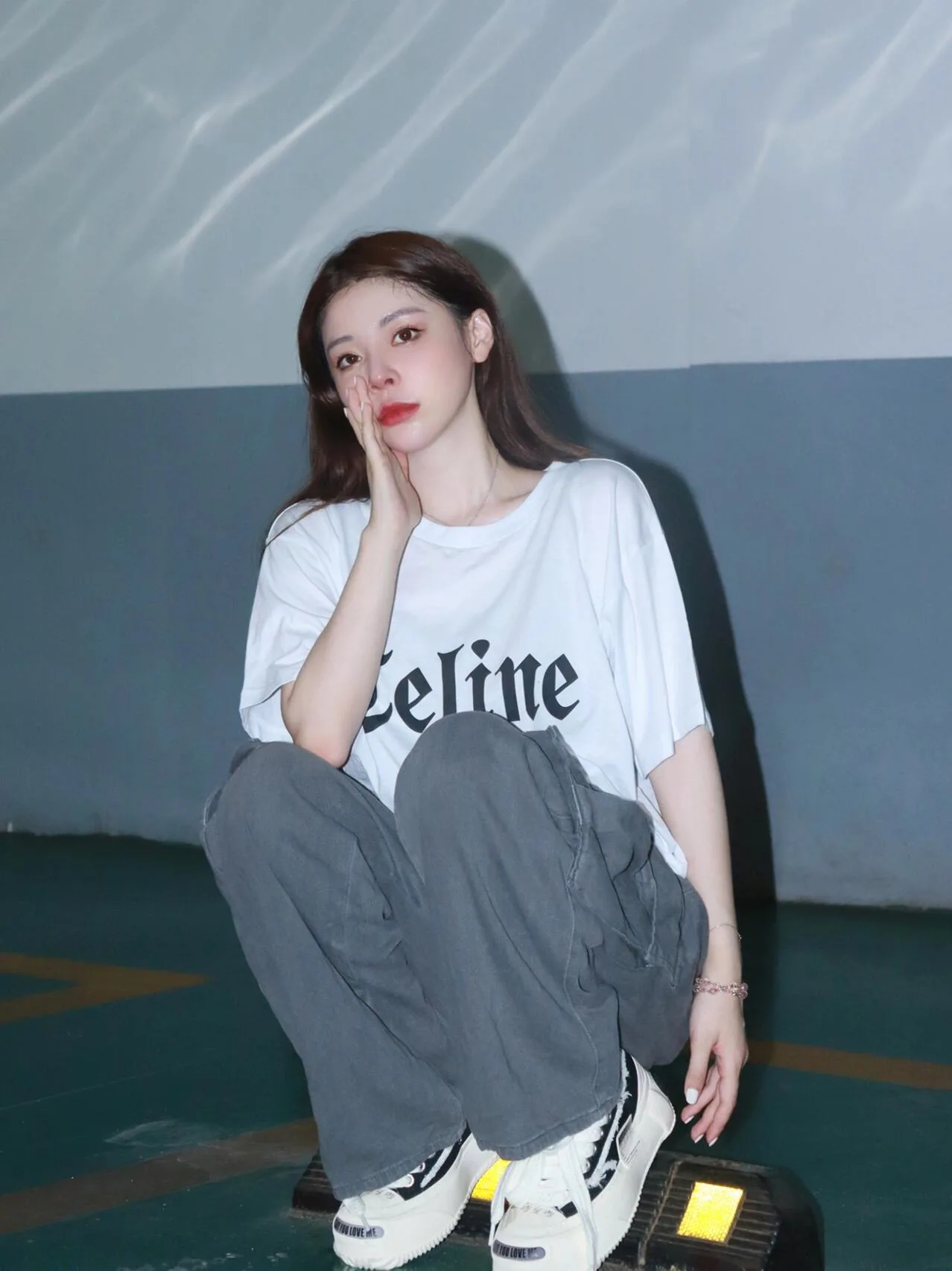 Футболка выполнена в классическом белом цвете и украшена крупной черной надписью на груди, что придаёт ей современный вид. Такой дизайн отлично сочетается с джинсами, шортами или юбками.