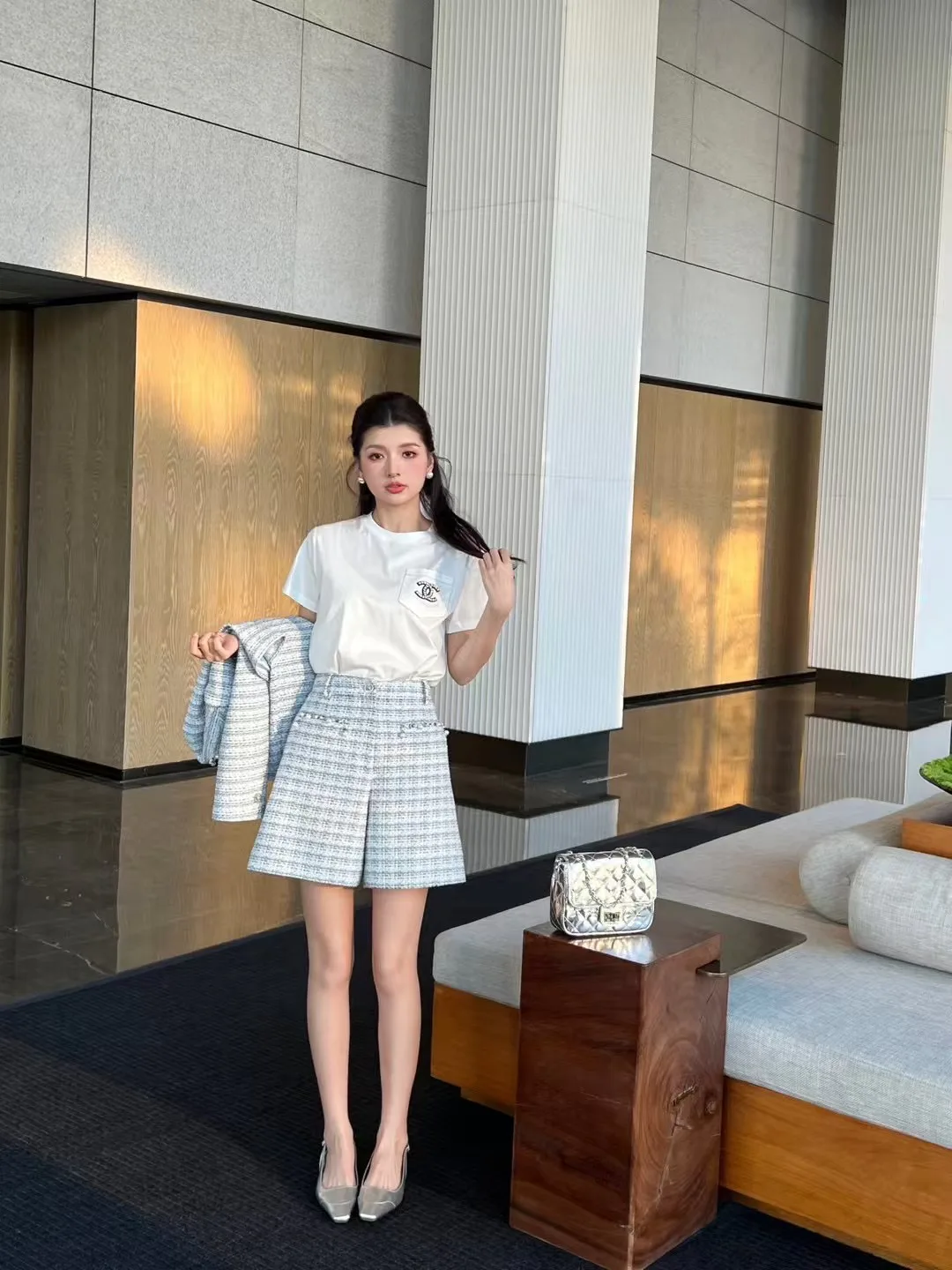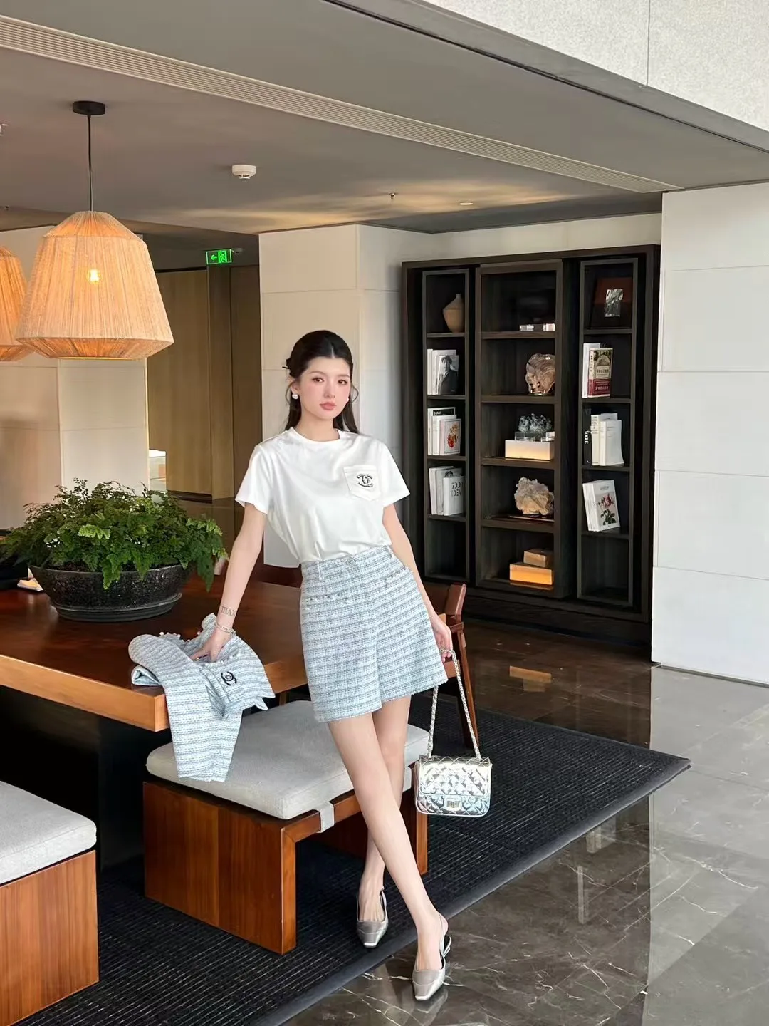 В комплект входят шорты из текстурированной ткани с ярко выраженным плетением. Шорты имеют высокую талию и отделку металлическими элементами, что подчеркивает их стиль. Такой ансамбль можно дополнить жакетом в идентичном стиле и с тем же брендовым оформлением, чтобы создать гармоничный образ. Эта одежда подходит для создания яркого и запоминающегося стиля, сочетая комфорт и изысканность.