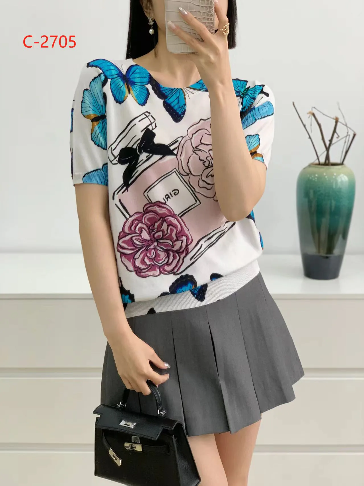 Изделие выделяется логотипом известного бренда CHANEL, который подчеркивает его эксклюзивность и качество. Топ имеет округлый вырез горловины, что делает его универсальным и подходящим для различных стилей. Края рукавов и нижняя часть топа оформлены резинкой, что обеспечивает аккуратную и комфортную посадку по фигуре.
