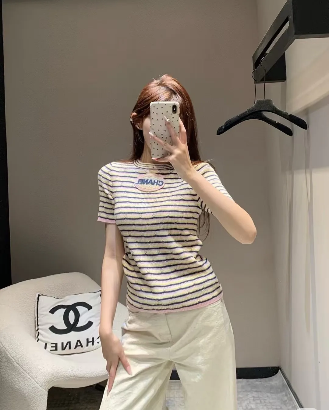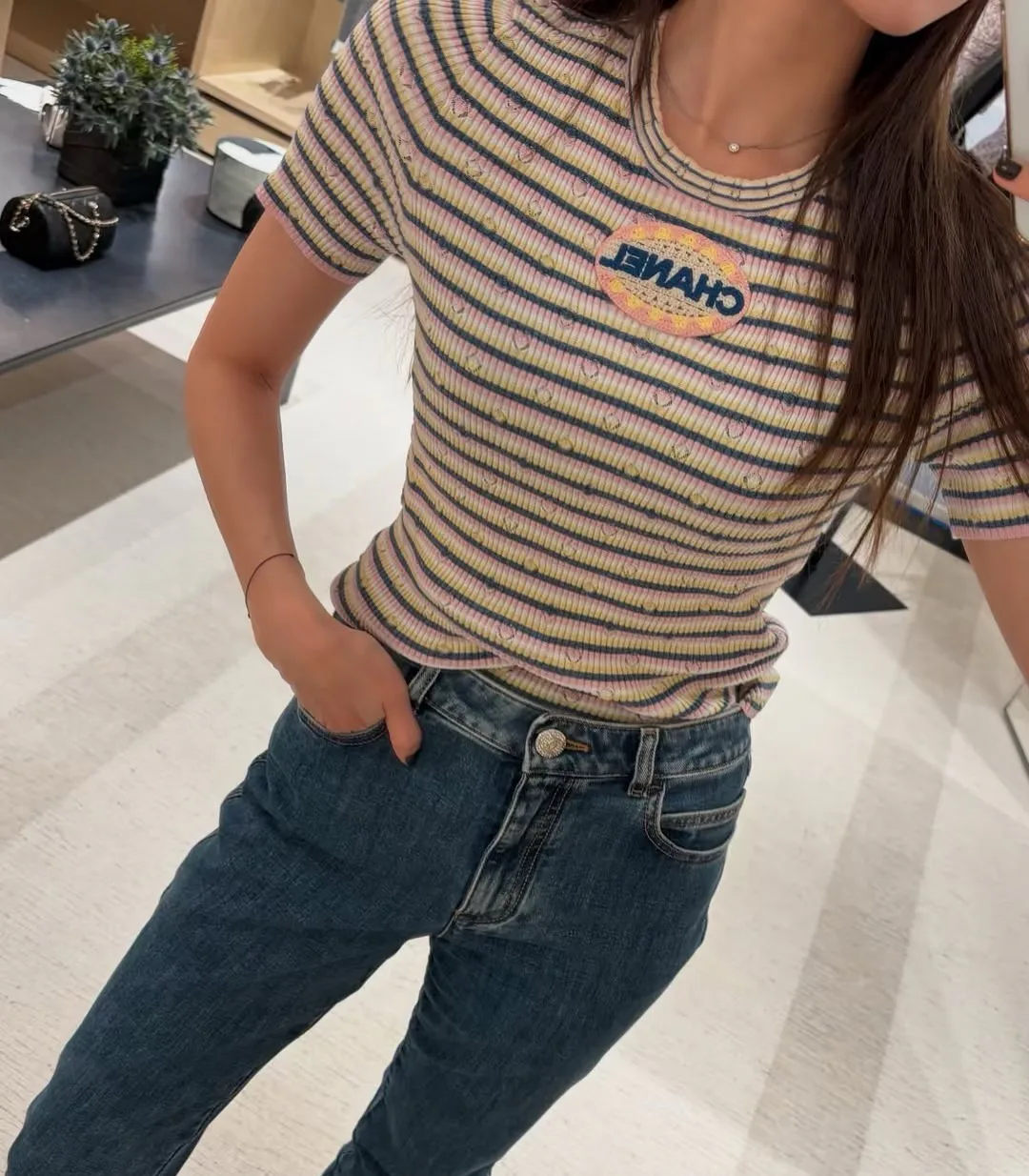 Дизайн футболки отличается яркими горизонтальными полосами различных цветов: белого, черного и светло-розового. Эта цветовая палитра создает свежий и молодежный образ, который легко впишется как в повседневный, так и в более нарядный стиль. На груди размещена аппликация с узнаваемым логотипом CHANEL, выполненная в контрастных цветах, что добавляет акцент и подчеркивает статус изделия.