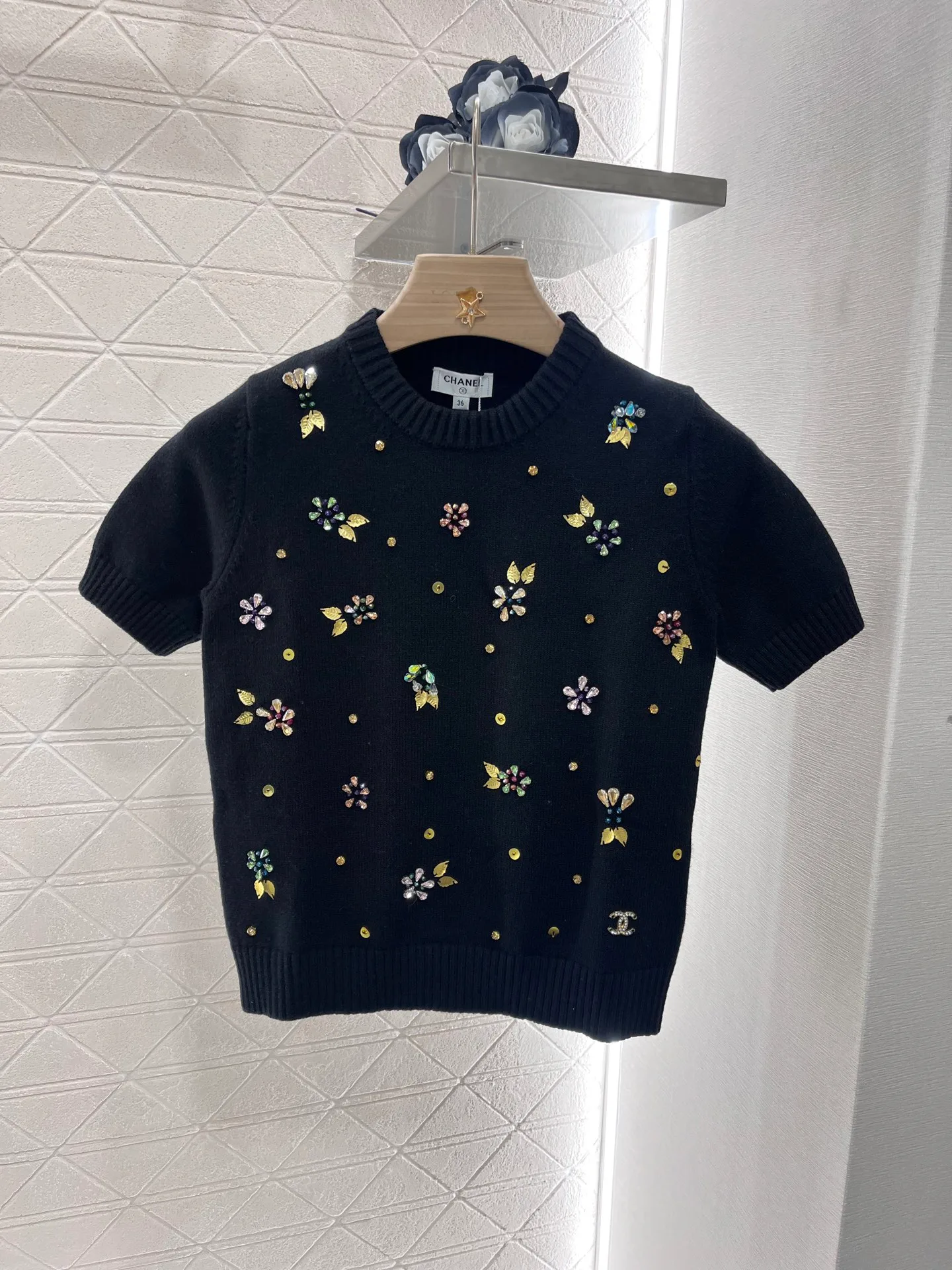 Крой изделия подчеркнуто выделяет фигурные линии, придавая ему утонченный и брендовый стиль. Использование мягкой шерсти способствует созданию эффектного визуального облика, делая фигуру более стройной. Особое внимание привлекают детали: топ украшен тонкой вышивкой из цветных страз, которые формируют цветочные узоры, привнося в образ весеннее настроение.