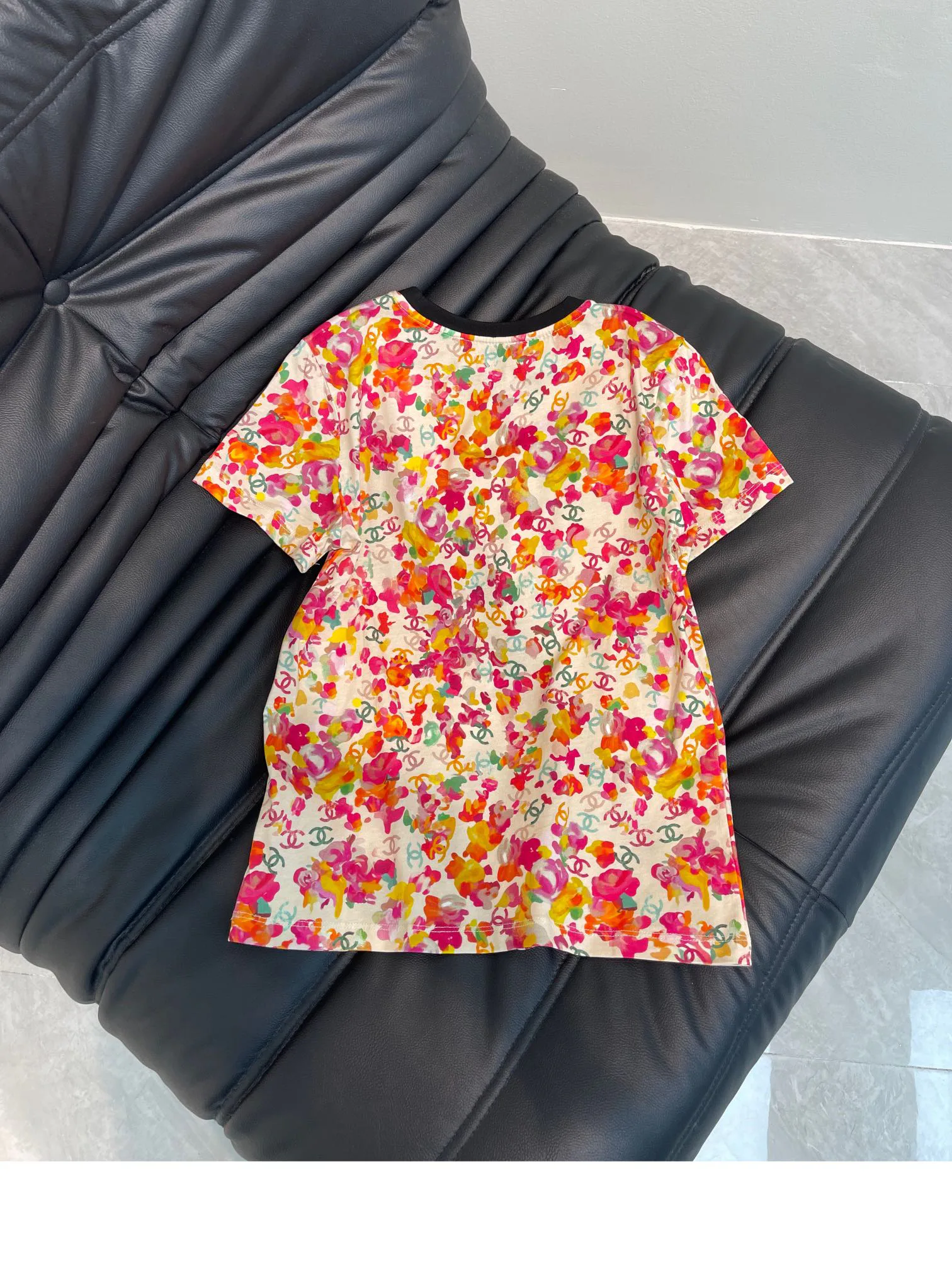 Футболка украшена ярким принтом с активной горной чайной розой, а также имеет уникальные декоративные элементы в виде несимметричных точек и двух букв "C", что добавляет ей изящества и подчеркивает статус бренда. Низкий округлый вырез дополнен черной металлической окантовкой, что делает модель более стильной и интересной в деталях.