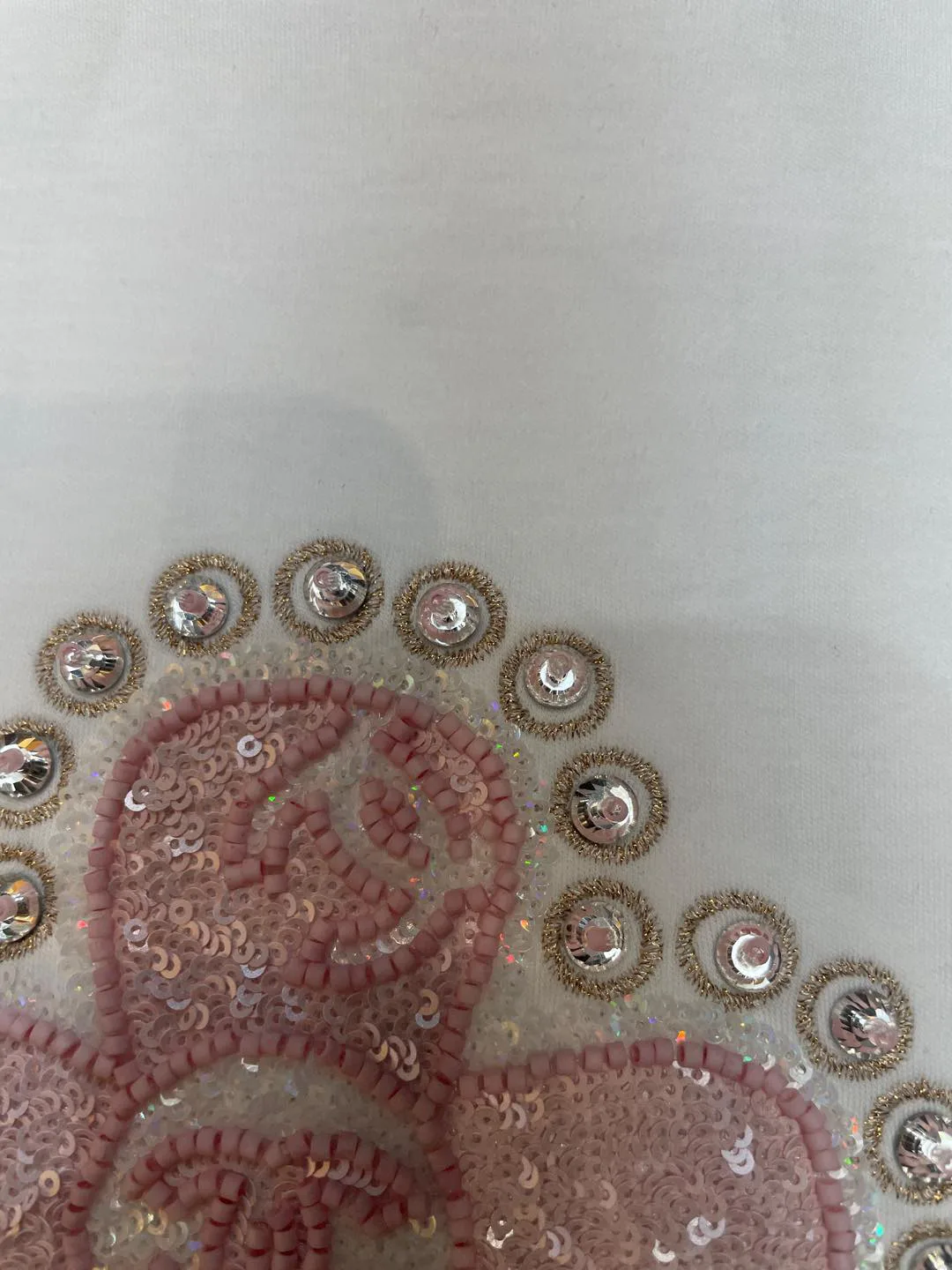 Футболка украшена изысканной вышивкой из розовых и белых бусин, которые образуют мотив камелии и двойной логотип «C», что придает изделию сладкий и роскошный индивидуальный стиль. Этот оригинальный дизайн обязательно привлечет внимание и подчеркнет ваш уникальный вкус.