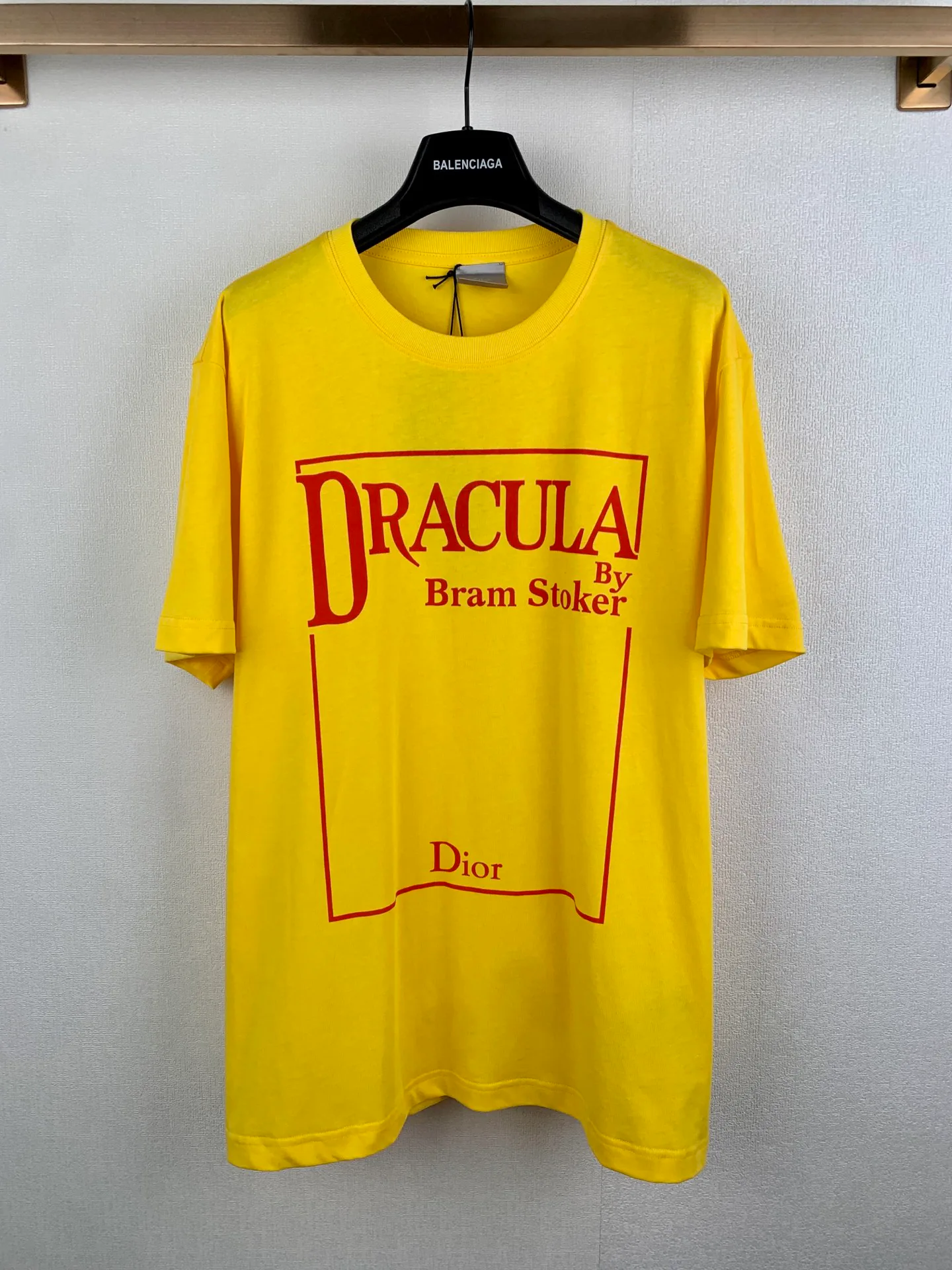 Футболки женские CHRISTIAN DIOR — Dracula тема, ярко‑желтая футболка с принтом. На передней части размещён текст «DRACULA By Bram Stoker», снизу расположен фирменный знак. Из хлопка, комфортная и дышащая, со свободным кроем, удобна для повседневной носки и городского стиля. Разработано JonathanAnderson, стиль сочетает искусство и моду и позволяет выразить индивидуальность. Цвет — желтый; размеры: S, M, L, XL.