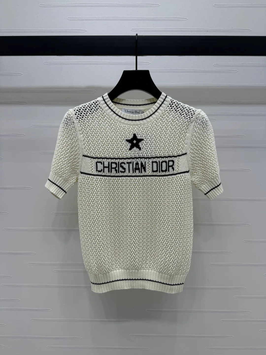 Футболки женские CHRISTIAN DIOR — модель из новой весенне-летней коллекции выполнена в технике вязаного полотна с ажурными полосами и фактурной поверхностью. Дизайн дополнен контрастным цветовым решением и декоративным элементом в виде звезды на груди. Изделие представлено в одном цветовом варианте и нескольких размерах.