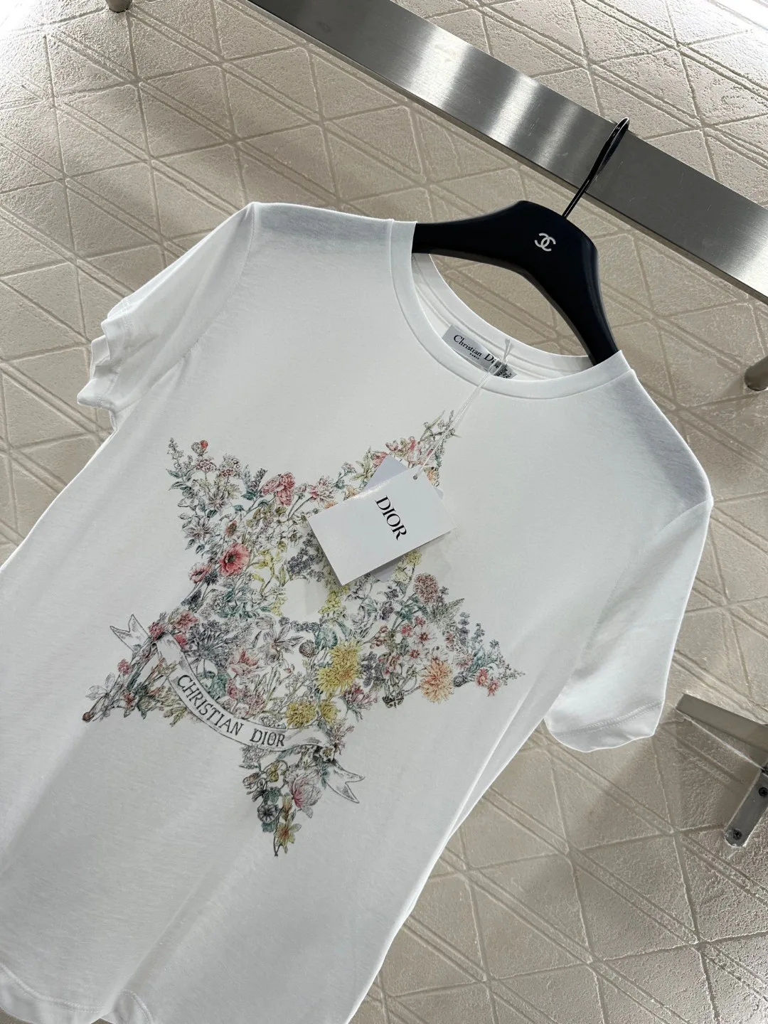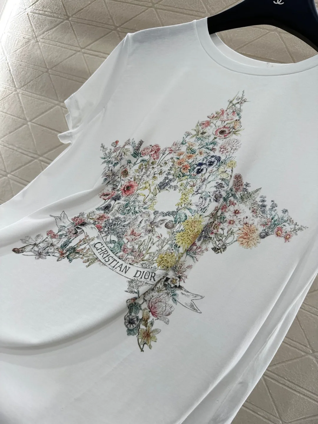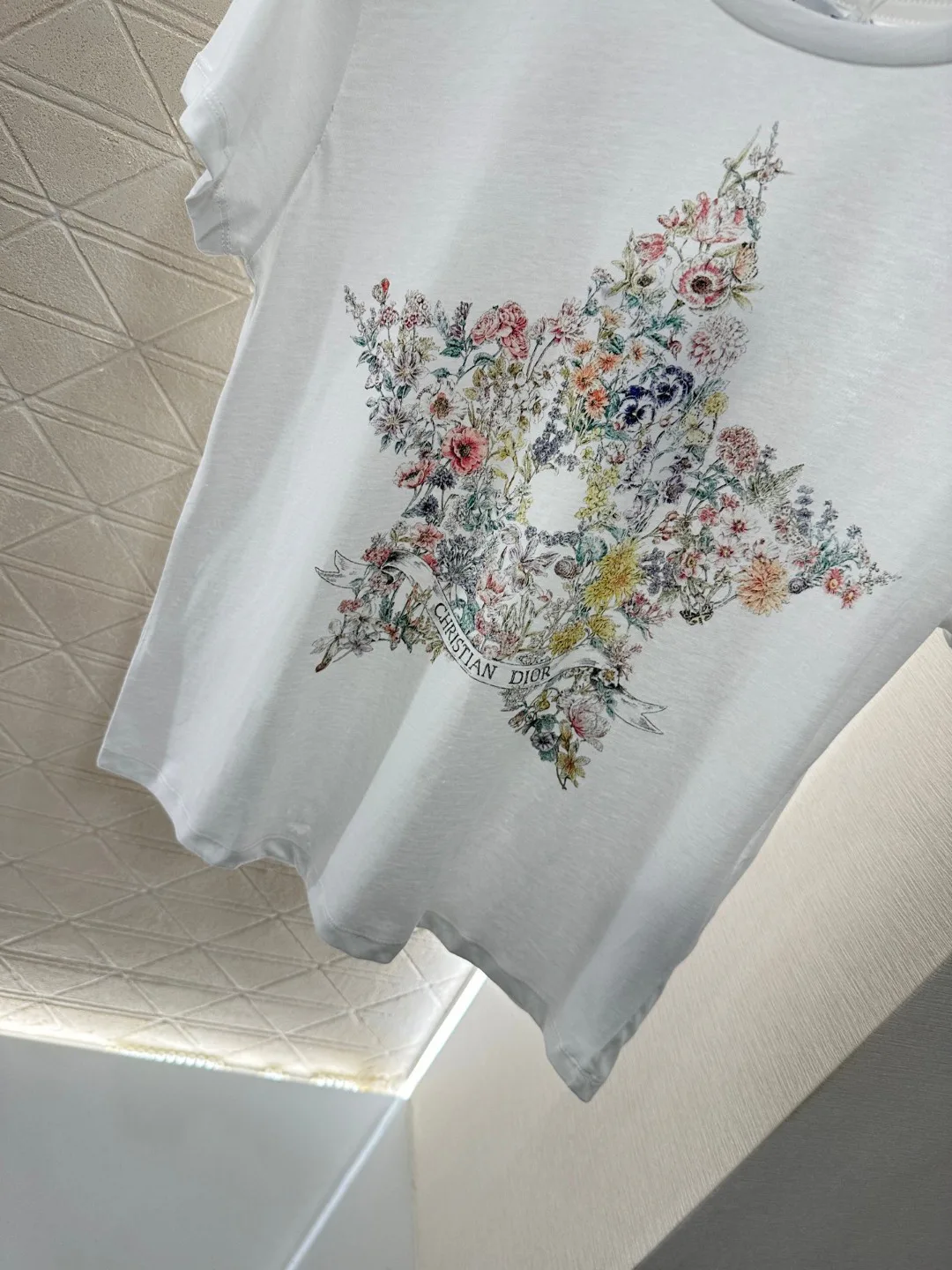 Дизайн футболки украшен принтом с природными элементами, включая цветочные вьюны и фазы луны, образующие спиралевидный узор. В центре композиции расположены стильные звёздочки, подчеркивающие индивидуальность бренда. Футболка подходит для создания многослойных образов.