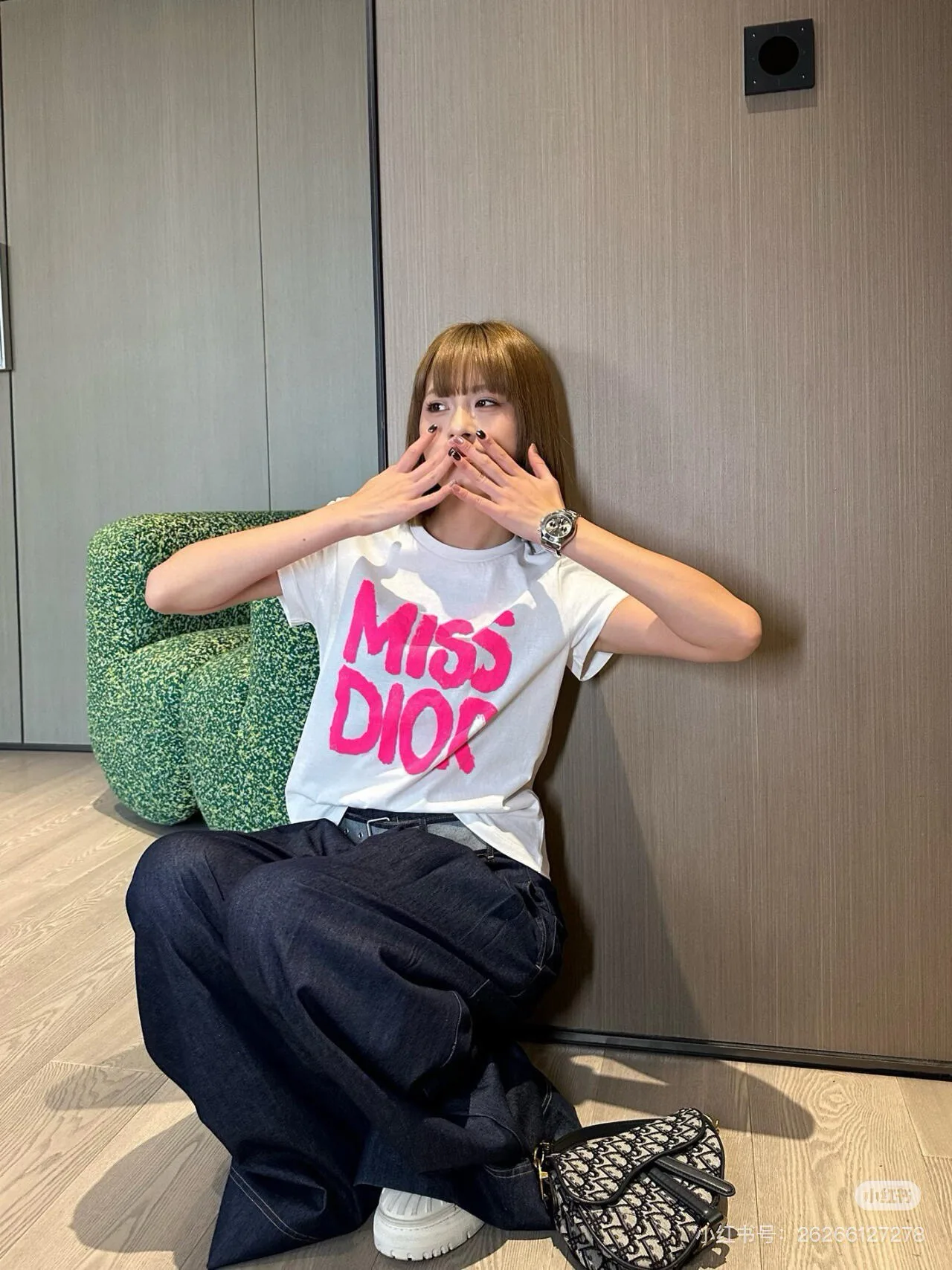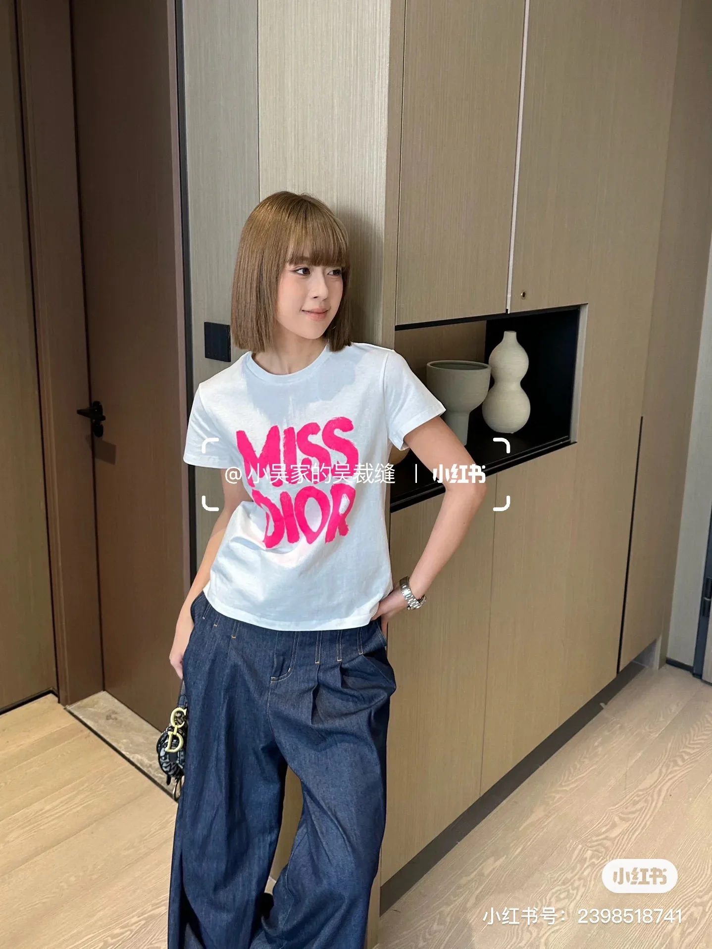 Белая модель подчёркивает яркий принт розового цвета с надписью MISS DIOR. Контраст создаёт заметный визуальный акцент и добавляет изюминку повседневному образу.