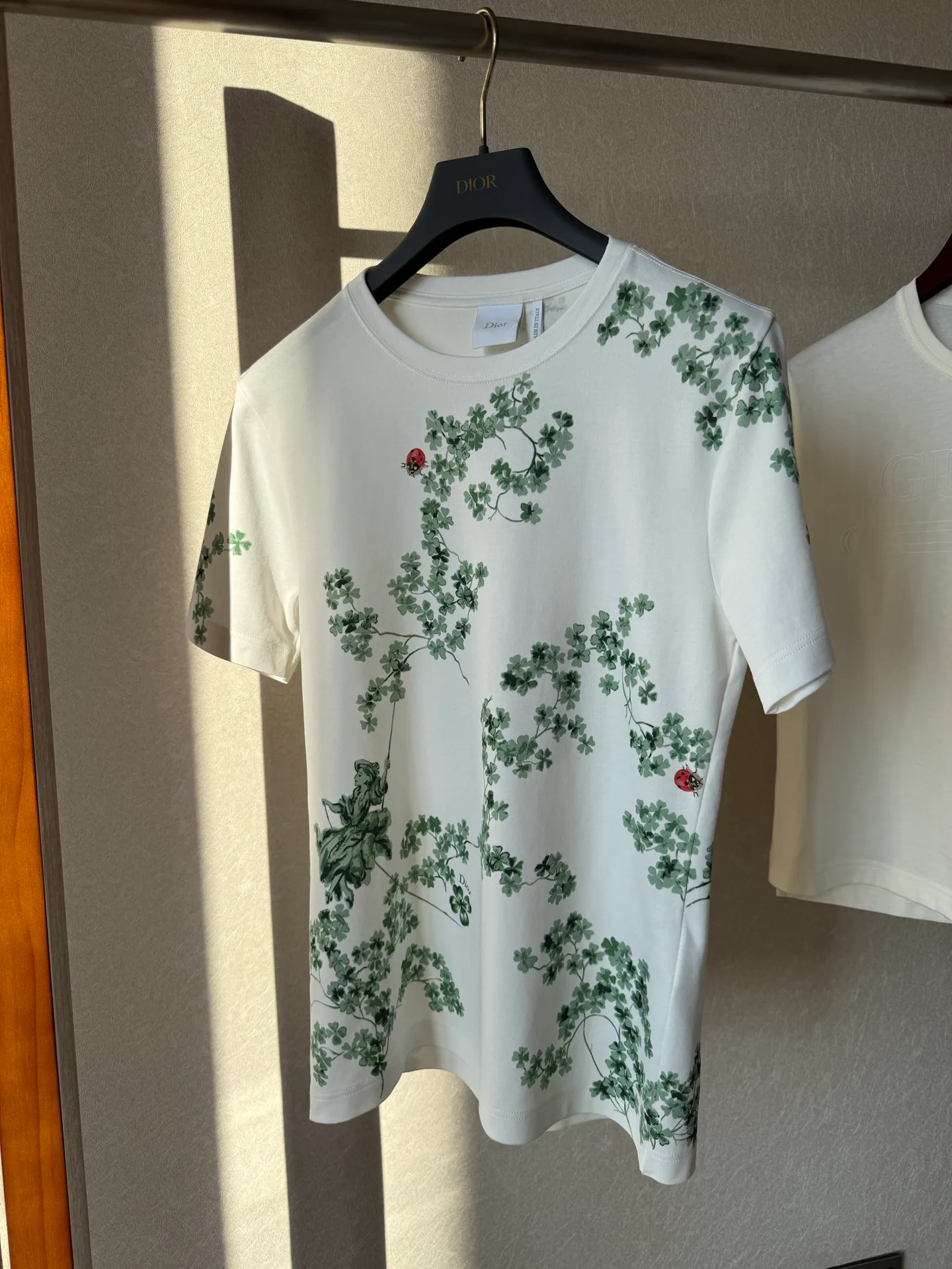 Футболки женские CHRISTIAN DIOR — модель с принтом в виде четырёхлистного клевера и божьей коровки, навеянная стилем XVIII века. Изделие выполнено из белой хлопковой ткани с облегающим кроем. Футболку украшают логотип и изображение насекомого, что добавляет образу индивидуальности. Её можно комбинировать с различной одеждой в течение всего года.