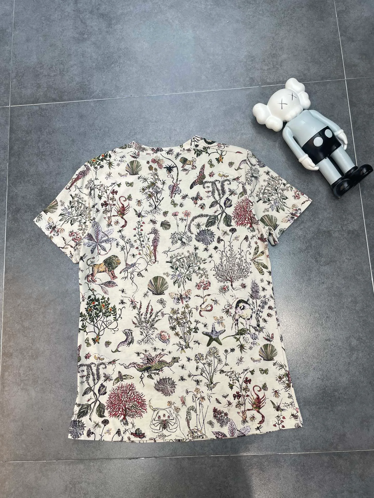 Футболка имеет классический крой с короткими рукавами, который подчеркивает фигуру и добавляет вашему образу стильный акцент. Яркий и оригинальный принт, оформленный в виде тропических цветов, создает свежий и живой вид, подходящий для различных случаев – как для повседневной носки, так и для более нарядных выходов.