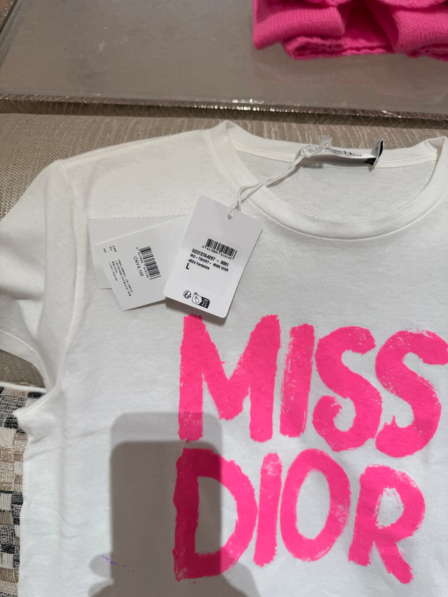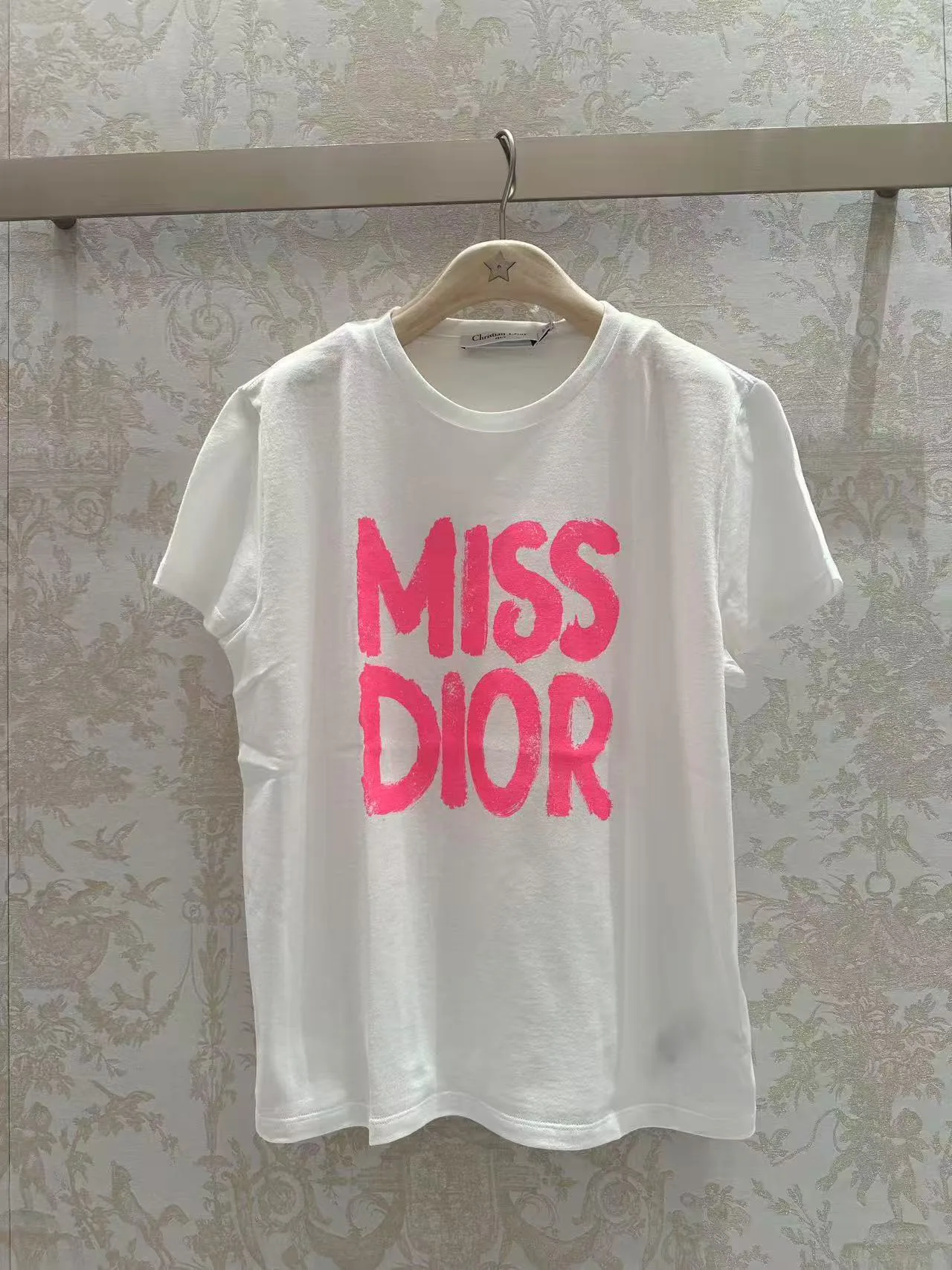 Главная изюминка изделия — яркое неоновое розовое название "MISS DIOR", эффектно нанесенное на передней части. Этот смелый элемент дизайна не только привлекает внимание, но и подчеркивает высокий статус и модные предпочтения своей обладательницы. Футболка отлично вписывается как в повседневные, так и в более нарядные образы, позволяя создать множество стильных комбинаций. Будь то прогулка по городу или встреча с друзьями, эта футболка станет ярким акцентом вашего образа, отражая вашу уверенность и чувство стиля.