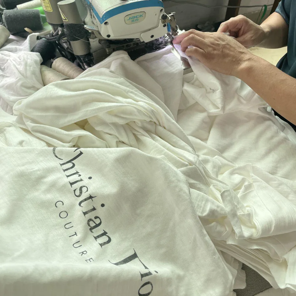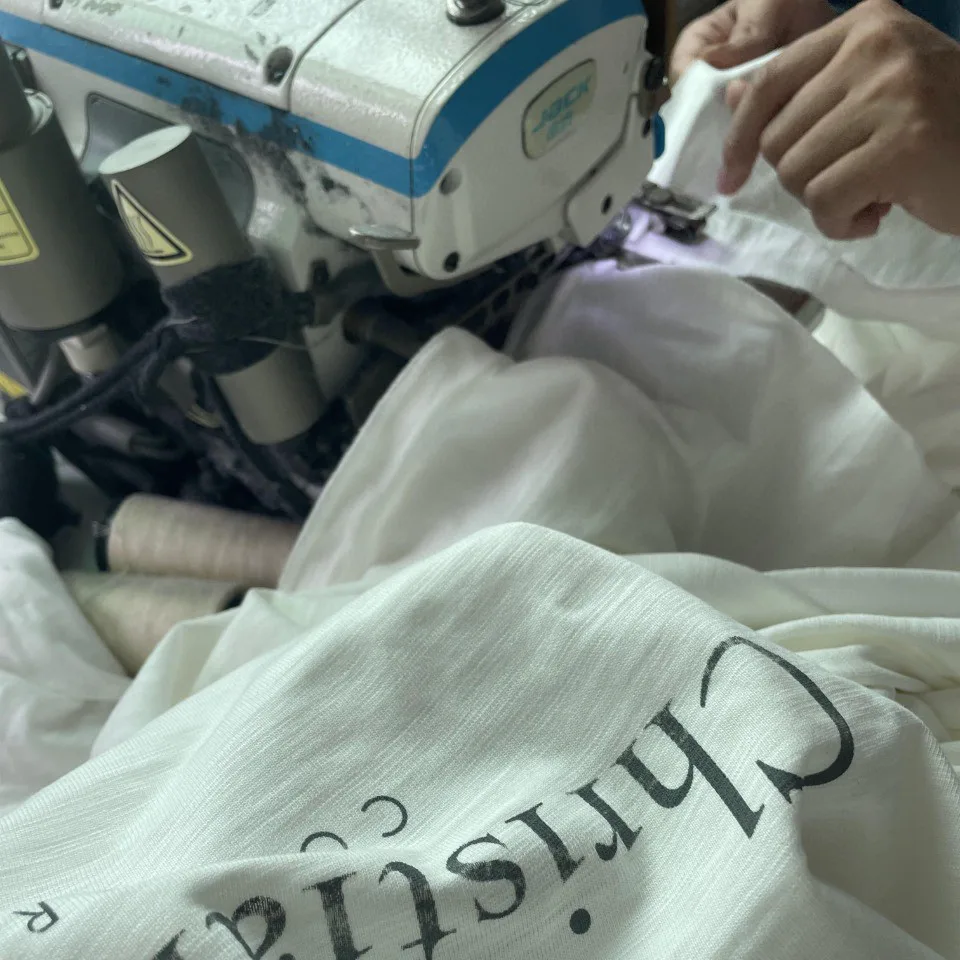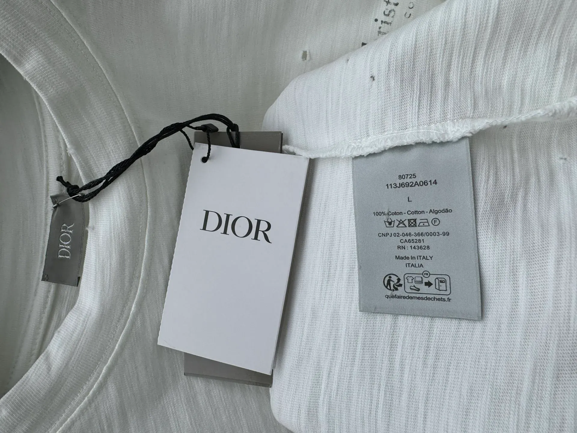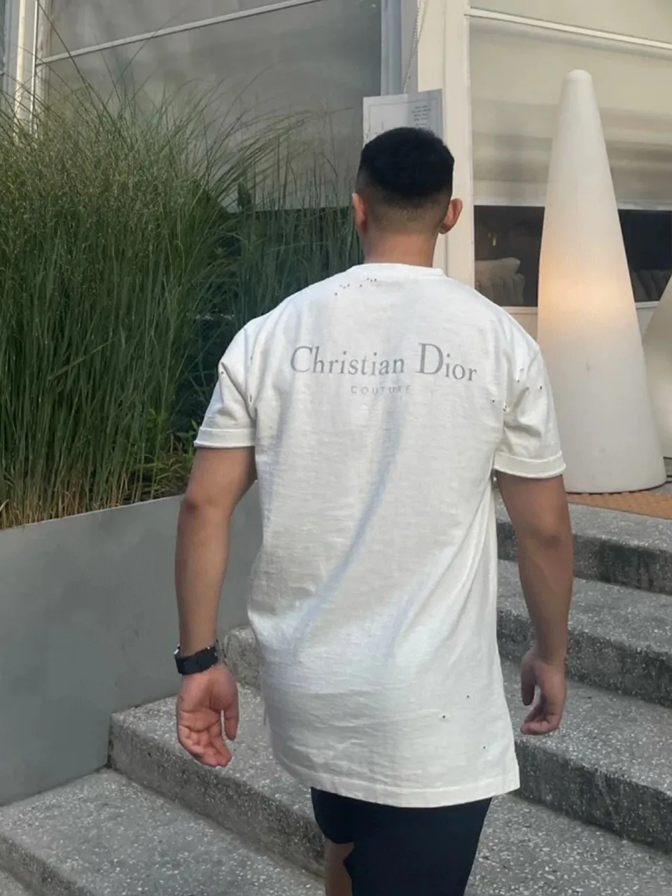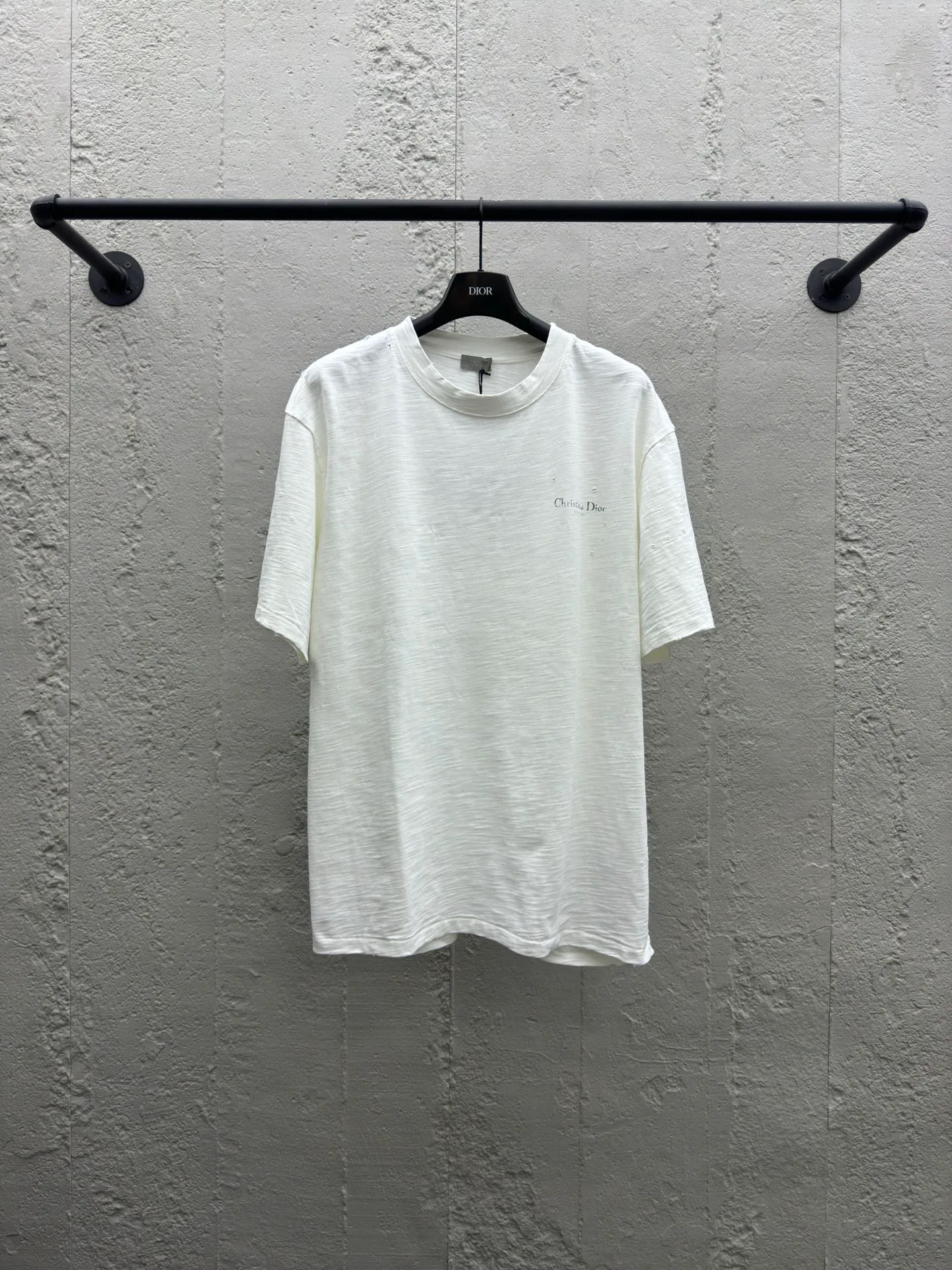 Футболка имеет круглый вырез, обшитый тем же материалом, а ручная работа полягает в точной настройке с помощью специальных швейных машин. Уникальность этой модели подчеркивается оригинальной печатью, выполненной методом ручной сеточной печати, которая создает эффект исчезающих букв на ткани.