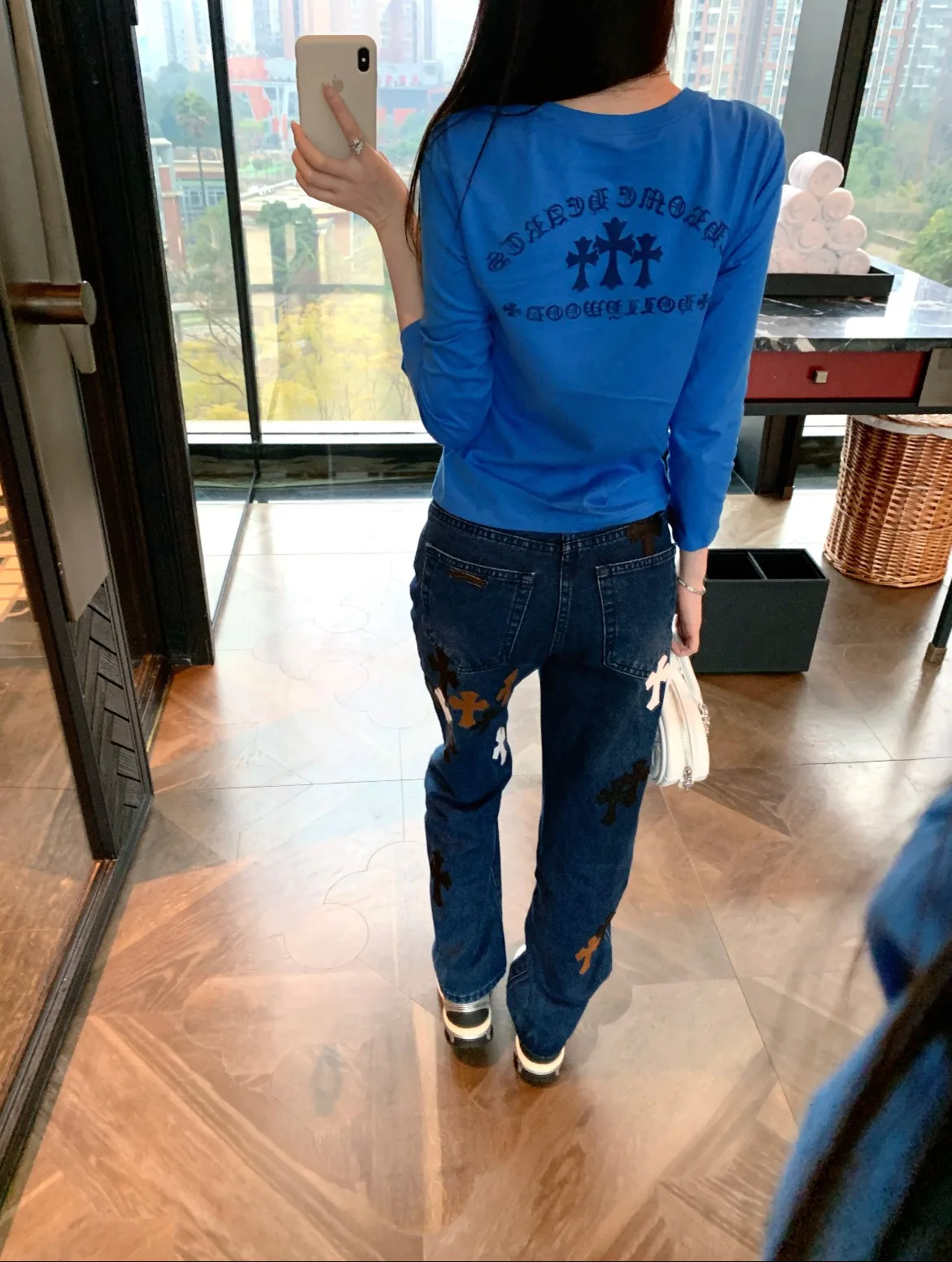 На спине изделия расположен крупный принт с названием бренда CHROME HEARTS, дополненный декоративными элементами, что придает футболке уникальность и оригинальность. Мягкий и приятный на ощупь материал, вероятно, хлопок или его смесь, обеспечивает комфорт в носке на протяжении всего дня.