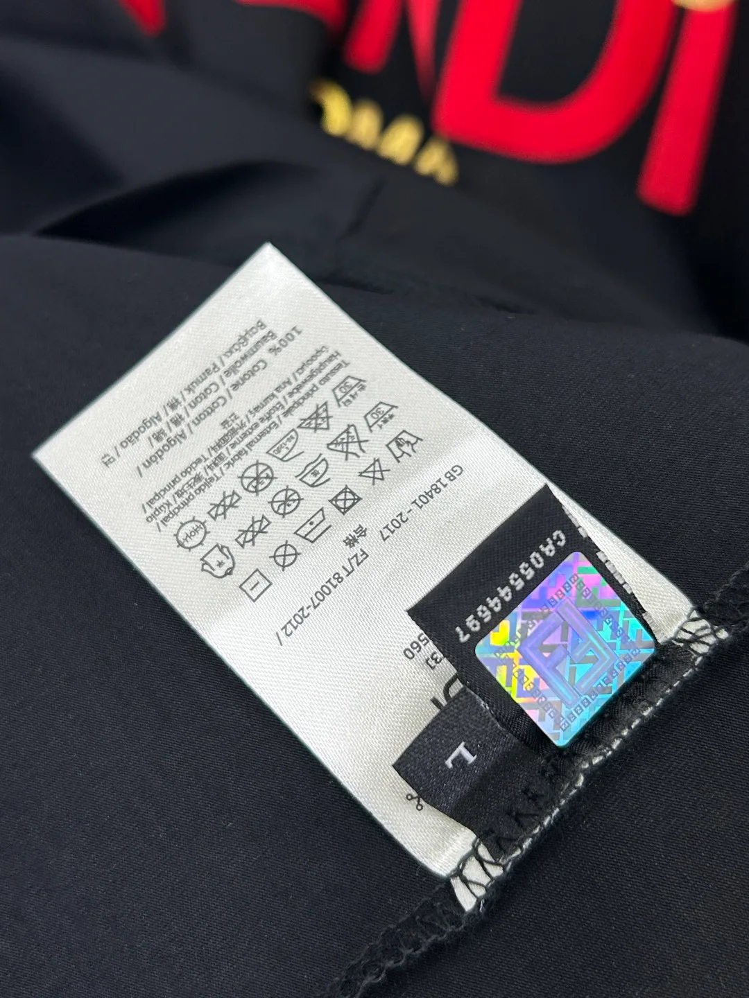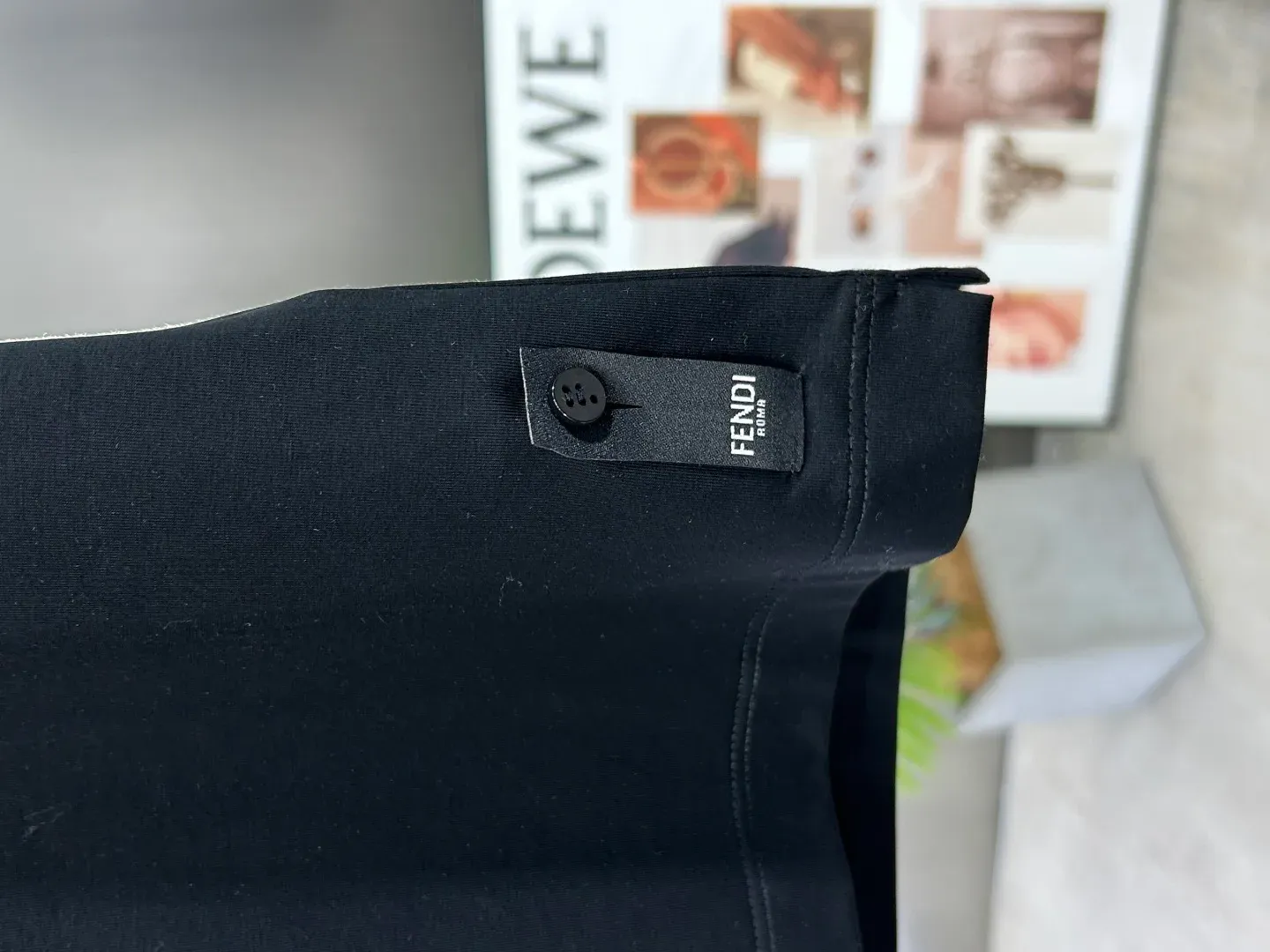 Футболка также имеет разрезы по бокам, что добавляет современный штрих к классическому силуэту. В нижней части изделия размещена нашивка с логотипом FENDI и декоративная застежка с пуговицей в форме буквы "F", выполненная из перламутра, которая придает модели оригинальности.