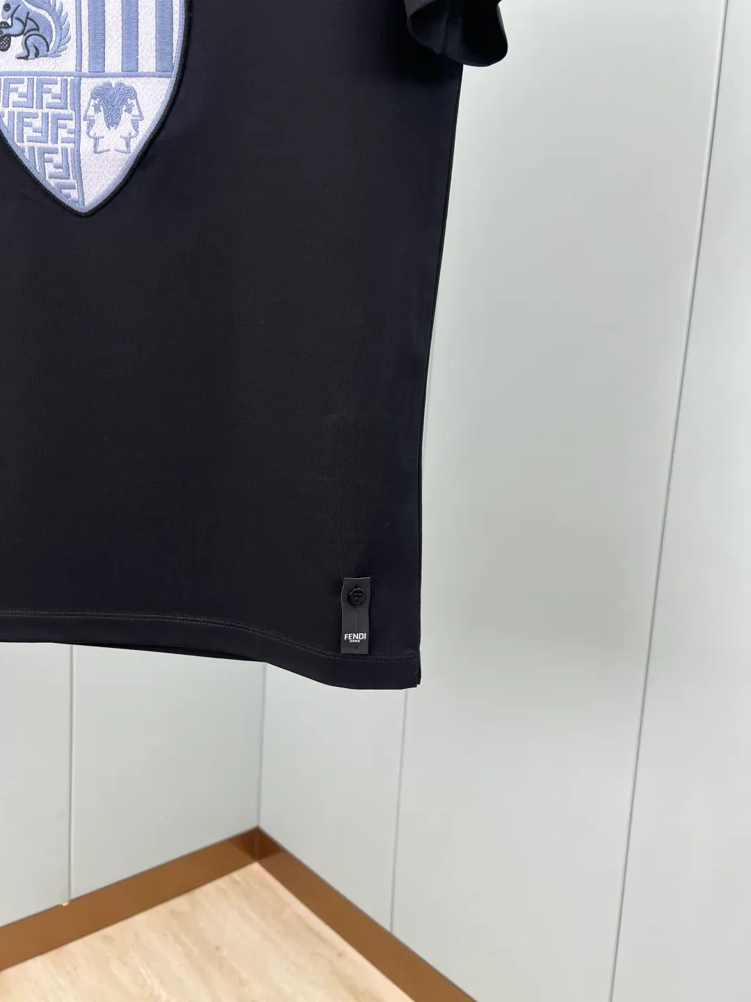 Футболка выполнена из высококачественного двойного мерсеризованного хлопка, что обеспечивает комфорт и долговечность. Дизайнерские акценты включают нашивку с логотипом FENDI на нижнем крае и пуговицу из перламутра с пятью отверстиями в форме буквы F, подчеркивающую эксклюзивный стиль бренда.