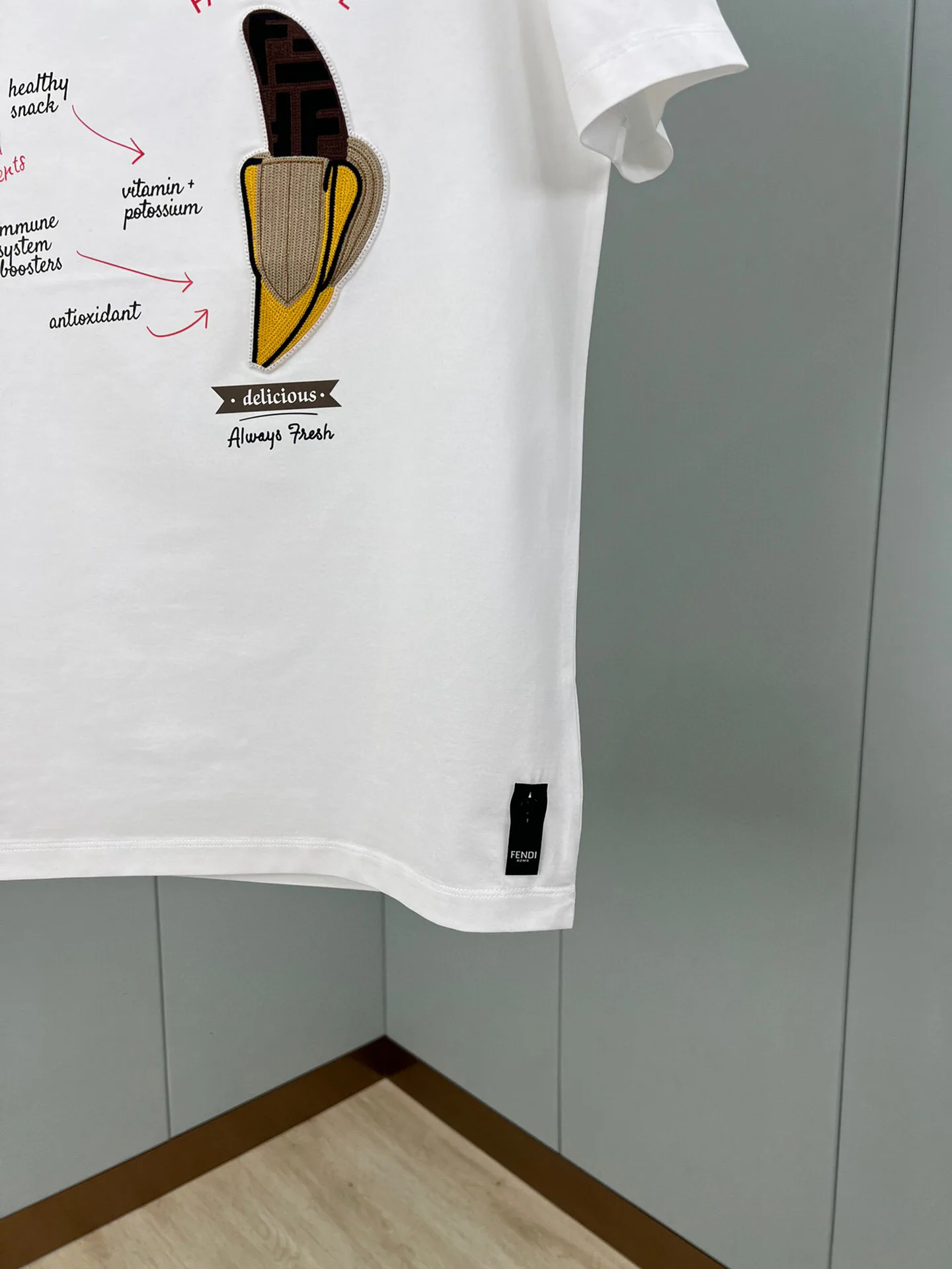 Футболка украшена ярким контрастным принтом с изображением забавного банана и оригинальной надписью 'Fendilicious', выполненной с использованием вышитых деталей. Это придает изделию уникальный стиль и делает его идеальным вариантом для повседневной носки.