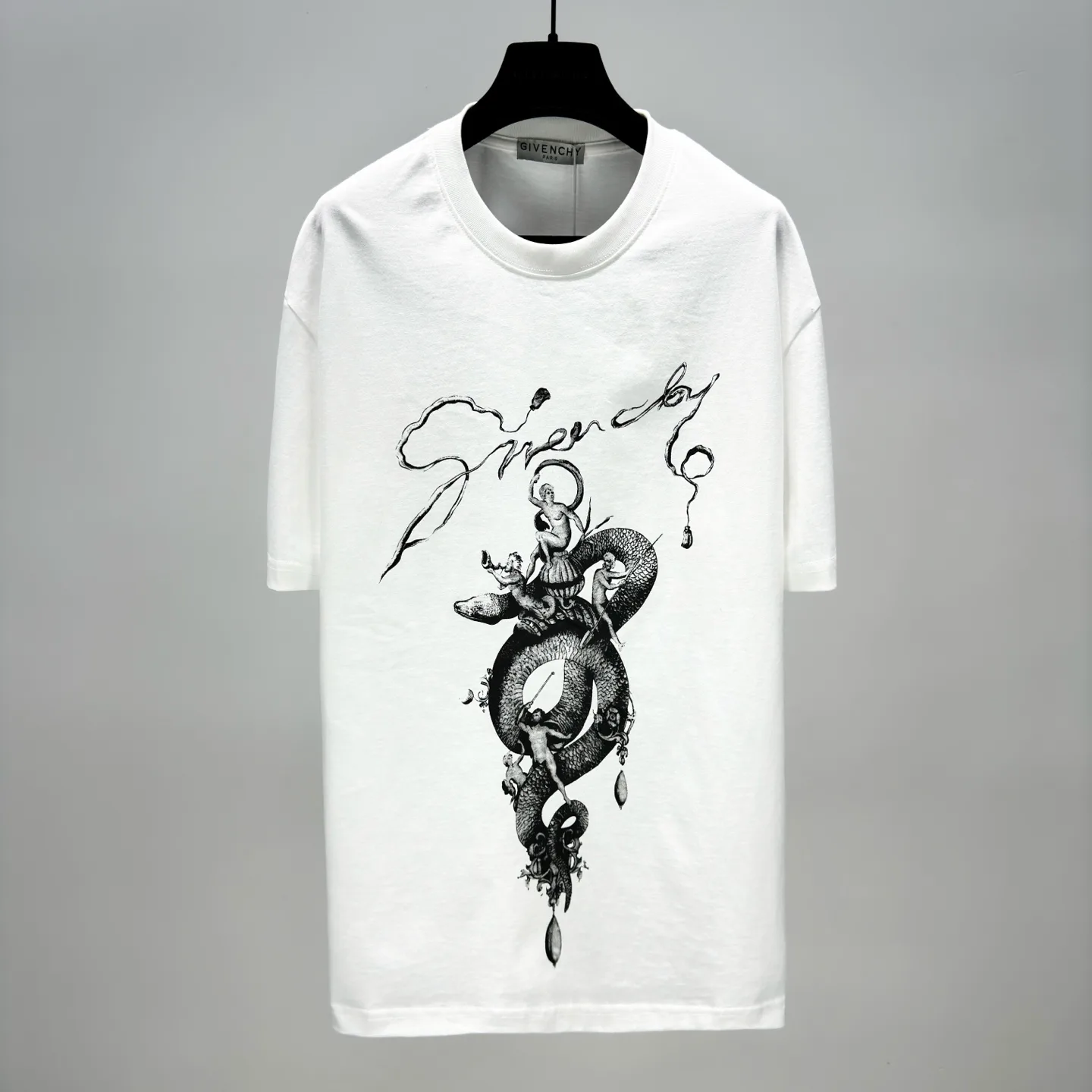 Футболка имеет классический круглый вырез и декорирована принтом, который включает логотип G1VENCHY и графические элементы в виде змеи и люстры. Этот дизайн делает образ ярким и выразительным, подчеркивая оригинальность и стиль.