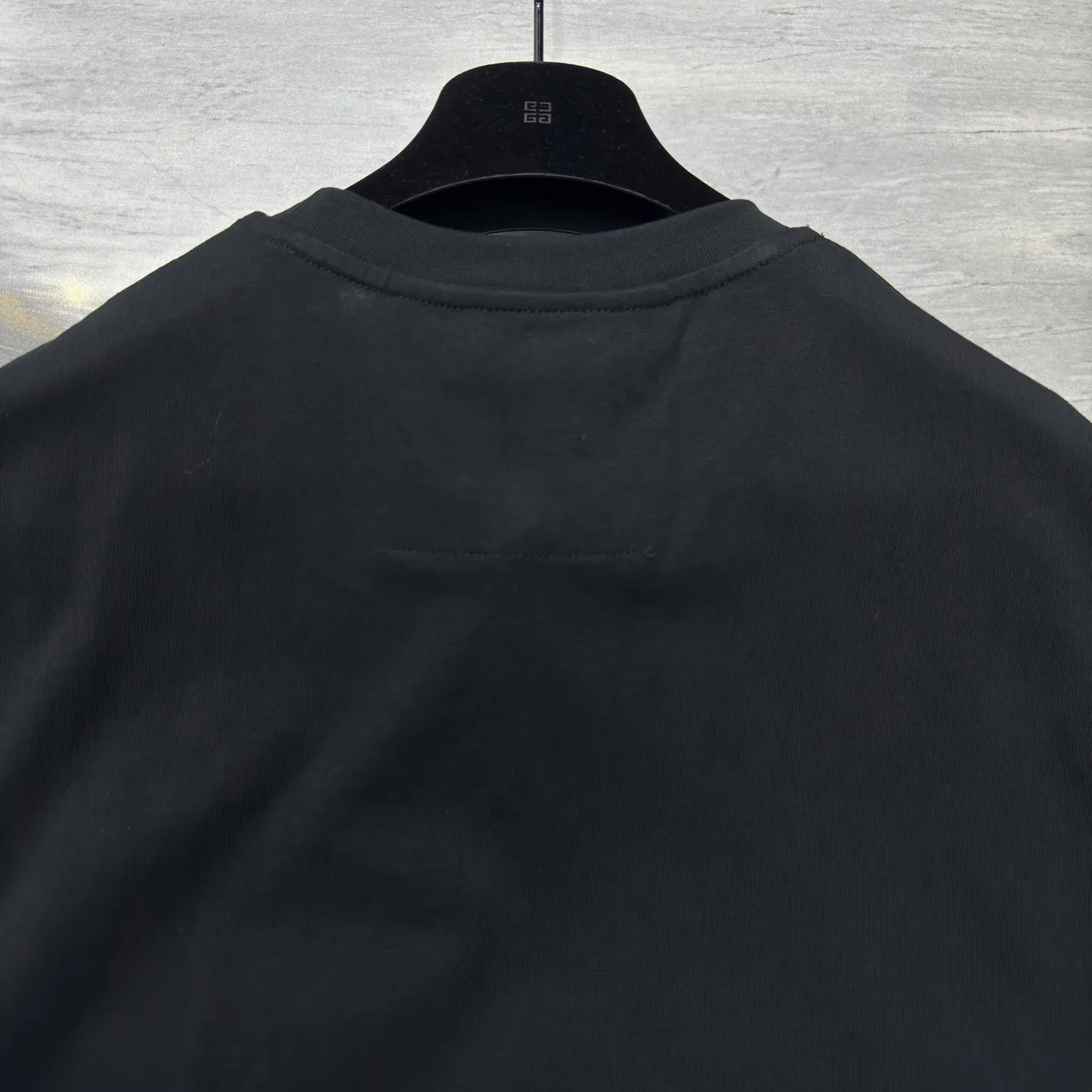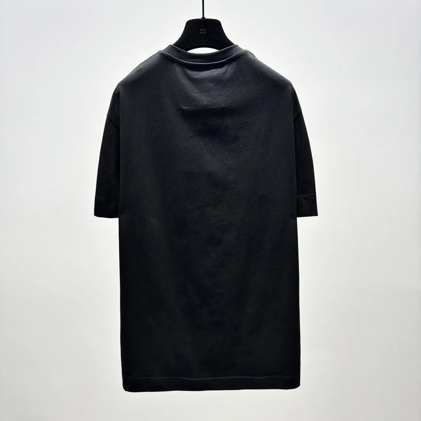 Цвет футболки — классический черный, что делает её универсальным вариантом для любого гардероба. Благодаря своему лаконичному дизайну, эта модель идеально подходит как для повседневной носки, так и для создания стильных образов.
