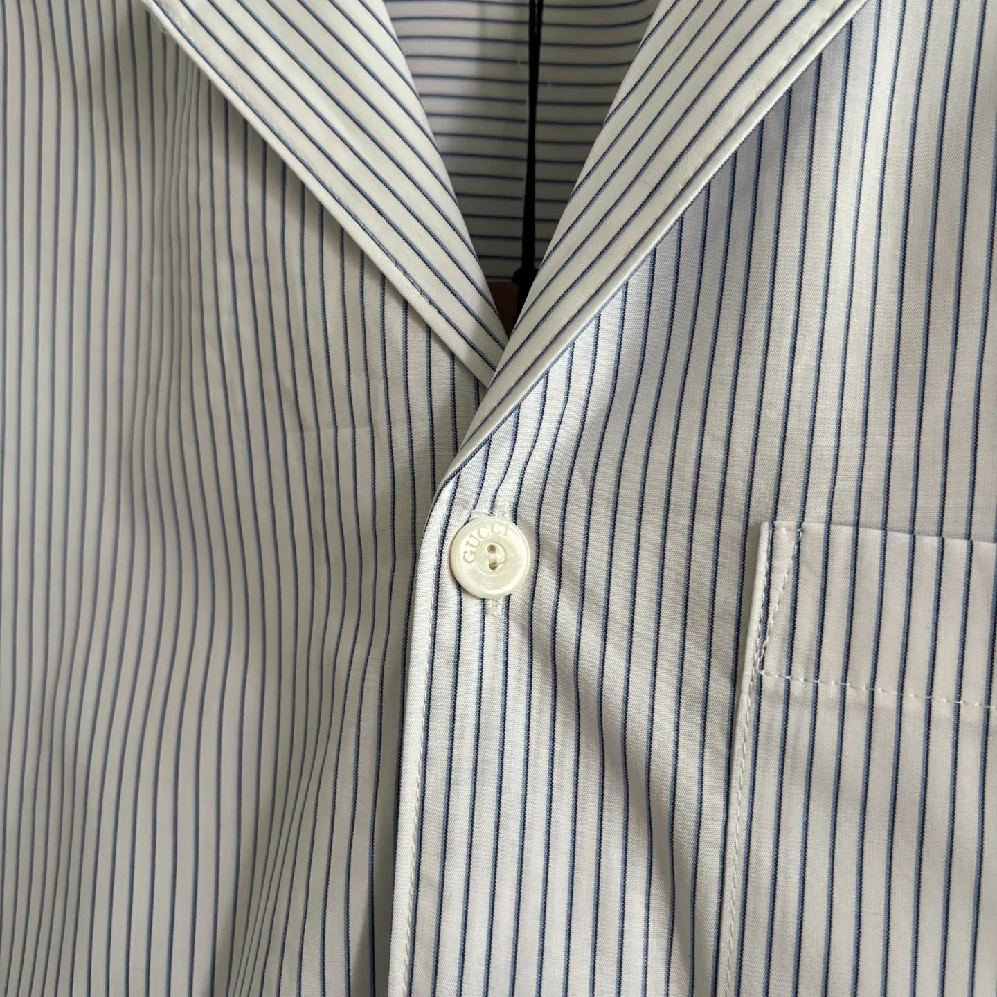 Застежка выполнена на пуговицы с белыми буквенными вставками, что придает изделию оригинальности. Нижняя часть рубашки дополнена разрезами, что делает силуэт более стильным и современным. Благодаря слегка свободному крою данная модель подходит как для мужчин, так и для женщин, обеспечивая универсальность в использовании.
