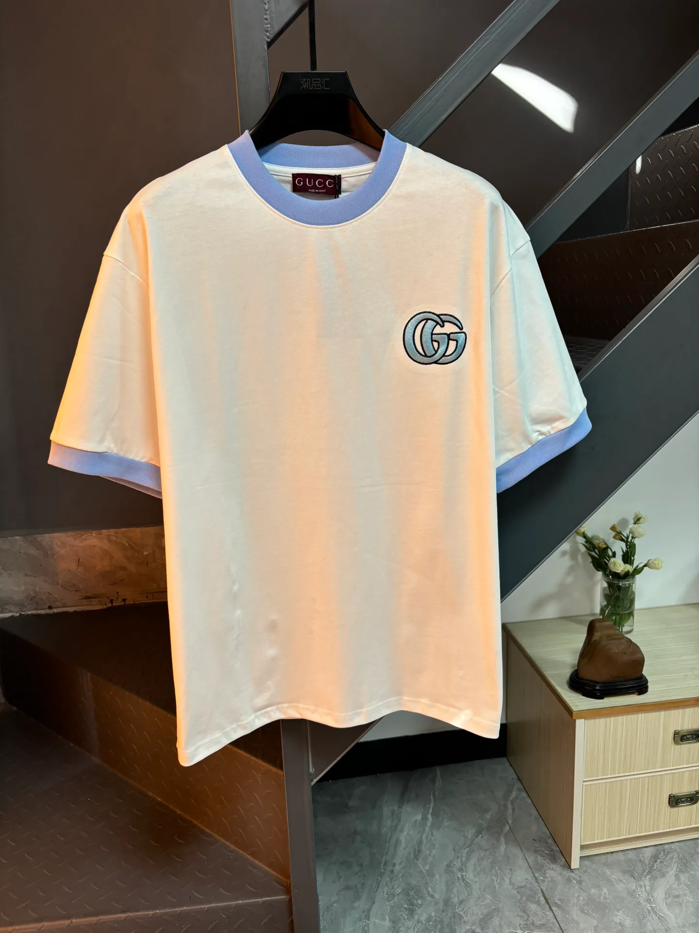 Особенность модели — воротник светло-голубого цвета, контрастирующий с основной черной частью изделия. На груди расположен элегантный логотип GG, символ престижного бренда, что добавляет футболке нотку роскоши.