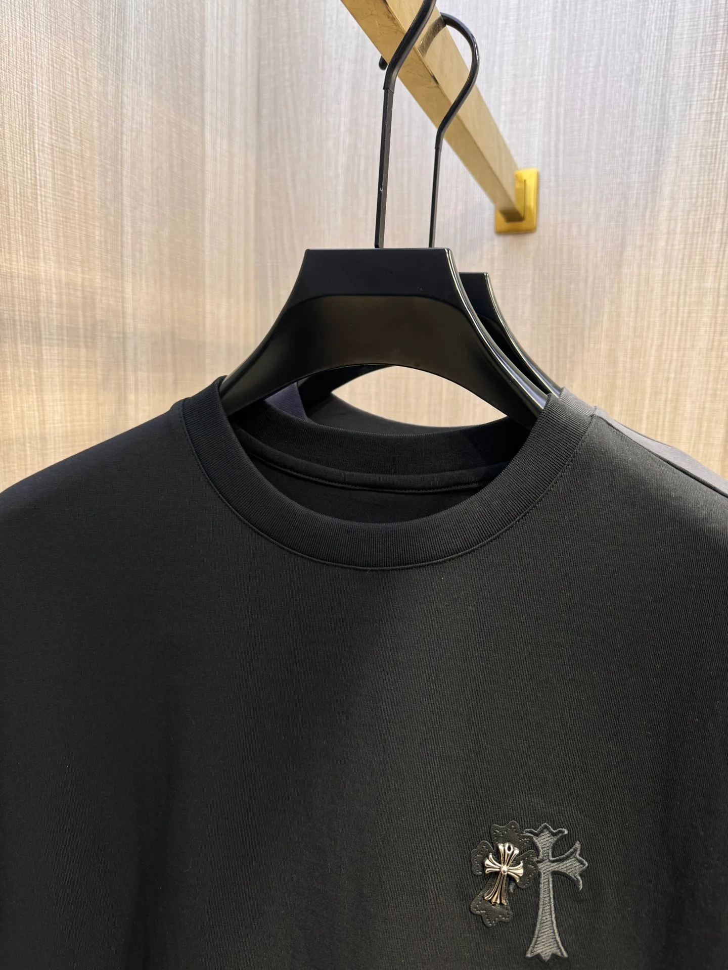Футболка оснащена характерным крестовым логотипом на груди, который прекрасно дополняет вертикальный рисунок на спине. Оба элемента выполнены с использованием высококачественной технологии лазерной аппликации и 3D-вышивки, что придает изделию элегантный и многослойный вид. Мягкая пряжа с легким эффектом состаривания создает ощущение уникальности и стиля, а дополнительная отделка на задней части шеи и по бокам подчеркивает внимание к деталям и высокий уровень исполнения.