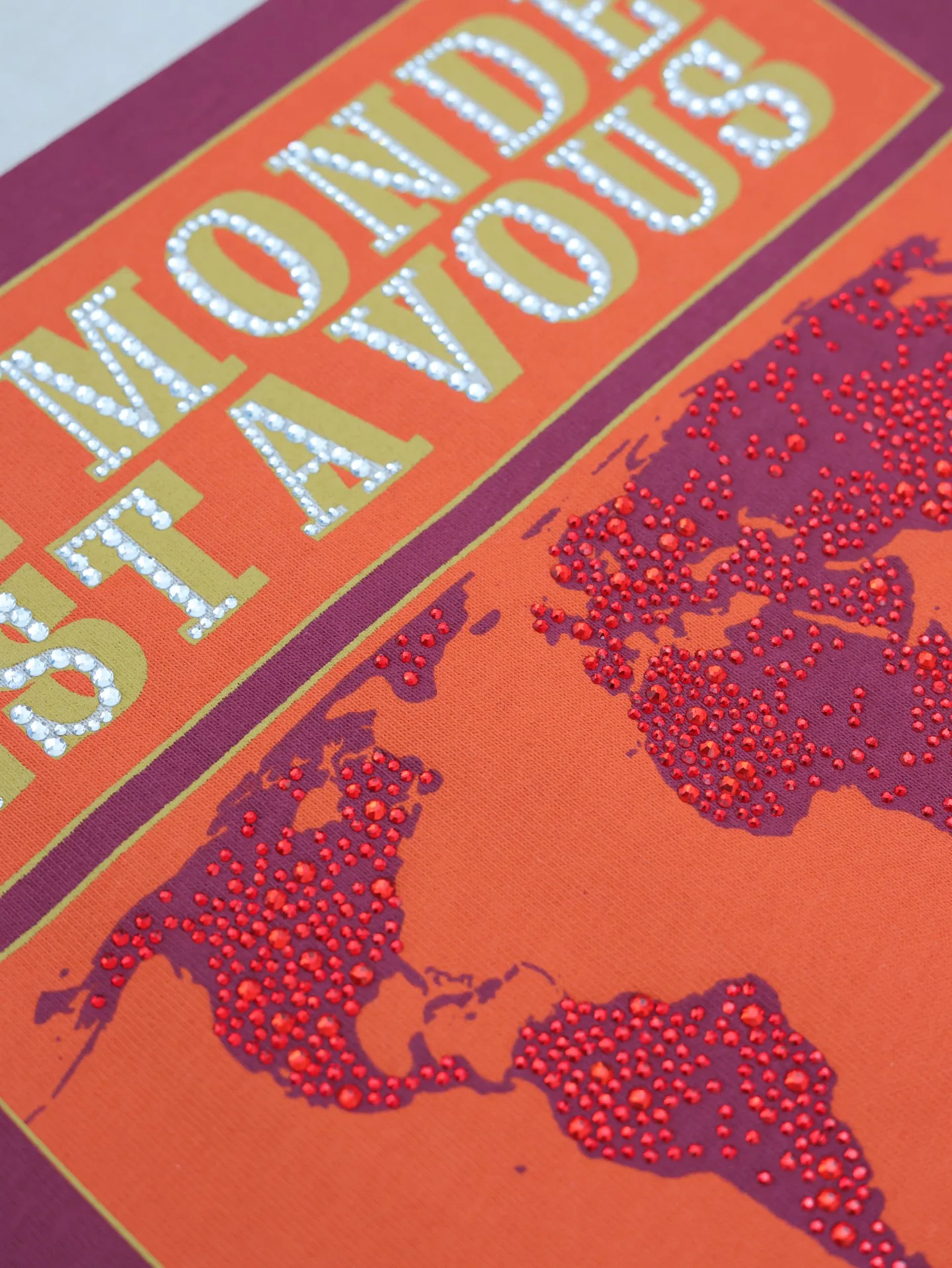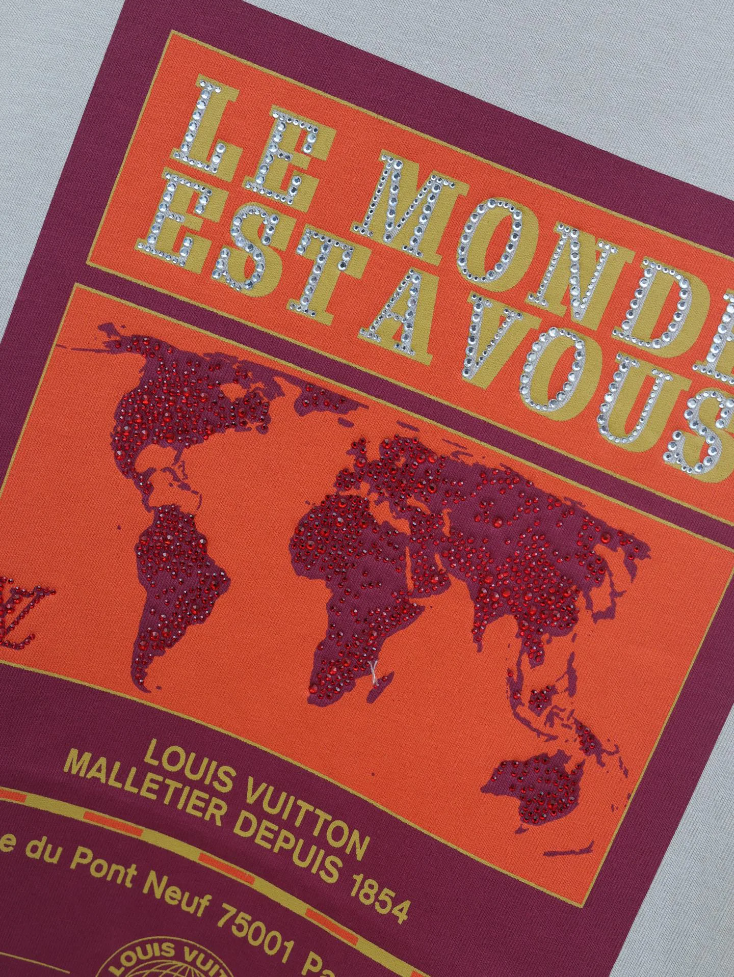 Футболка была представлена на модном показе весна-лето 2025 года и привлекает внимание своим выразительным дизайном. На передней части изделия изображен яркий и теплый мир, выполненный в коричневых и оранжевых тонах, который символизирует путешествия и открытие новых горизонтов. Слова "Le Monde Est À Vous" (Мир – это ваш) вдохновляют на активные приключения и стремление к новым открытиям.