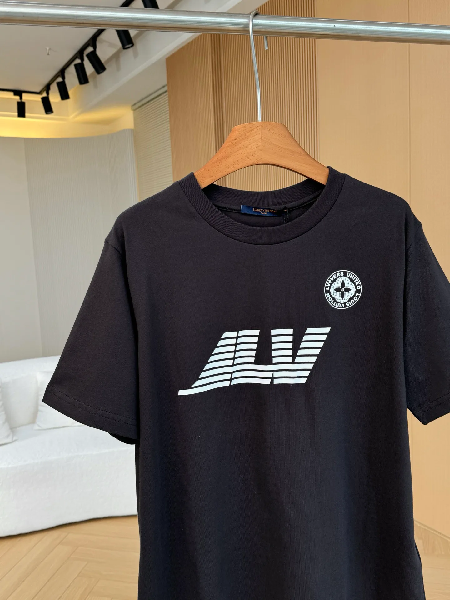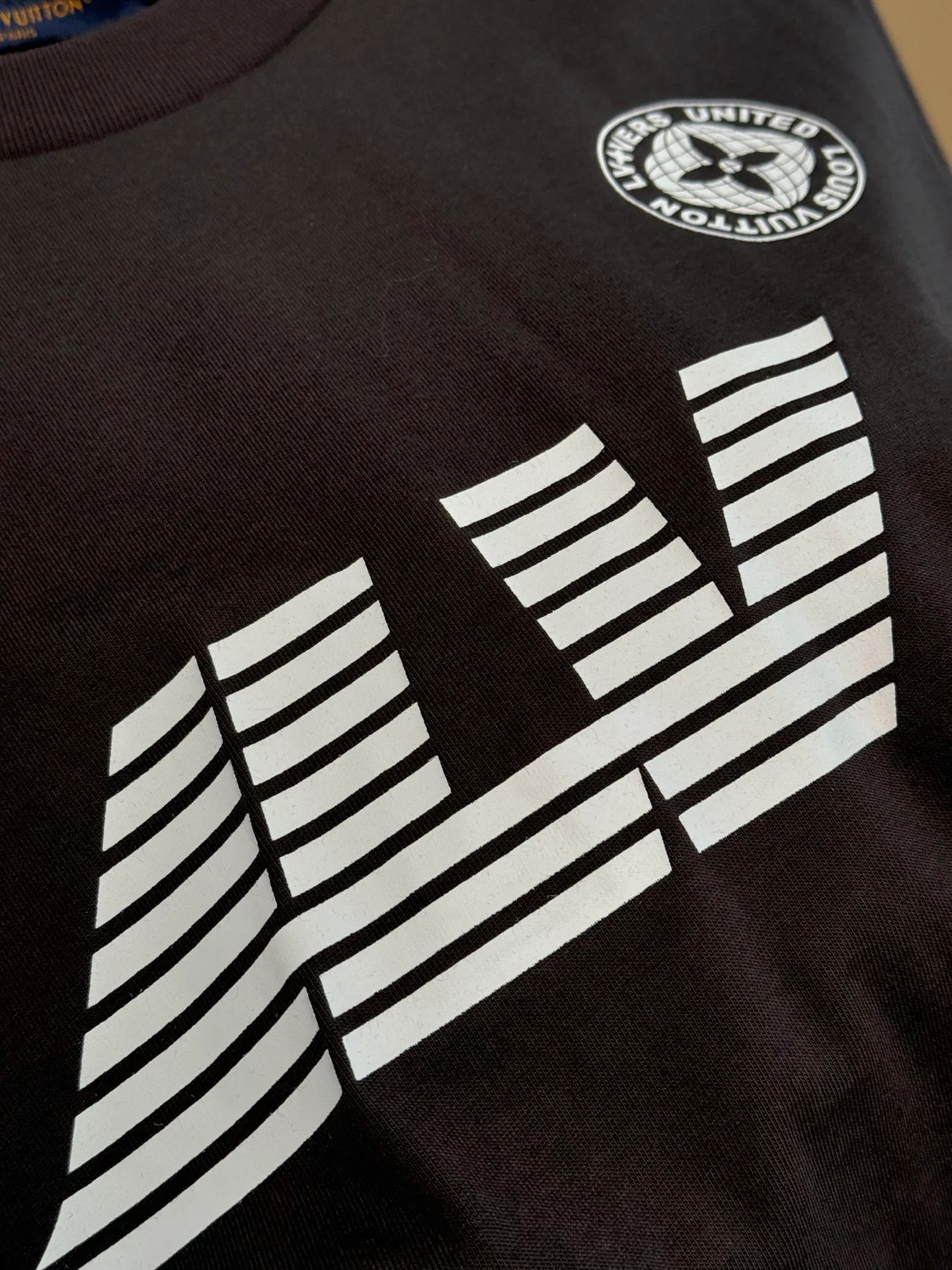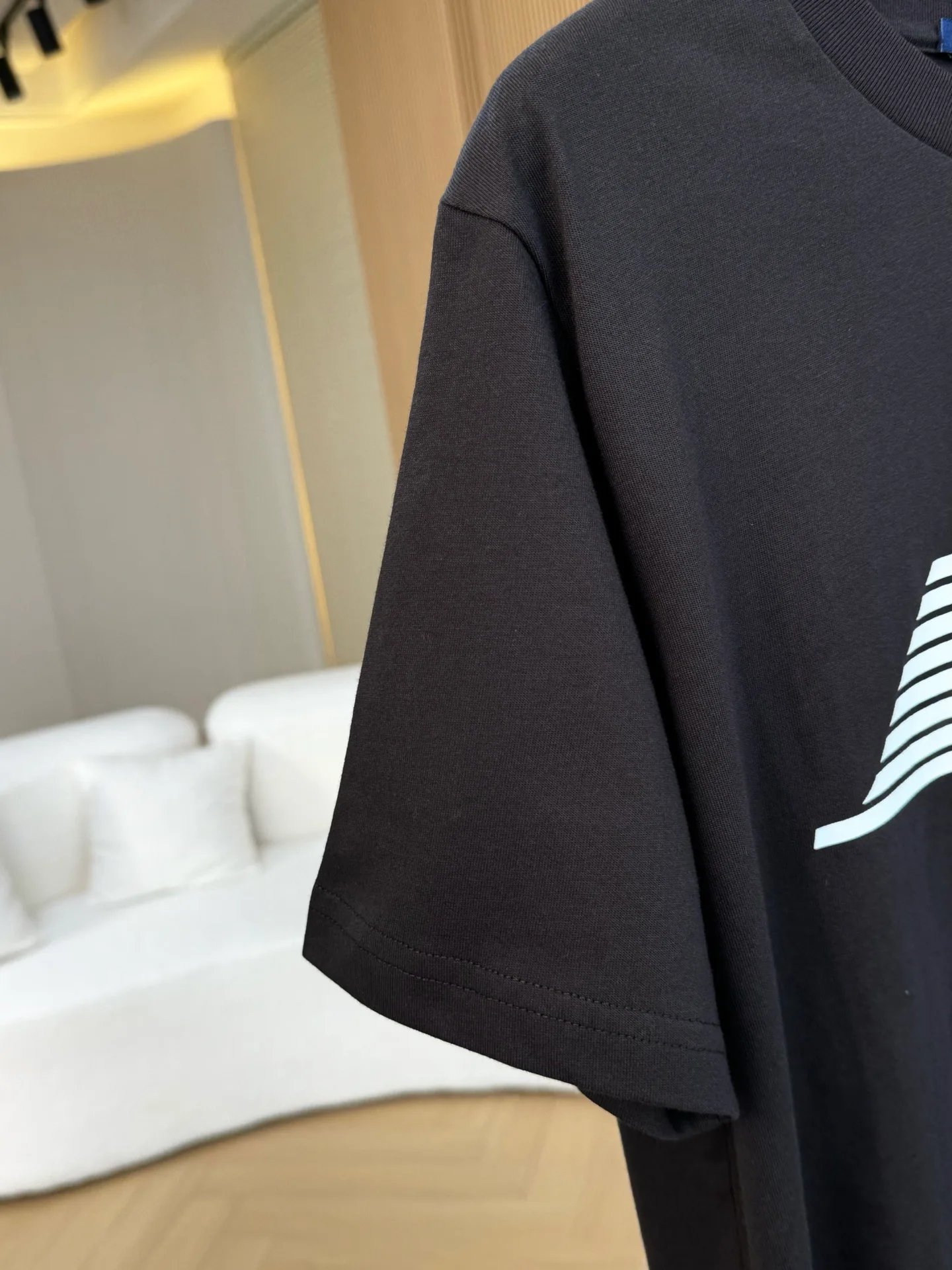 Окантовка рукавов и подола выполнены с тонкой и аккуратной строчкой, что гарантирует долговечность и придает изделию изысканный вид. Основной цвет черно-коричневый создает ощущение лаконичности и элегантности. Эта футболка является классикой моды и легко комбинируется с различными предметами гардероба. Свободный крой и короткие рукава обеспечивают удобство и расслабленный стиль, что делает ее идеальной для повседневного гардероба.