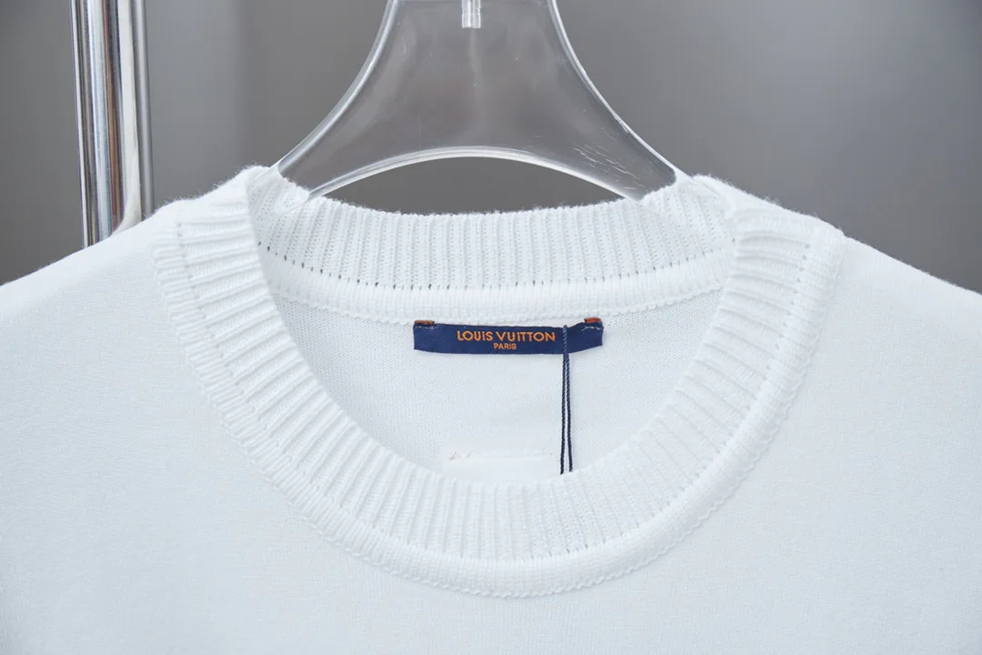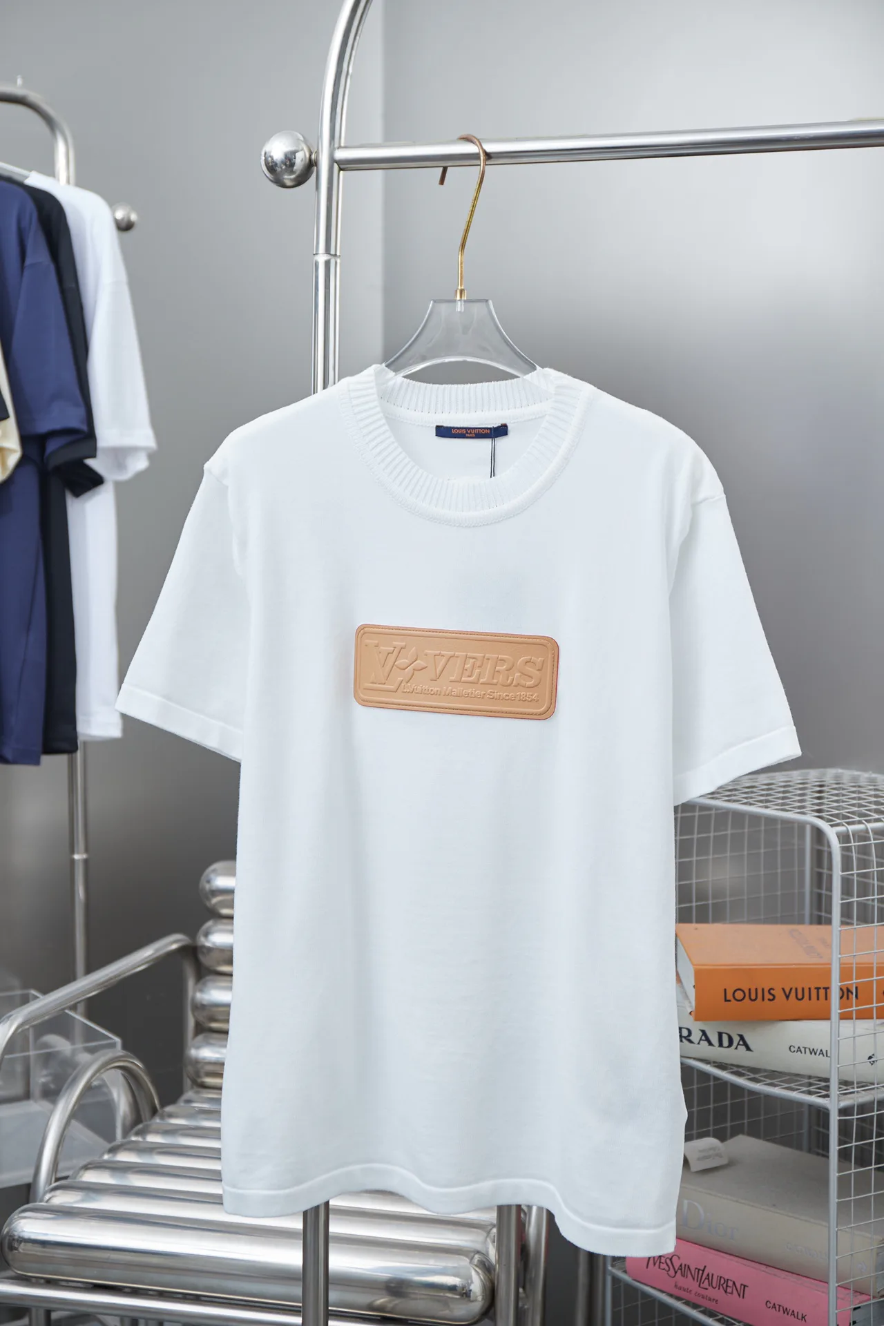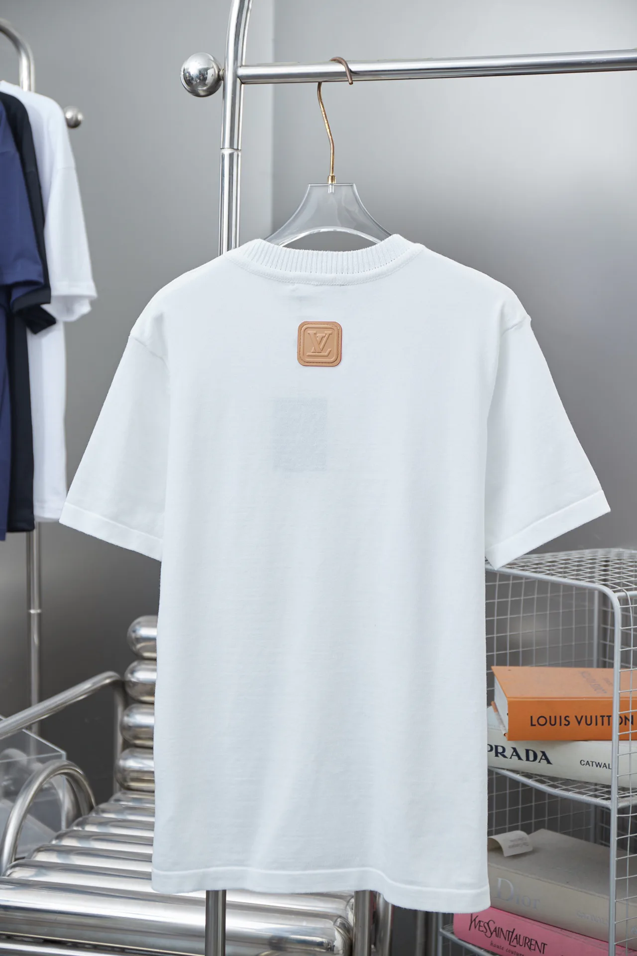 Особое внимание заслуживает стильный кожаный логотип бренда LOUIS VUITTON, расположенный на задней части горловины. Он не только подчеркивает статус и высокое качество изделия, но и придаёт футболке изысканный и современный вид.