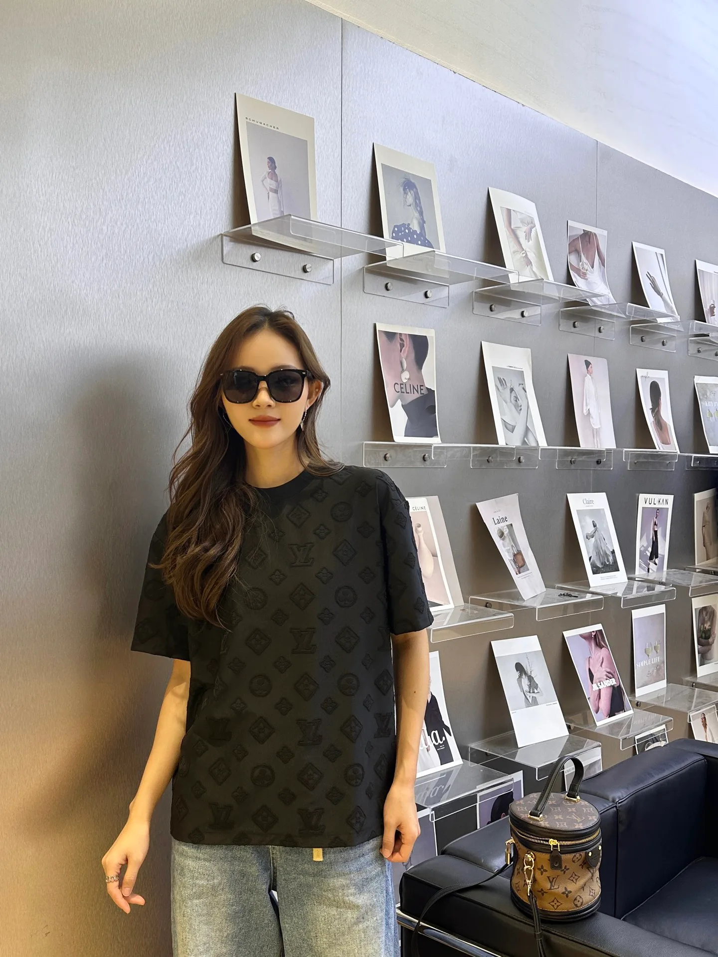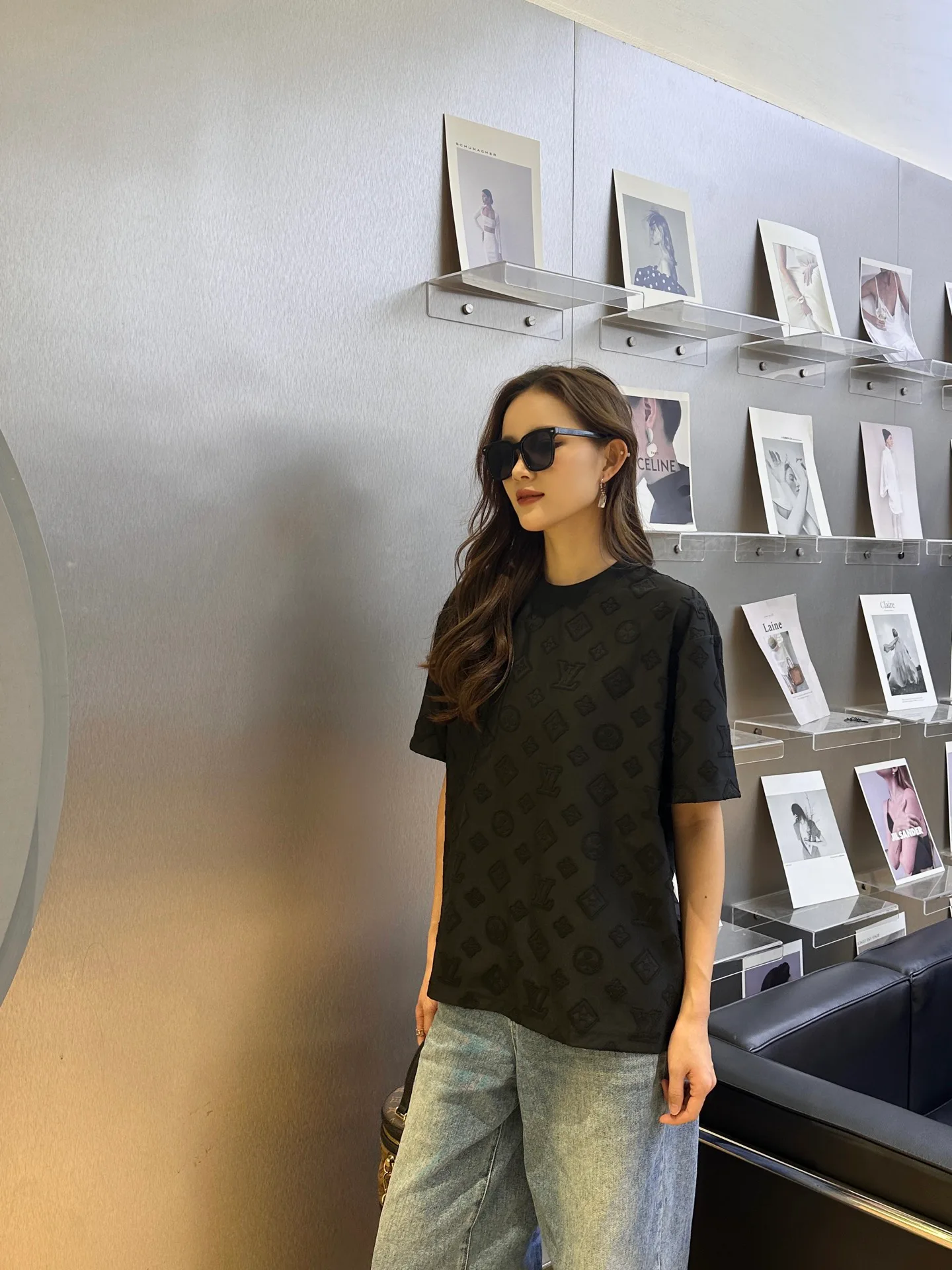 Дизайн футболки подчеркивается темно-серым тиснением с характерным узором LOUIS VUITTON, что придает изделию особую элегантность и фирменный стиль. Краткий силуэт и свободный крой делают эту модель универсальной: она отлично подходит для повседневных образов в стиле casual, а также может быть легко сочетана с более нарядной одеждой для создания эффектного ансамбля.