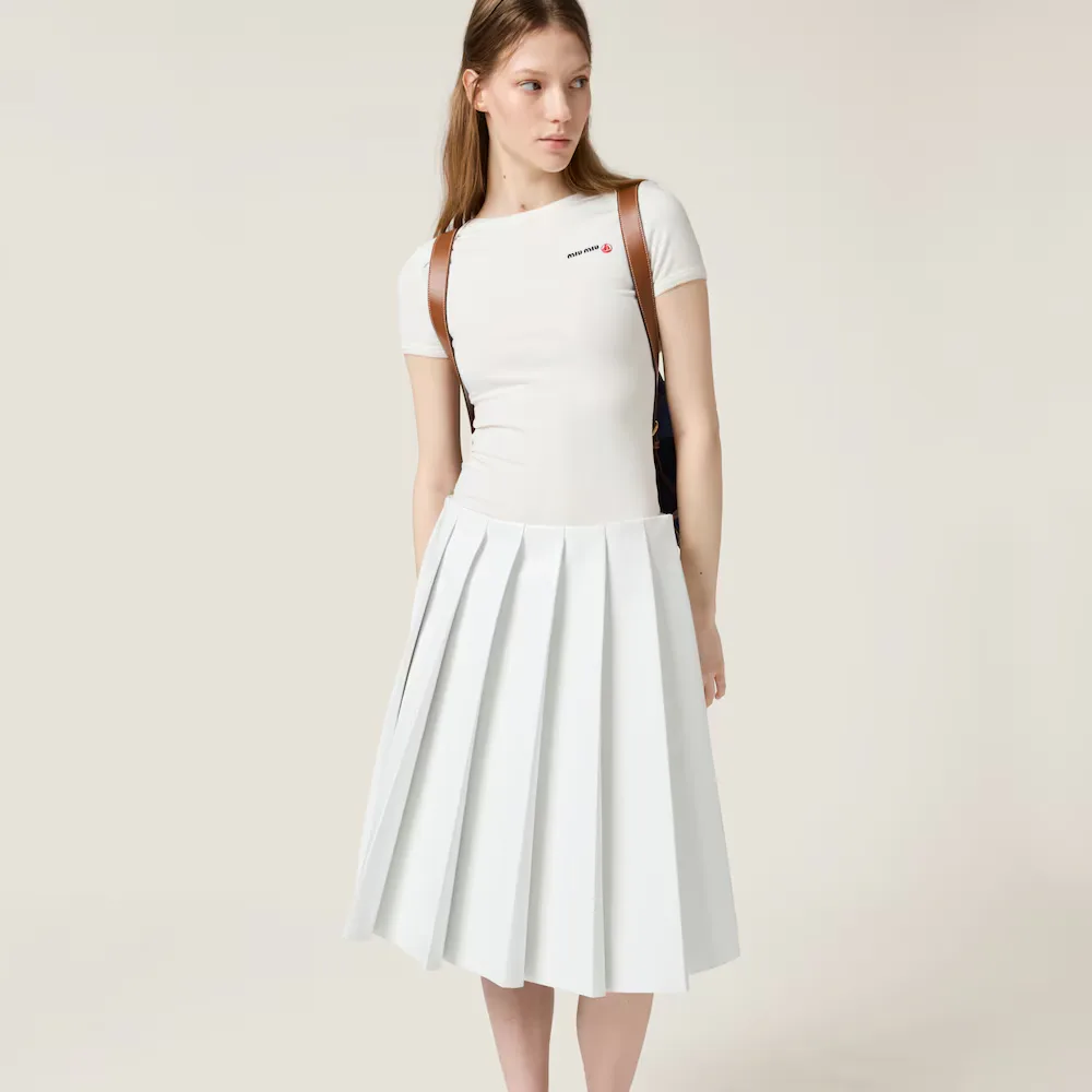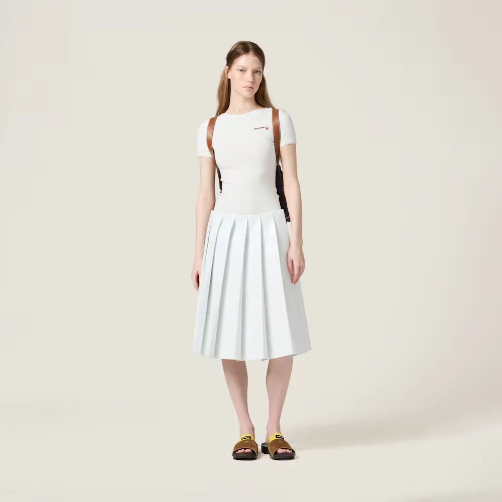 Футболка выполнена из качественного материала, что обеспечивает комфорт и приятные ощущения при носке. Силуэт подчёркнуто облегающий, визуально создаёт эффект стройности и подходит для молодых девушек. Доступна в размерах S, M и L.