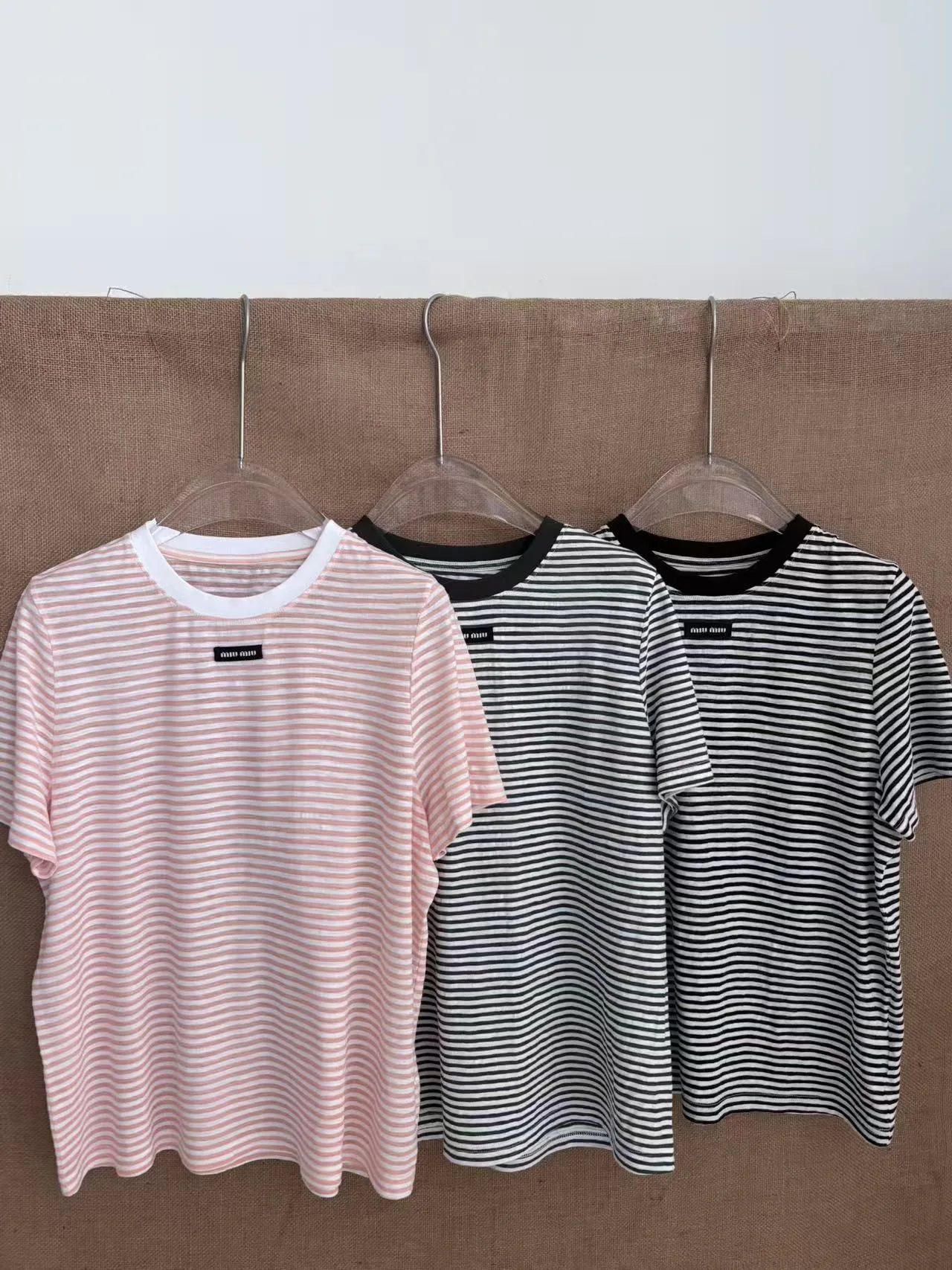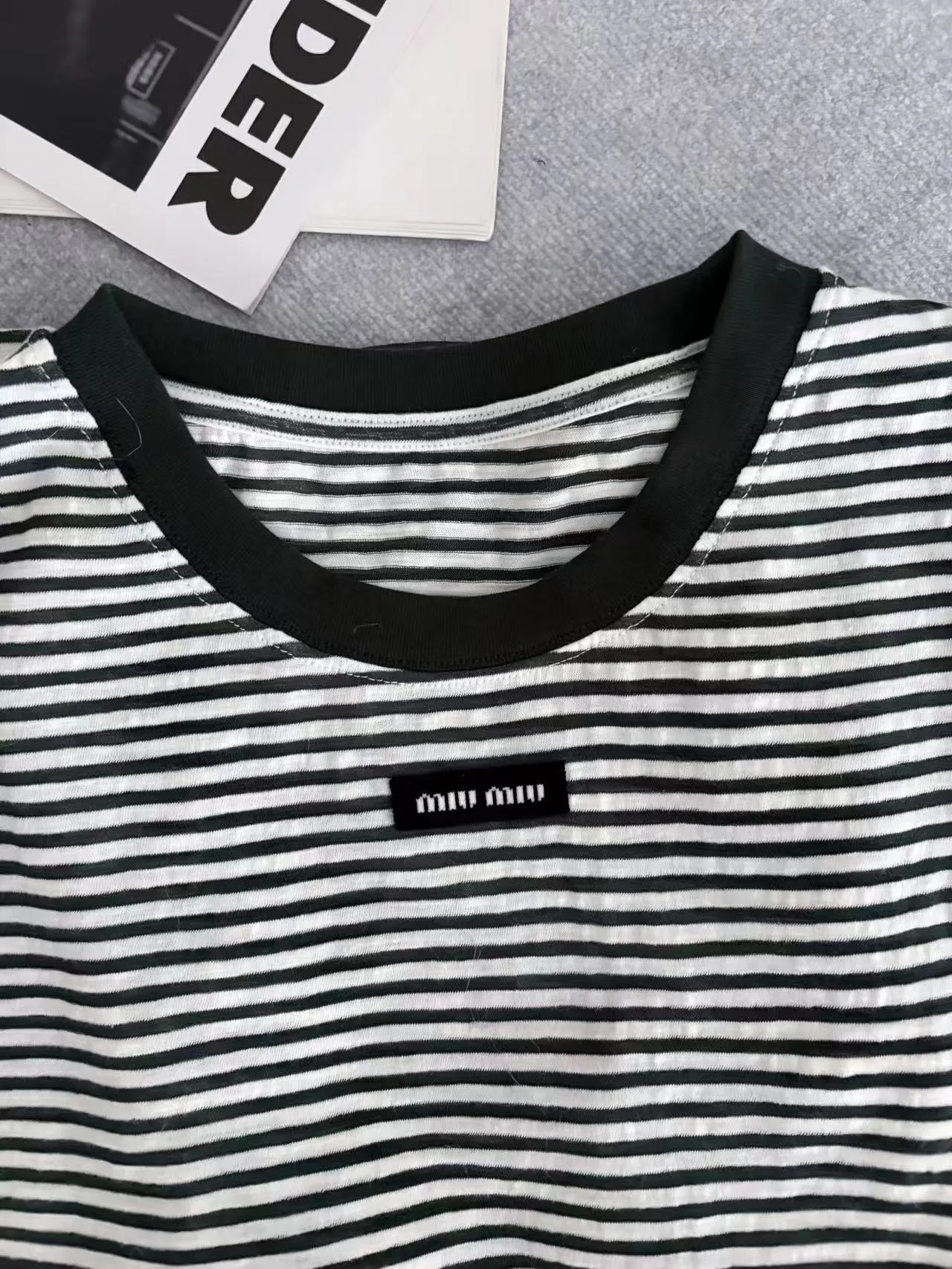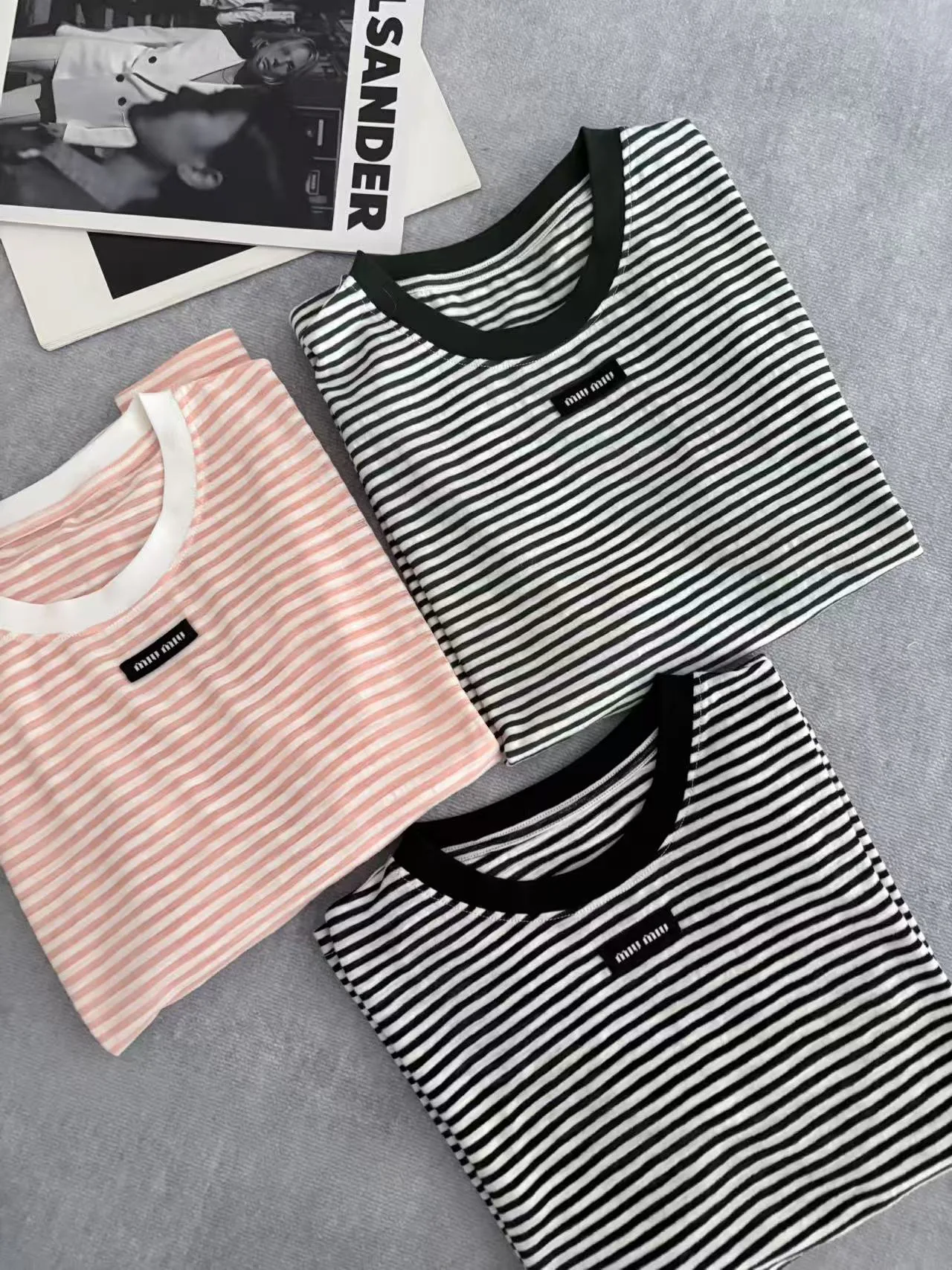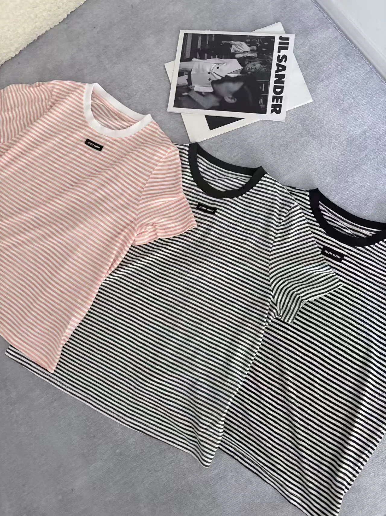 Футболка имеет стильный принт с акцентом на полоску и аккуратно размещённый логотип MIU MIU на груди. Размеры варьируются от S до L, обеспечивая подходящее решение для разных типов фигур. Уход за изделием стандартный, без особых требований.