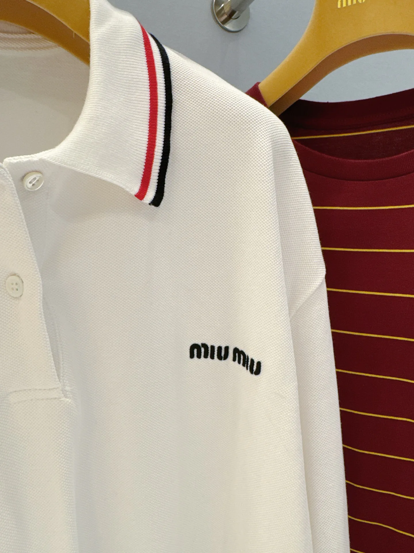 Поло MIU MIU станет отличным выбором для разнообразных ситуаций — от повседневных прогулок до встреч с друзьями. Настоятельно рекомендуем добавить эту модель в ваш гардероб!