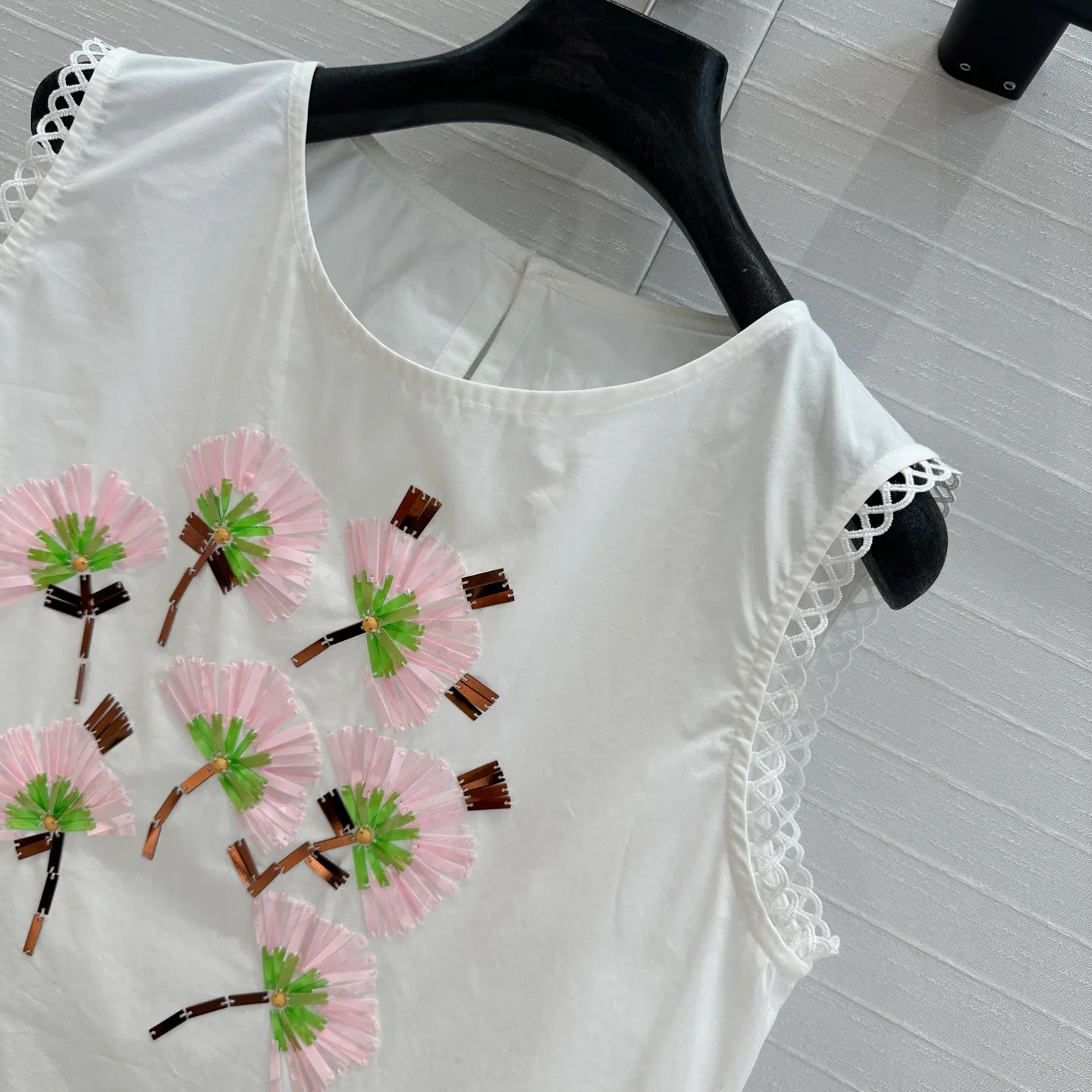 Модель выполнена в пастельных тонах, украшена ручной вышивкой с бисером, что придаёт ей особый шик и утонченность. Дизайн включает в себя эффектные детали, такие как ажурные вставки и цветочные аппликации, которые делают изделие одновременно сладким и современным. Эта блузка подходит для любого типа фигуры и визуально стройнит, благодаря удачному крою и продуманной конструкции.