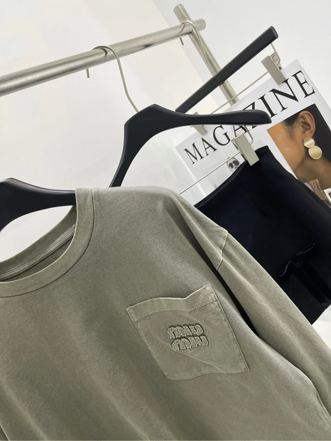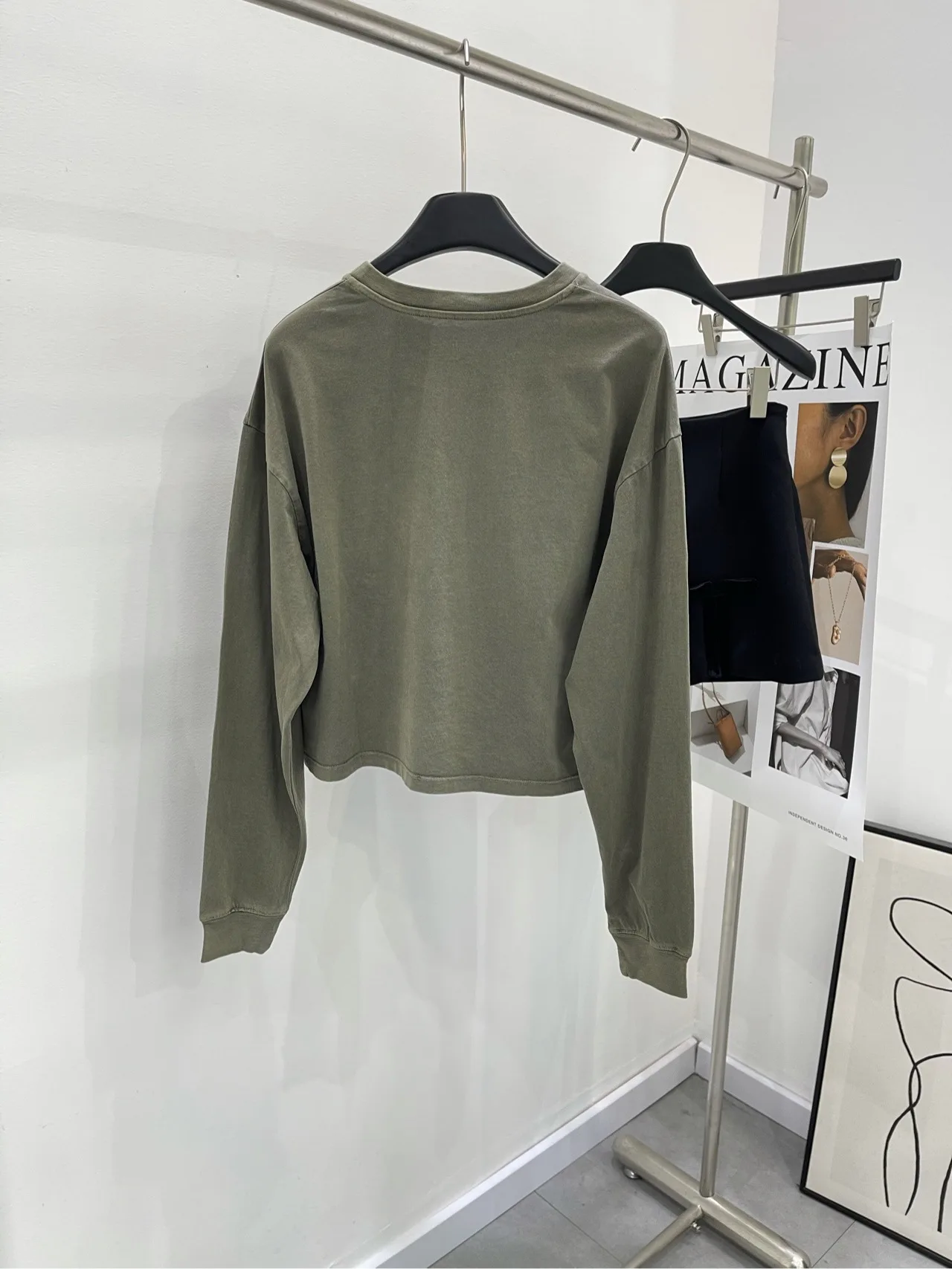 Дизайн включает круглую горловину и короткий крой, акцентирующий внимание на талии. Удлиненные рукава с падающим плечом и рифлеными краями добавляют расслабленного шарма, а объемный карман на груди, декорированный аппликациями с буквами, придаёт модели уникальности и стильный акцент.