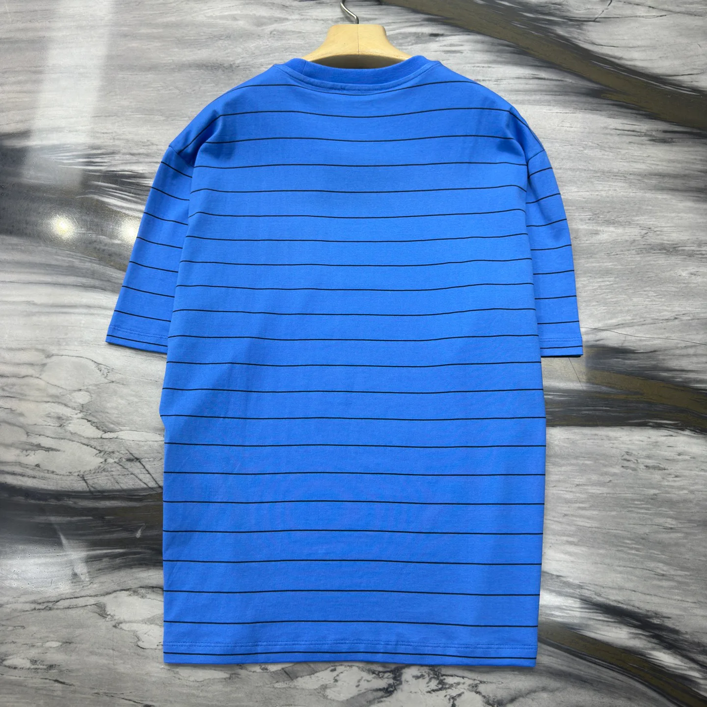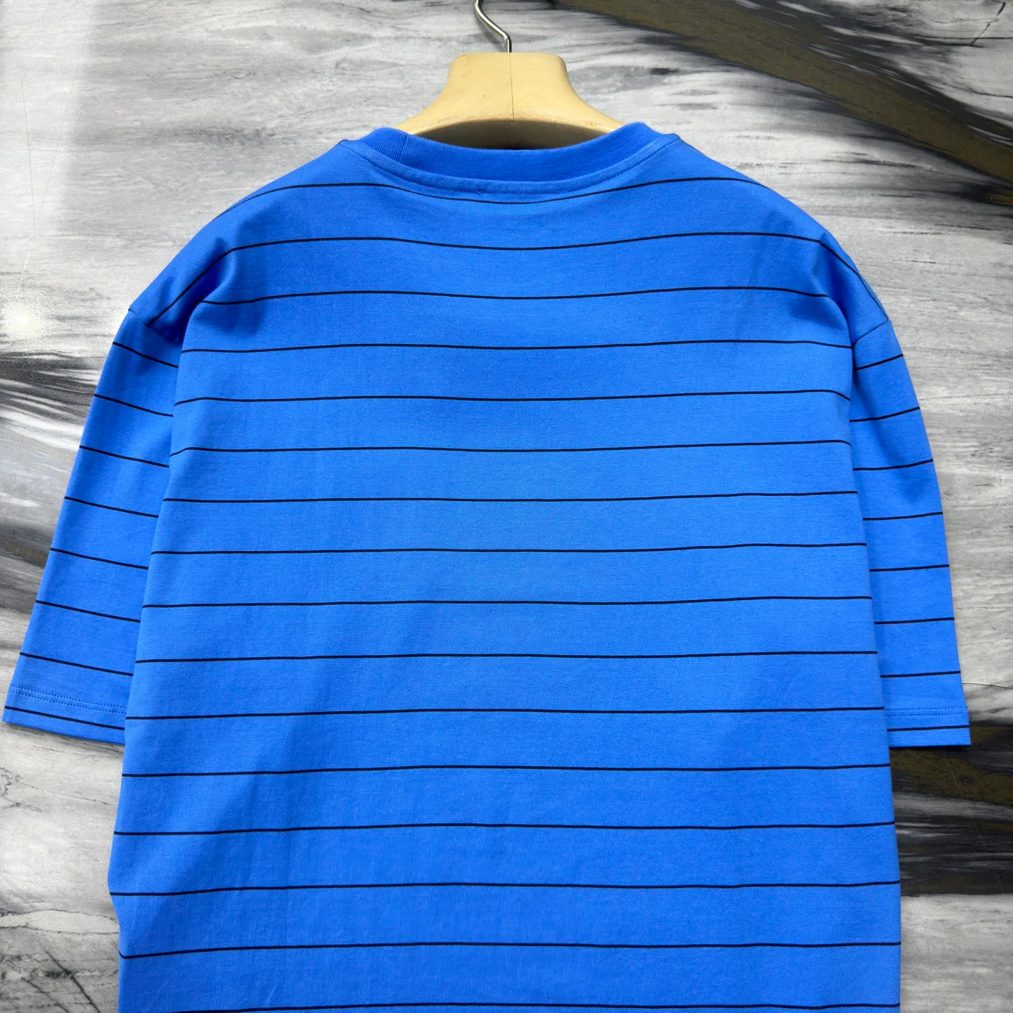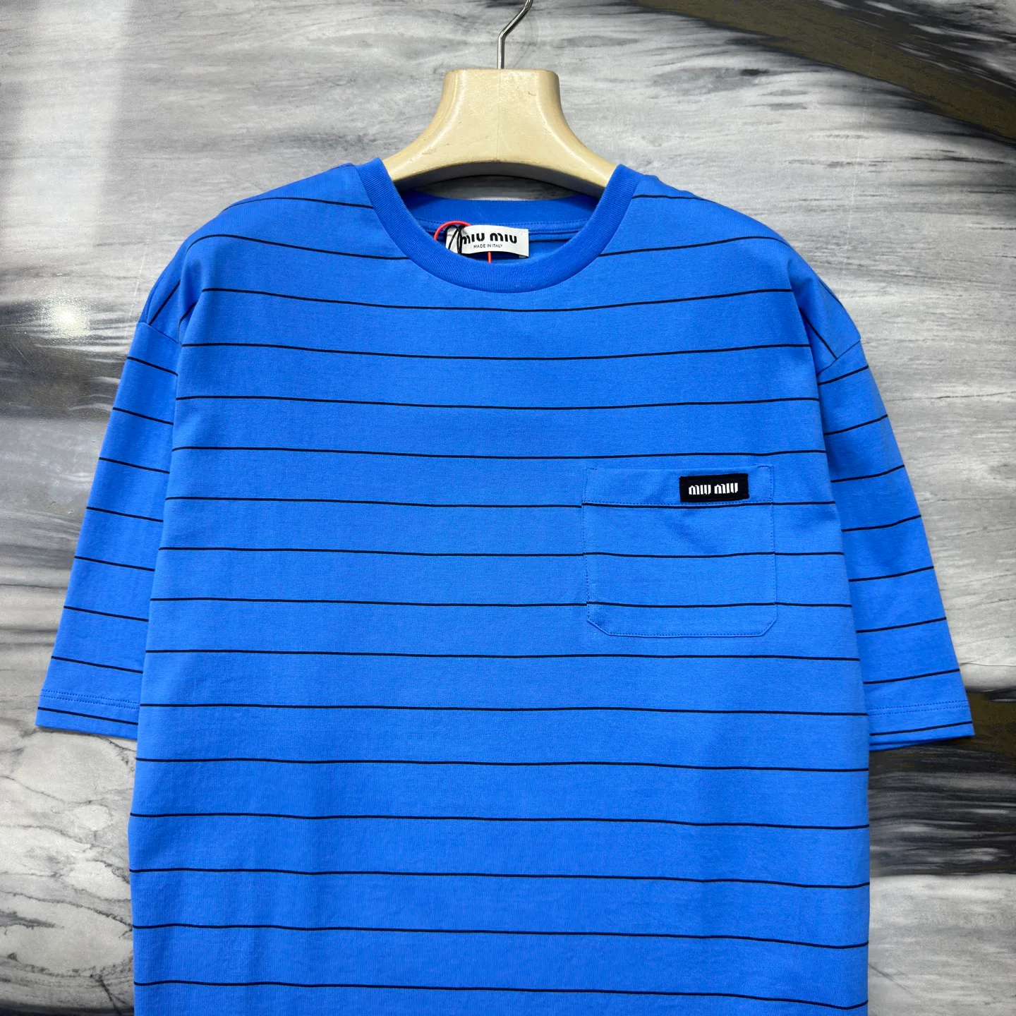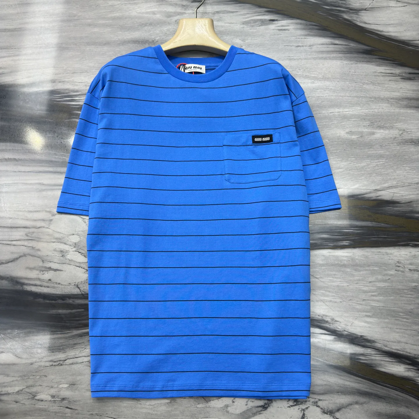 Футболка MIU MIU отличается классическим прямым кроем, который подходит для различных типов фигур. Основной акцент в дизайне сделан на полосатый принт и яркий синий цвет, что придаёт изделию свежий и стильный вид. Округлый вырез горловины обеспечивает комфорт при носке, а средняя плотность материала делает футболку приятной на ощупь, не позволяя ей быть слишком легкой или чрезмерно плотной.