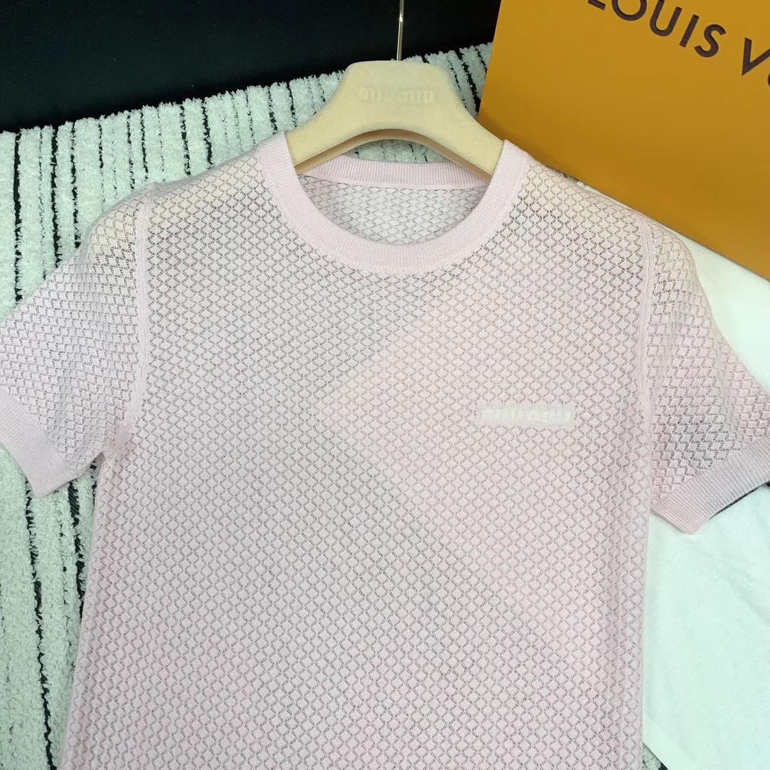 Футболка женская MIU MIU — новинка весна-лето с круглым вырезом, буквенным ажуром и узором в клетку, с короткими рукавами. Вязаная фактура обеспечивает комфорт при носке и приятную текстуру на ощупь. Дизайн сочетает буквы ажур и клетчатый узор, что придает изделию характер и современный вид. Подходит для весенне-летнего сезона. Информация о составе и уходе отсутствует в описании.