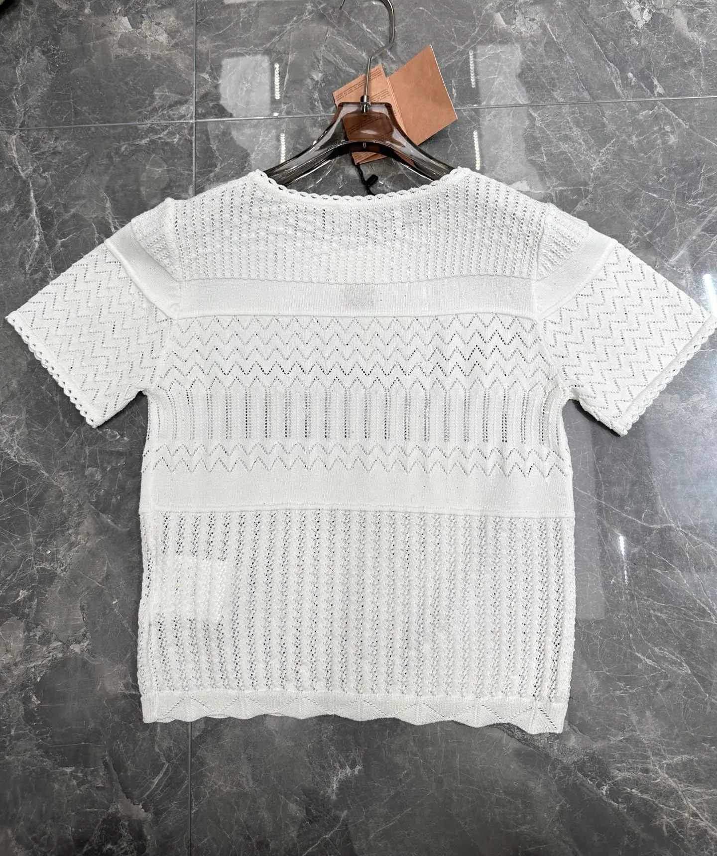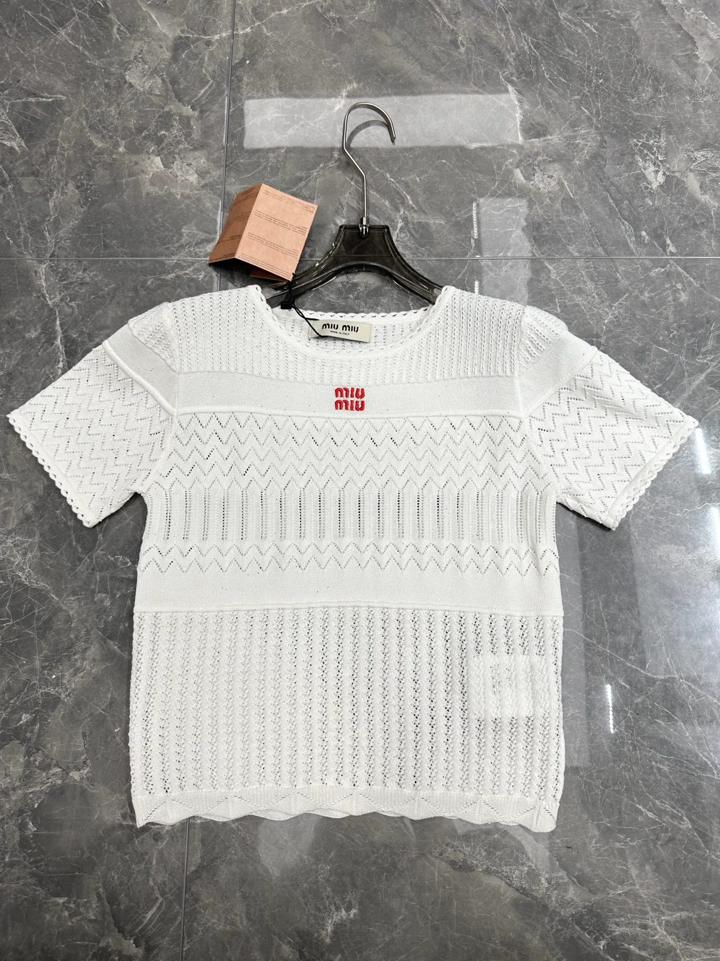 Эта модель дополнит гардероб и хорошо сочетается с разными стилями, позволяя создавать повседневные и более изысканные образы. Футболка от Miu Miu.