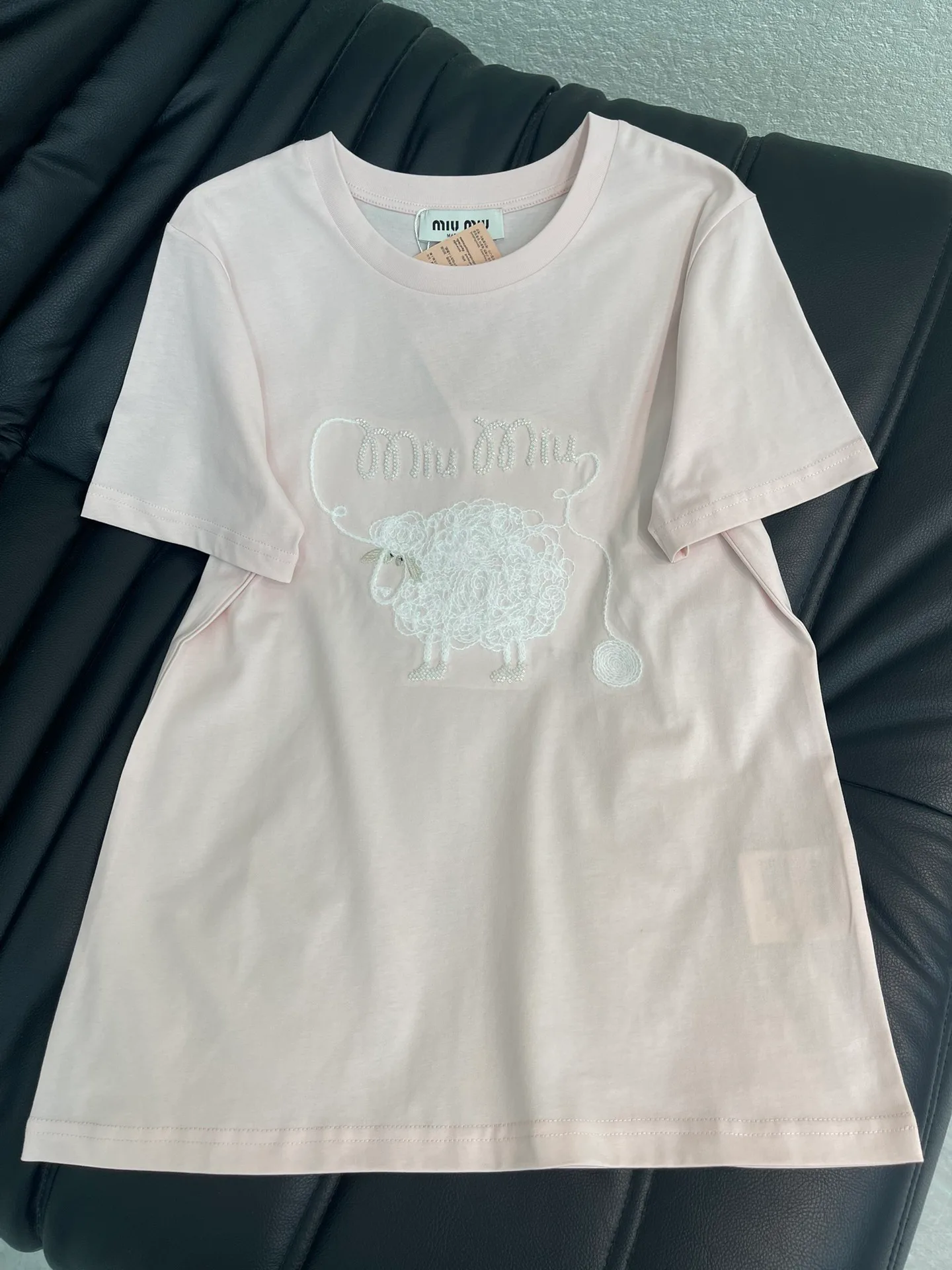 Футболки женские MIU MIU — модель из новой коллекции с круглым вырезом и коротким рукавом. Изделие выполнено из мерсеризованного хлопка, который отличается мягкостью, эластичностью и высокой воздухопроницаемостью. На груди расположена тонкая вышивка в виде букв и объемного ягненка, а также декоративные бусины. Облегающий крой подчеркивает силуэт, модель подходит для самостоятельного ношения или комбинации с другими вещами.