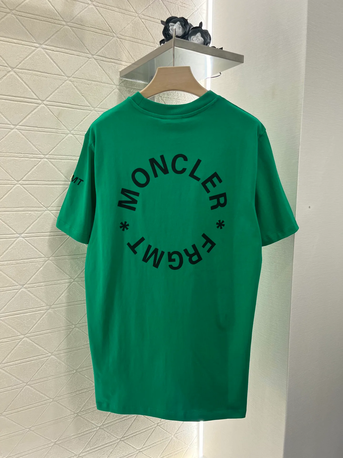 Футболка имеет свободный крой, который подчеркивает стиль бренда и создает эффект стройности благодаря драпировке ткани. Особое внимание уделено деталям: на груди расположена элегантная эмблема, а на спине — принт с надписью, выполненной с использованием современного печатного искусства. Также на внешней стороне рукава имеется вышитая эмблема, что придаёт футболке стильный и утонченный вид.