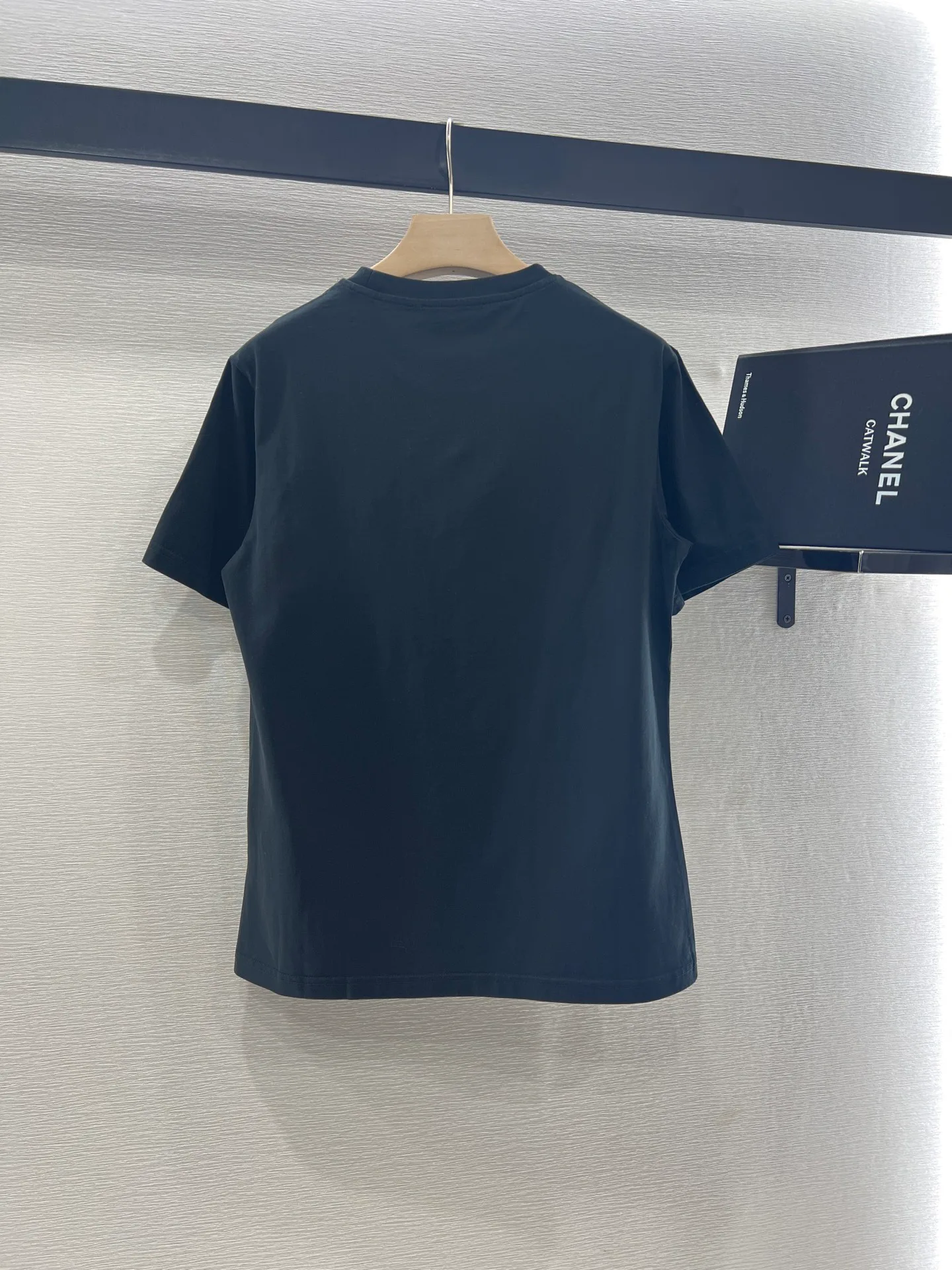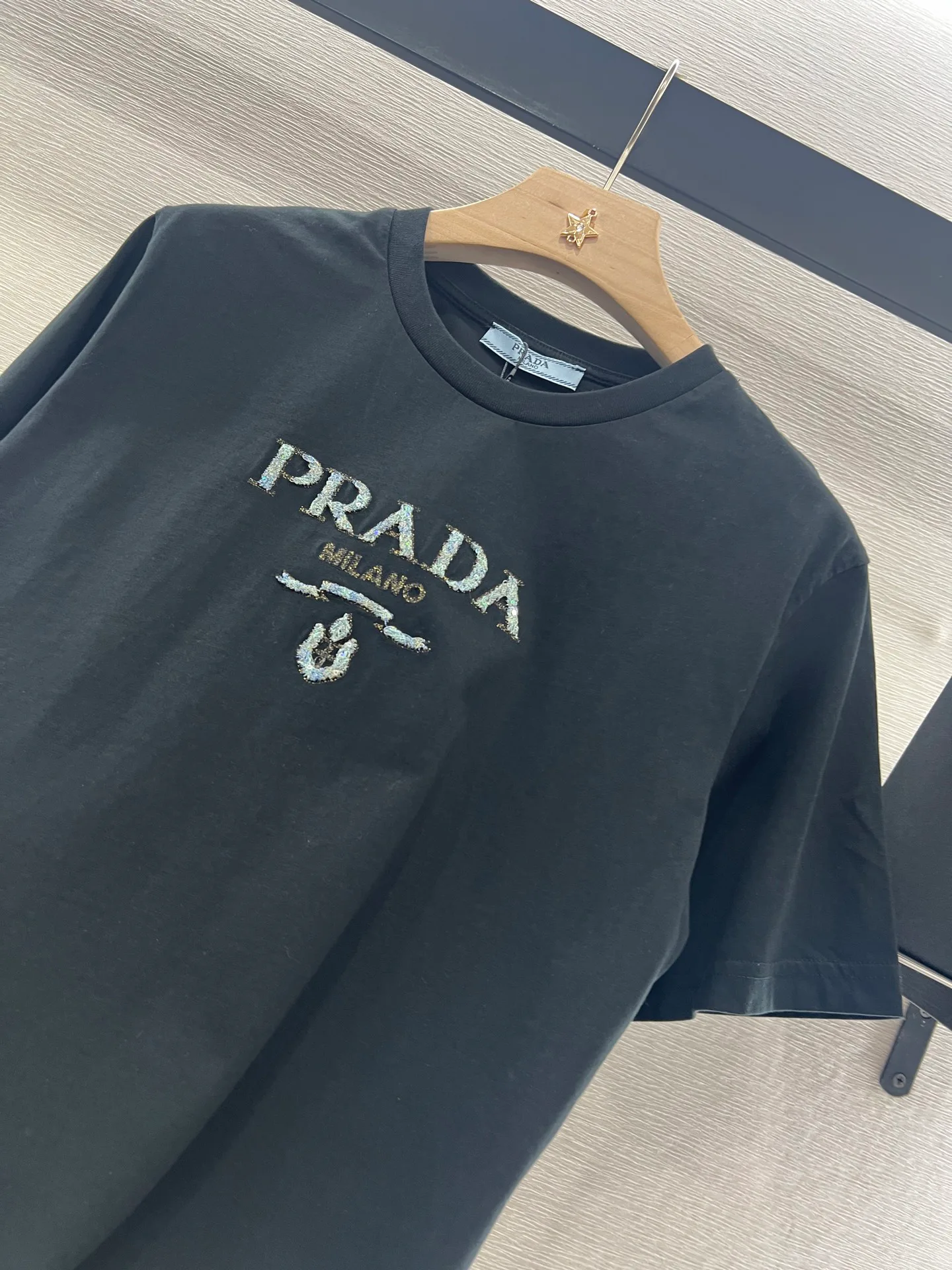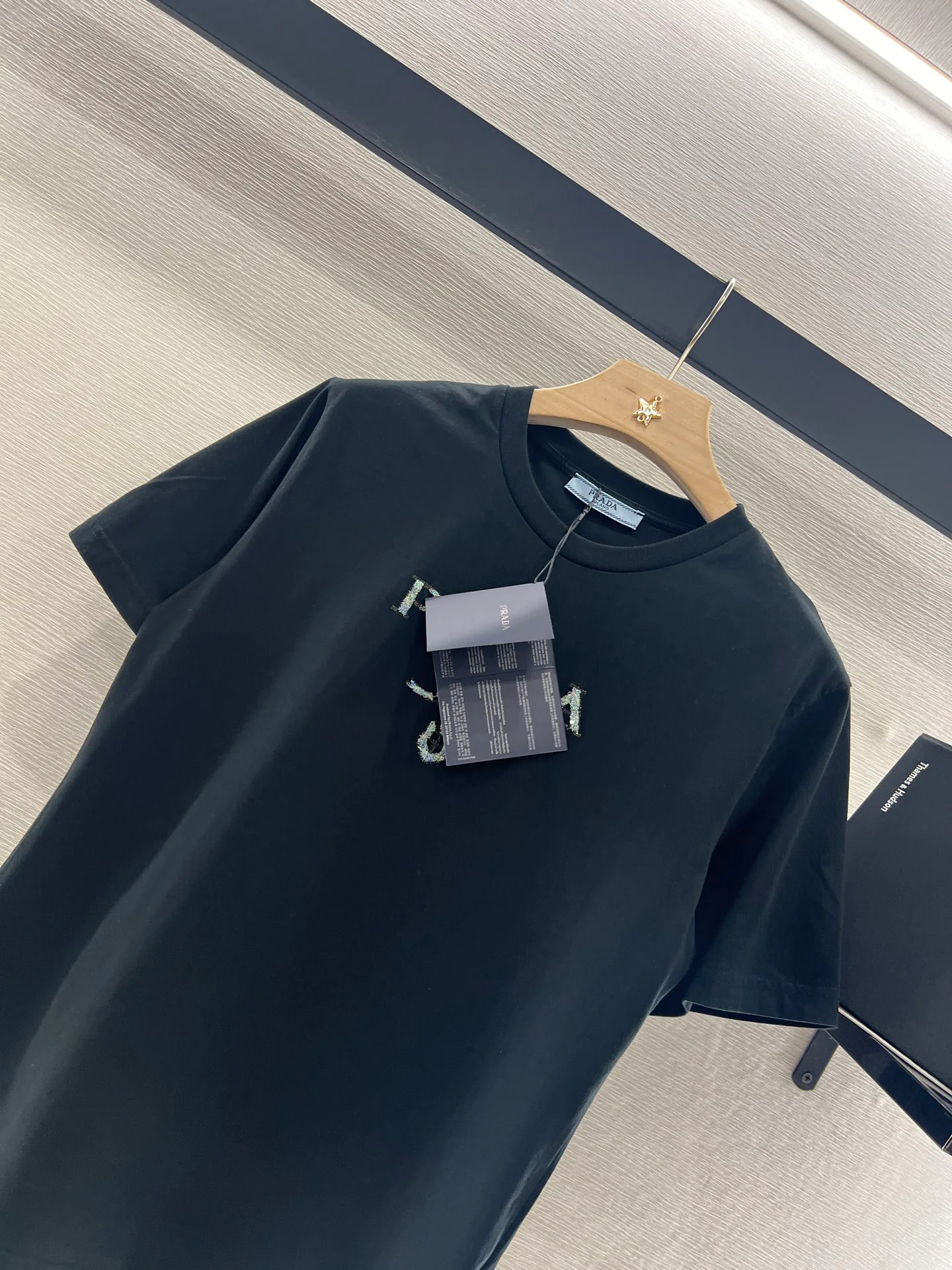 Футболка имеет широкий крой и короткие рукава, что делает ее универсальным вариантом для повседневной одежды. Ткань слегка эластичная, что создает эффект визуального похудения и подчеркивает фигуру. В центре грудной части расположена изящная вышивка в виде щита с логотипом бренда, оформленная перламутровыми пайетками, придающими уникальность и очарование.